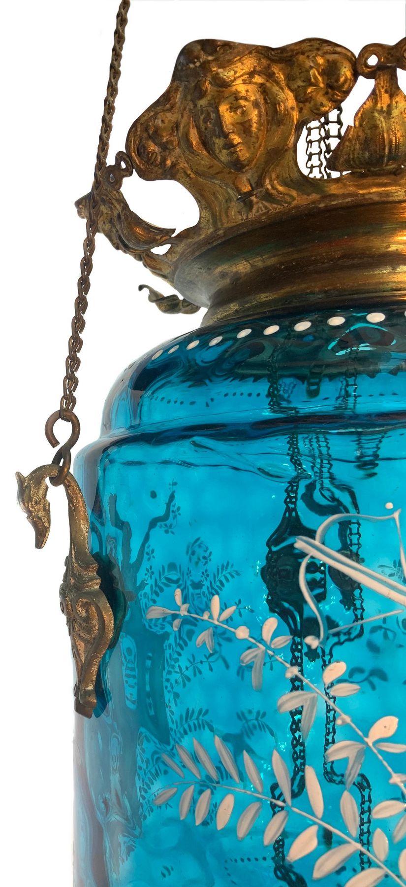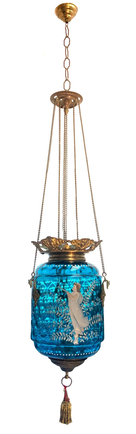 Lampada a sospensione in vetro azzurro decorata con donne, fine XIX secolo. Dipinta a mano, con riporti in ottone dorato. H cm 45, con catena regolabile fino a 1,20 cm.