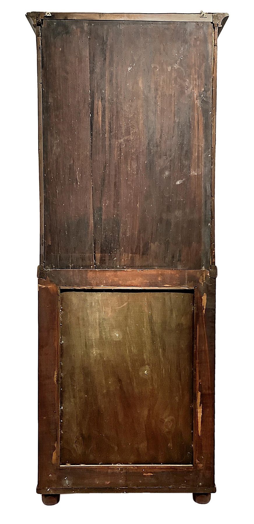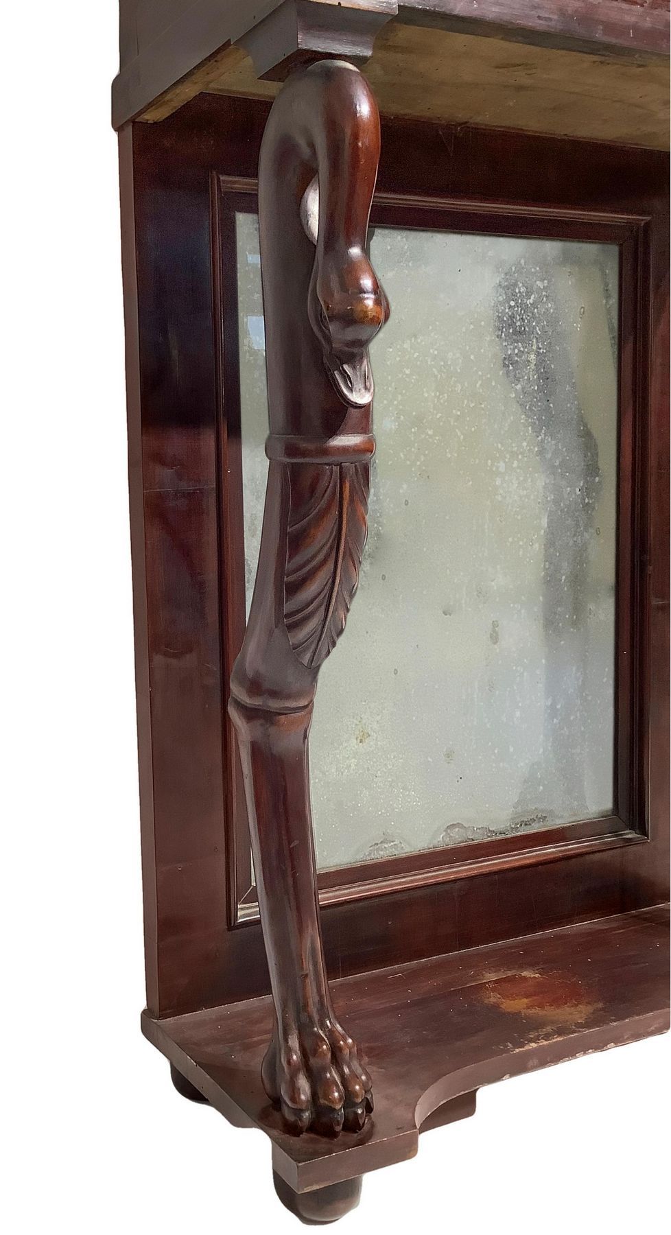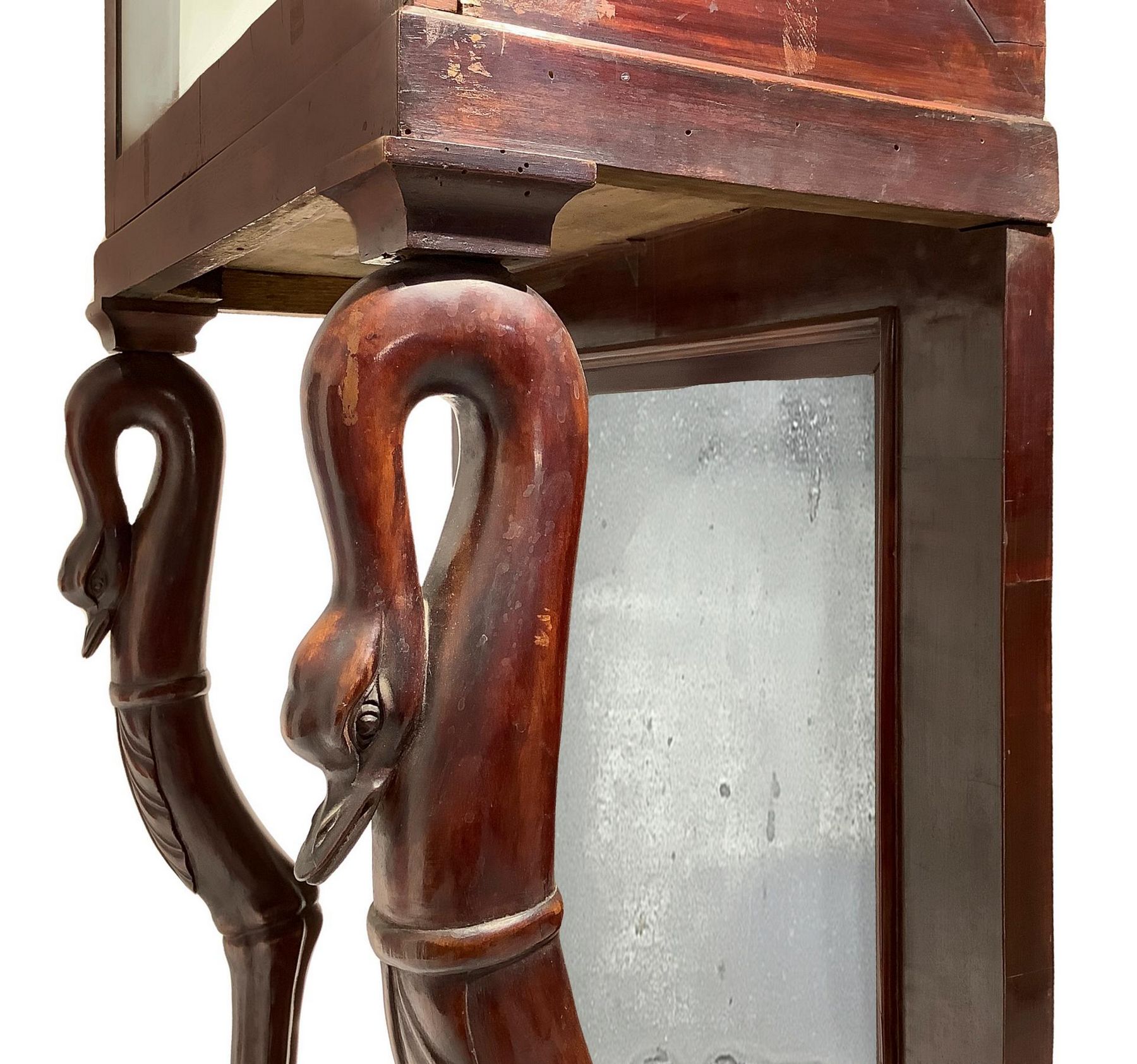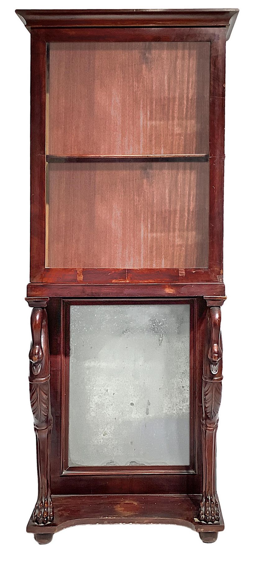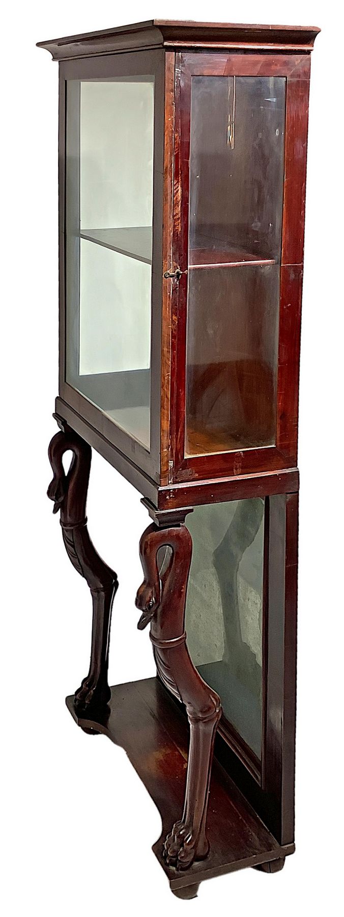 Vetrina in legno di mogano. Parte superiore a vetri con mensola al centro di legno. Parte bassa con cigni a sostegno in massello di mogano e specchio al mercurio. Primi anni del 800. Sicilia. H cm 160. Larghezza cm 60. Profondità cm 30.