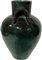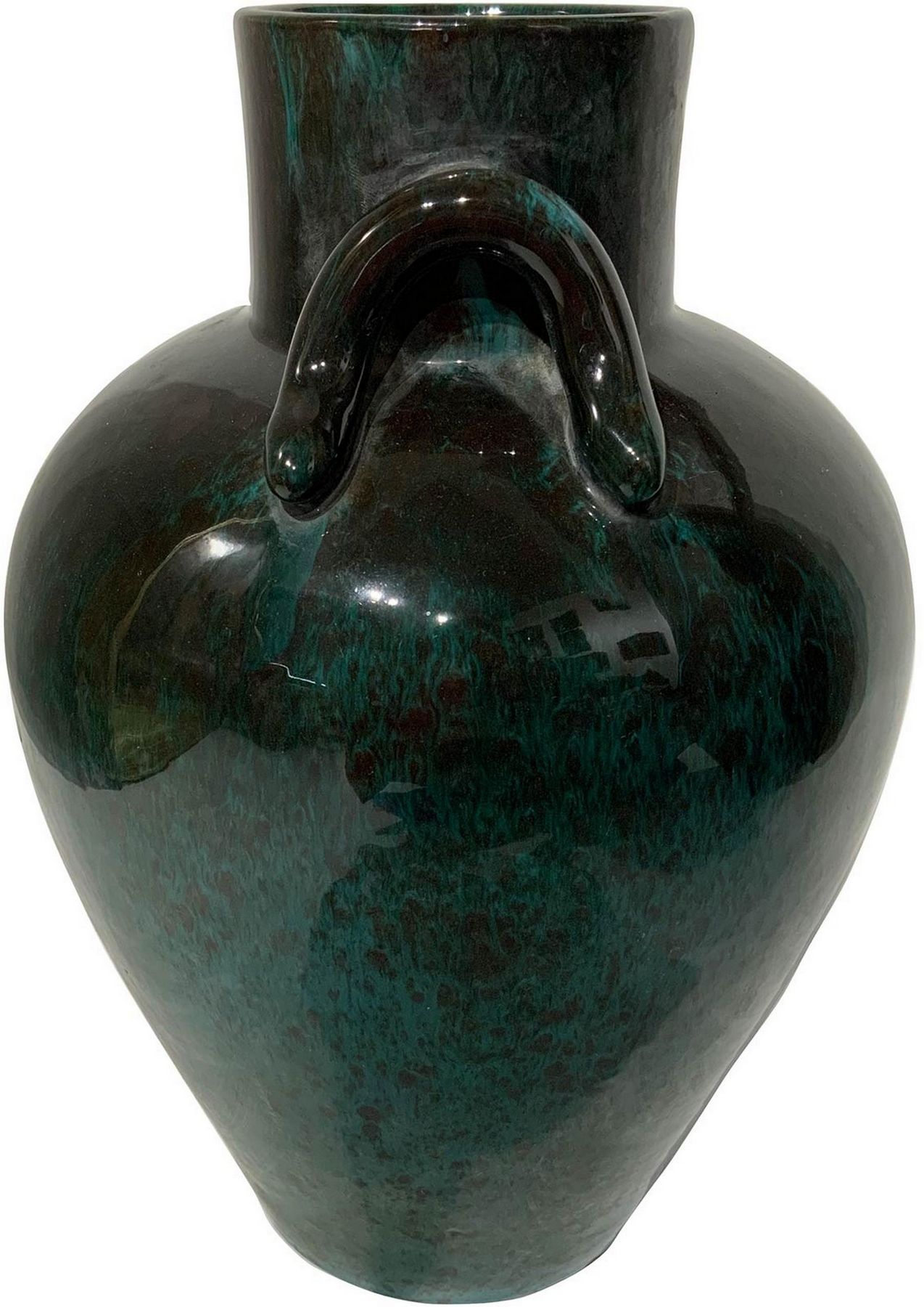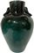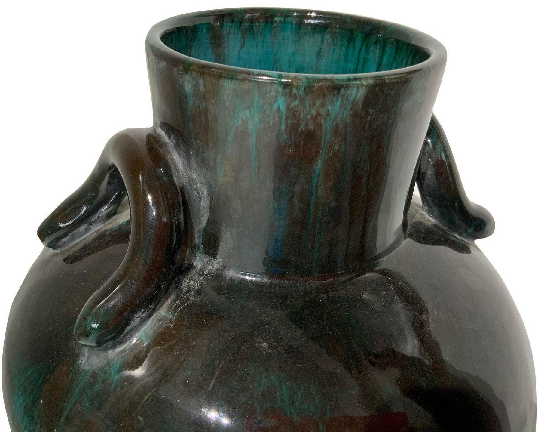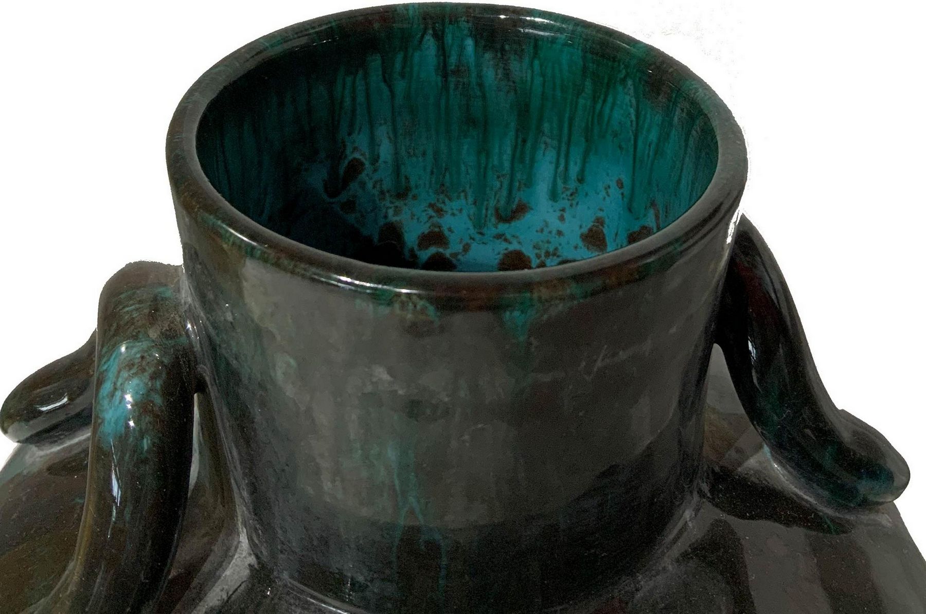 Produzione italiana attribuito a Zaccagnini. Vaso in ceramica a forma di balaustro alto collo e piccole anse applicate, decoro a colaggio nei toni del nero e del petrolio. XX secolo. H cm 33