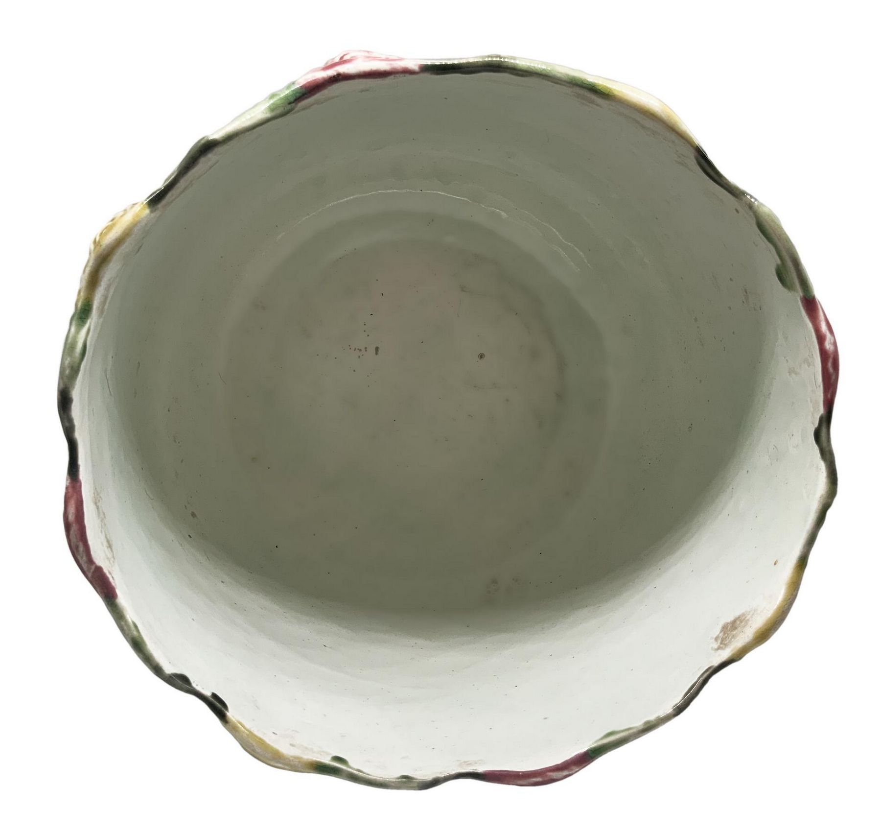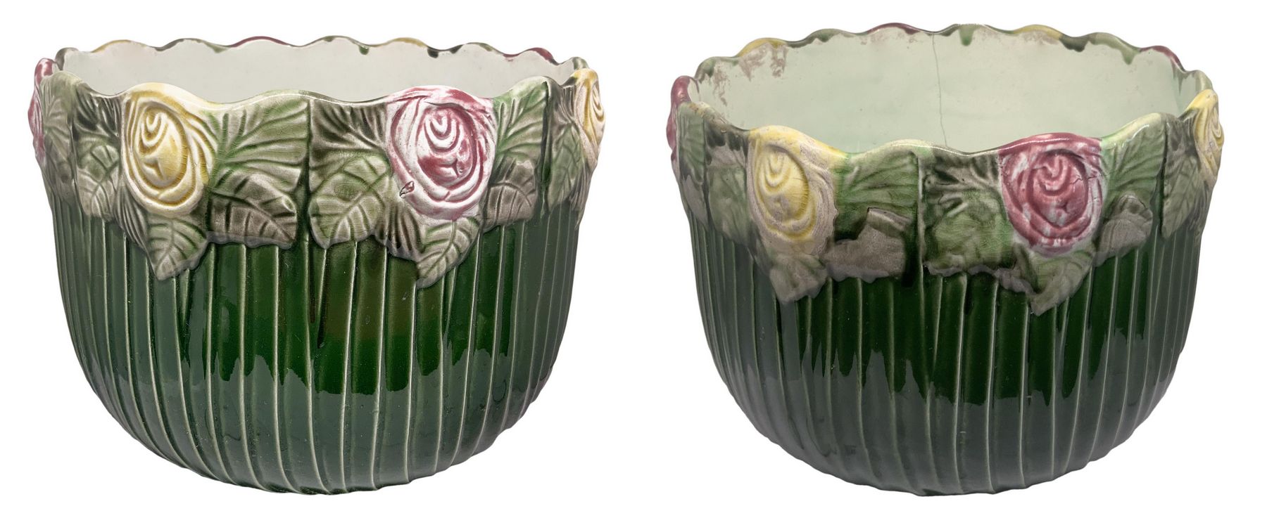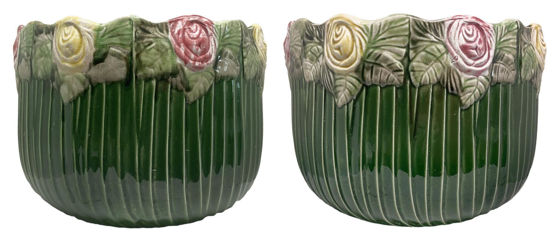Coppia di cachepot in porcellana, lavorazione barbotine in colore verde, decoro floreale lungo il bordo, periodo Liberty, primi XX secolo. H cm 19. Diametro cm 24. Filatura su un vaso.