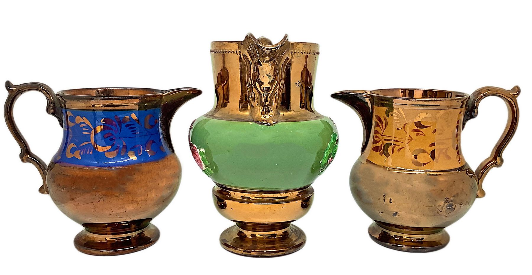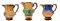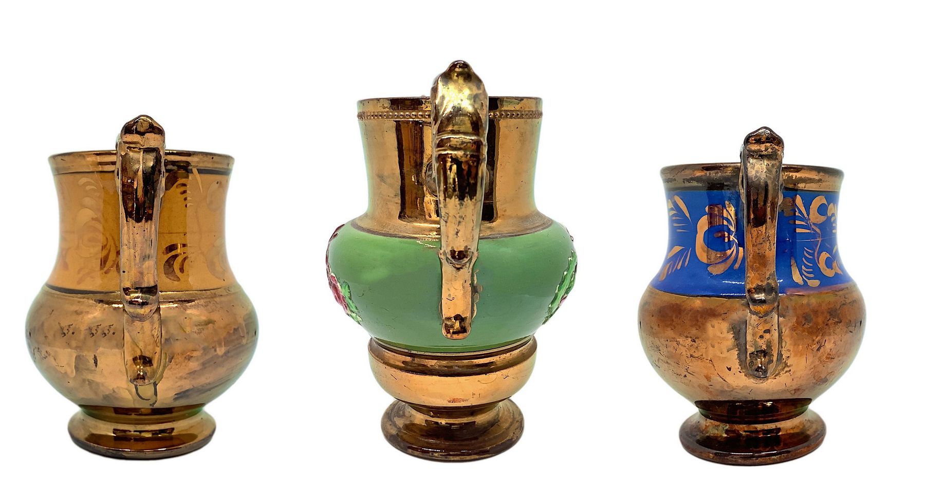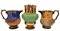 Gruppo di tre boccali in maiolica policroma. Inizi XX secolo, Malta. H cm 15,6. Bocca cm 8. H cm 11,7. Bocca cm 7,5.