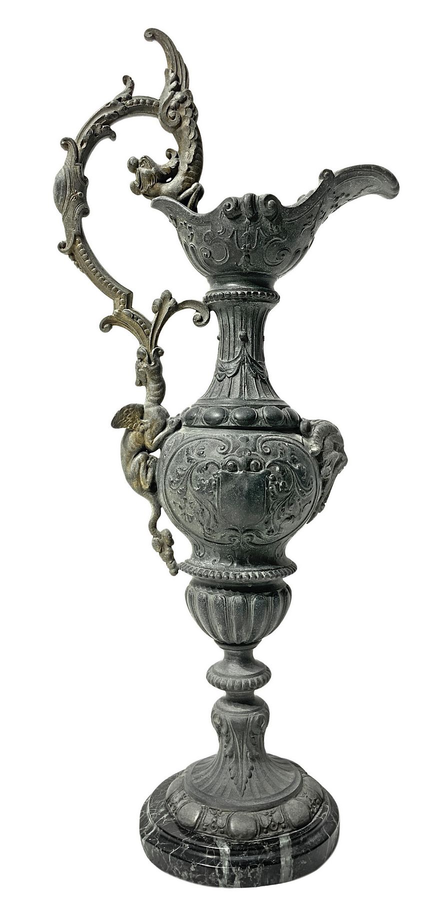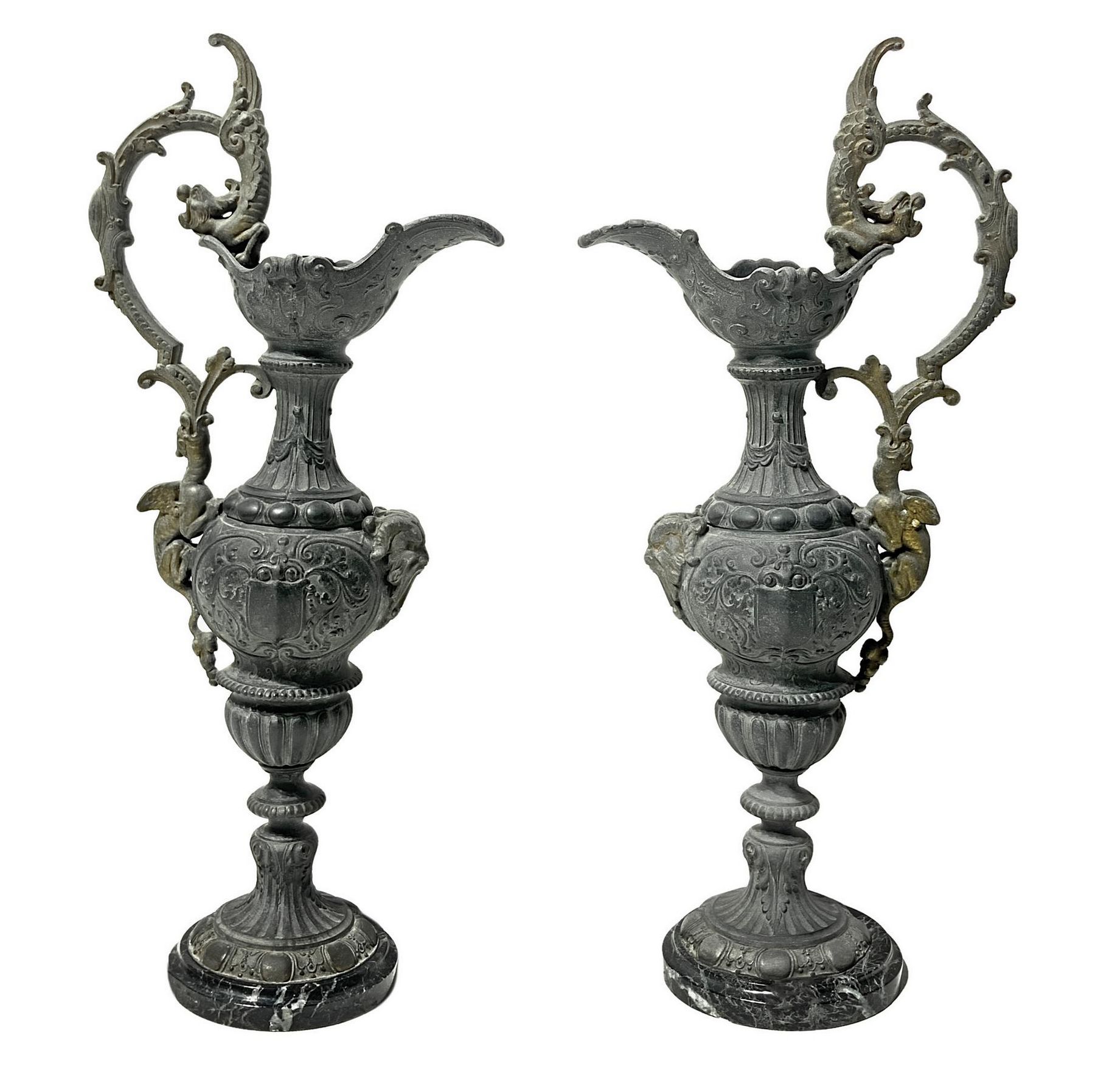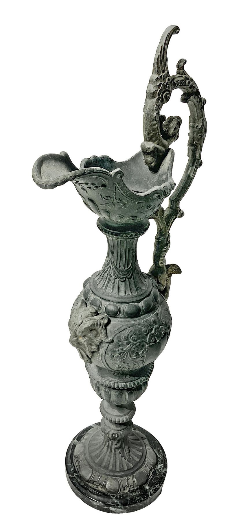 Coppia di anfore in bronzo con base in marmo, fine XIX secolo. H cm 50,5....