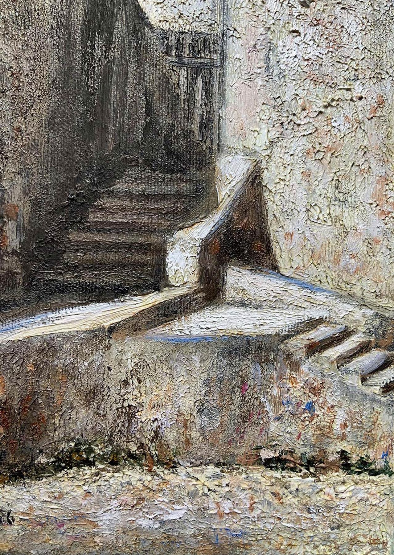Dipinto ad olio su tela raffigurante scorcio di paese, De Lisi. Cm 29x18,5, olio su tela. Firmato e datato 1986 in basso a sinistra.