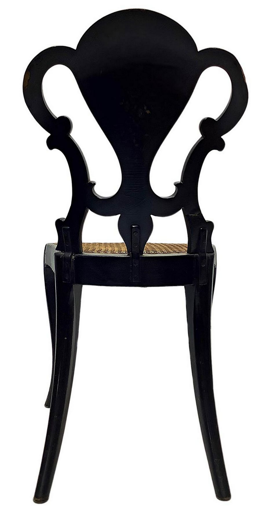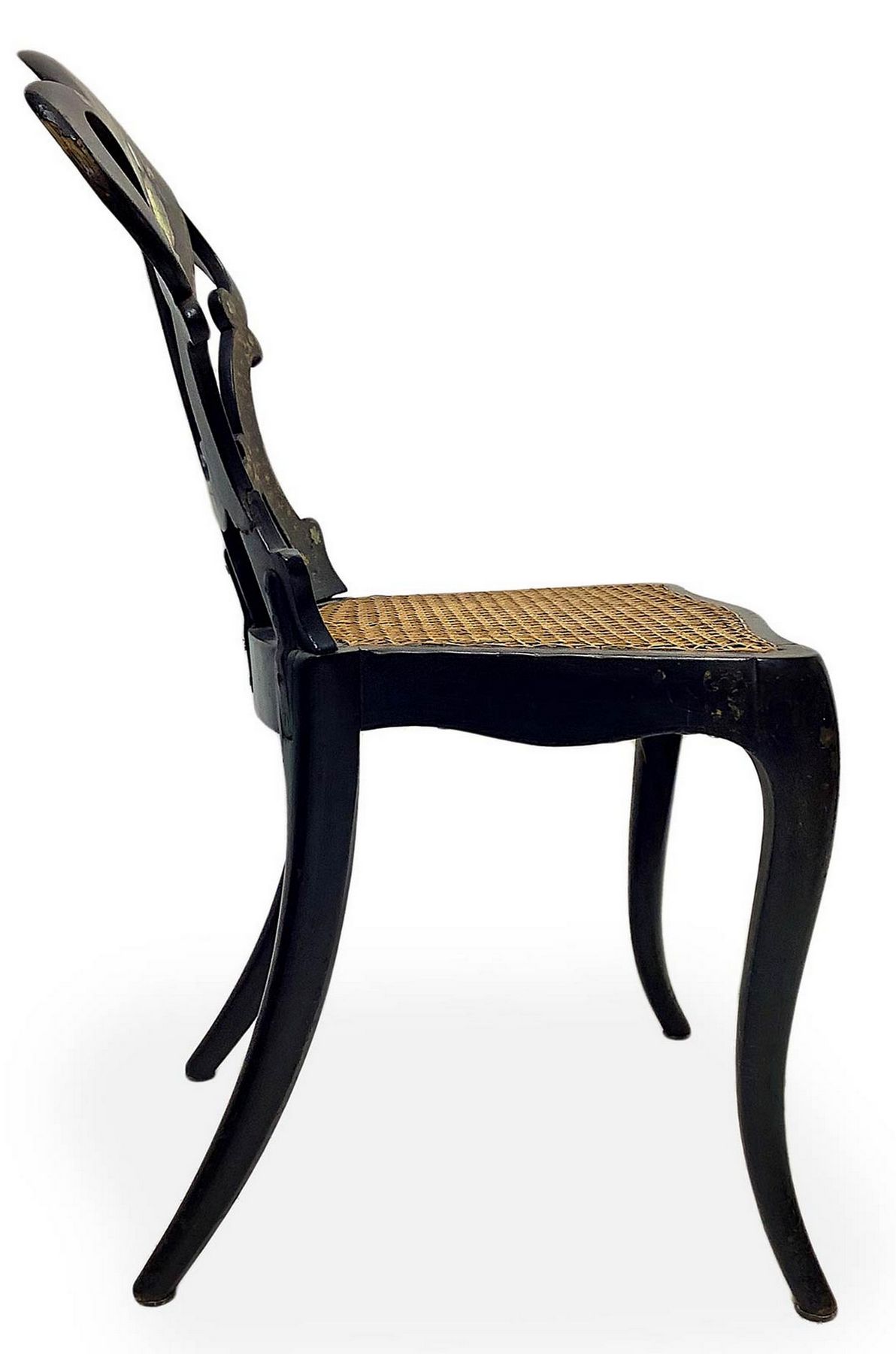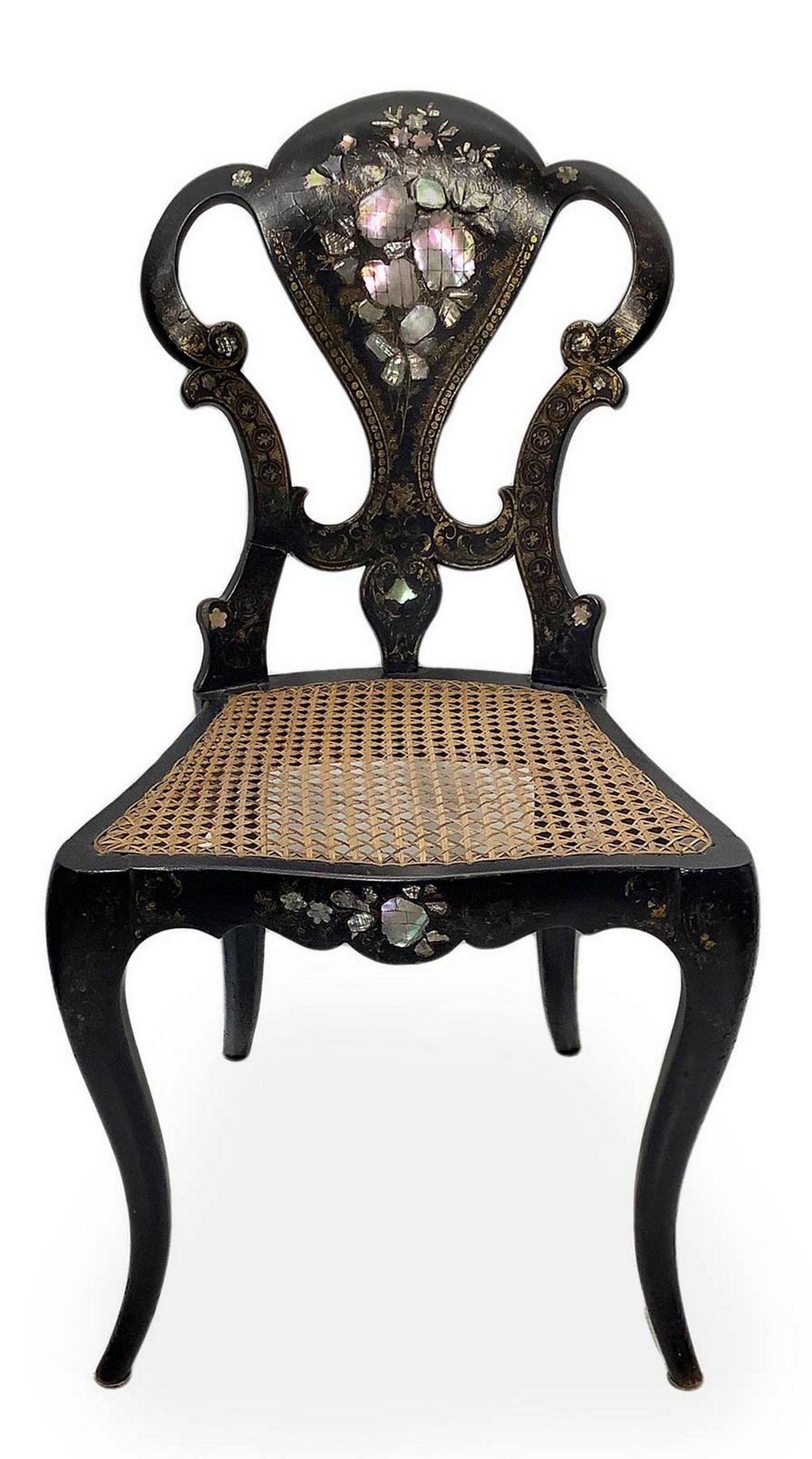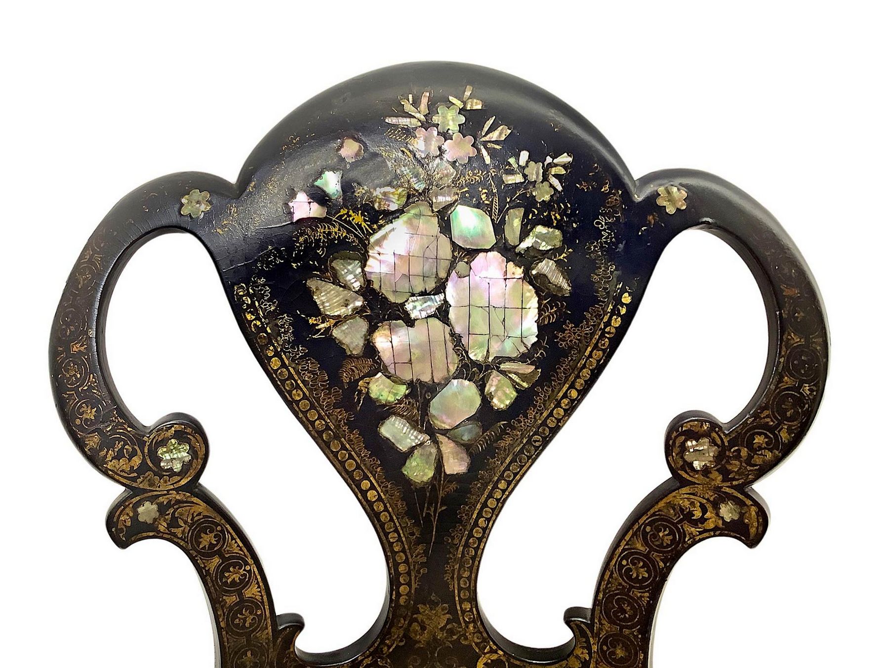 Sedia vittoriana papier -mach, con decorazioni dorate e intarsi in madreperla, Jennens e Bettridge, Londra, Metà XIX secolo. Cm 79x42 (larghezza max).