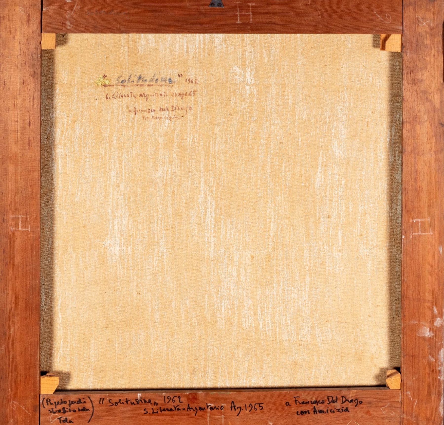 Al verso sulla tela e sul telaio il titolo, la data e una dedica ad personam