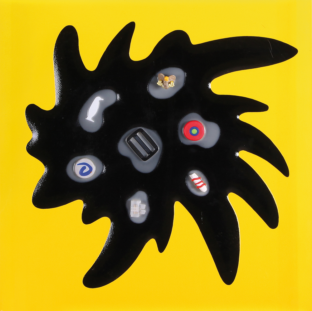 RENZO NUCARA Crema 1948 Bang 10-37, 2011 resine, oggetti, colore serigrafico, carta, legno su faesite cm. 50x50, firma, archivio dell'artista e descrizione dell'opera al retro, dichiarazione d'autenticità e archivio dell'artista su foto, dichiarazione d'autenticità e provenienza della Galleria Sant'Agostino (TO) su foto, entro teca in plexiglass.