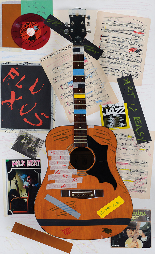 GIUSEPPE CHIARI Firenze 26/09/1926 - Firenze 10/05/2007 Senza titolo strumento musicale, tecnica mista e collage su tela cm. 120x70, firma sulla chitarra in basso a destra, opera registrata presso l'Archivio Giuseppe e Victoria Chiari come da certificato di autenticità su foto, opera priva di cornice.