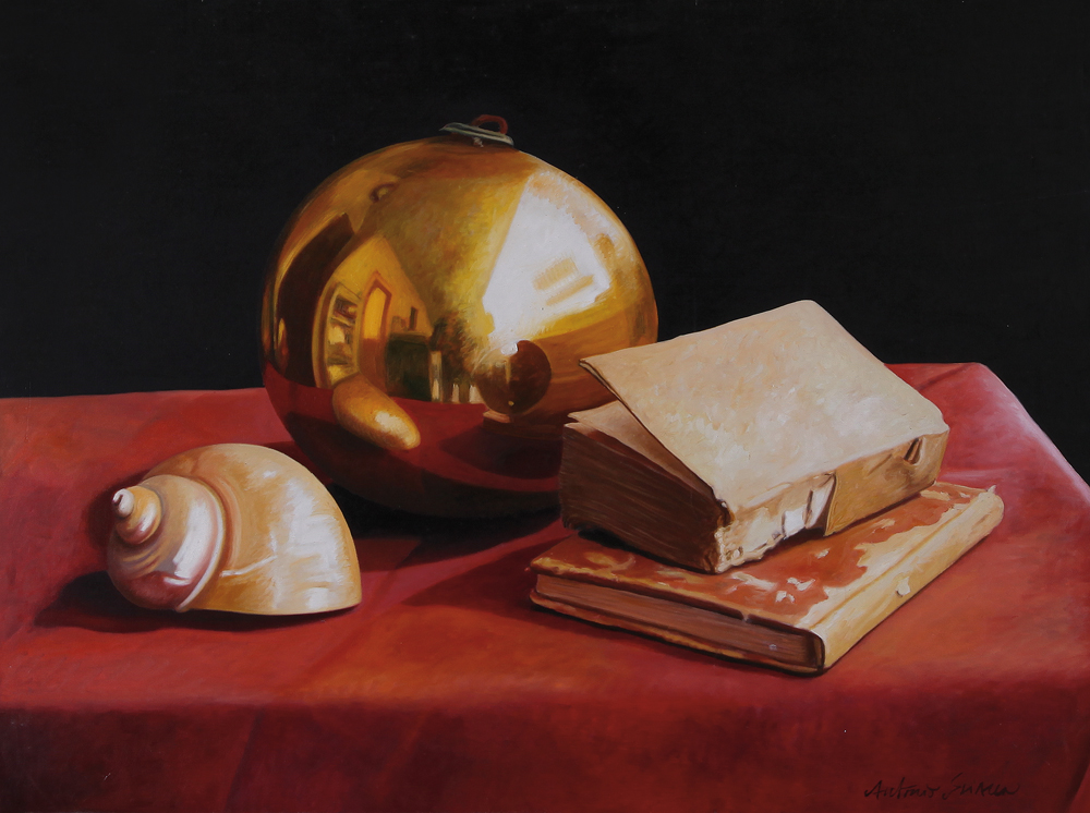 ANTONIO SCIACCA Catania 13/05/1957 Oggetti sul tavolo olio su tela cm. 60x80, firma in basso a destra.
