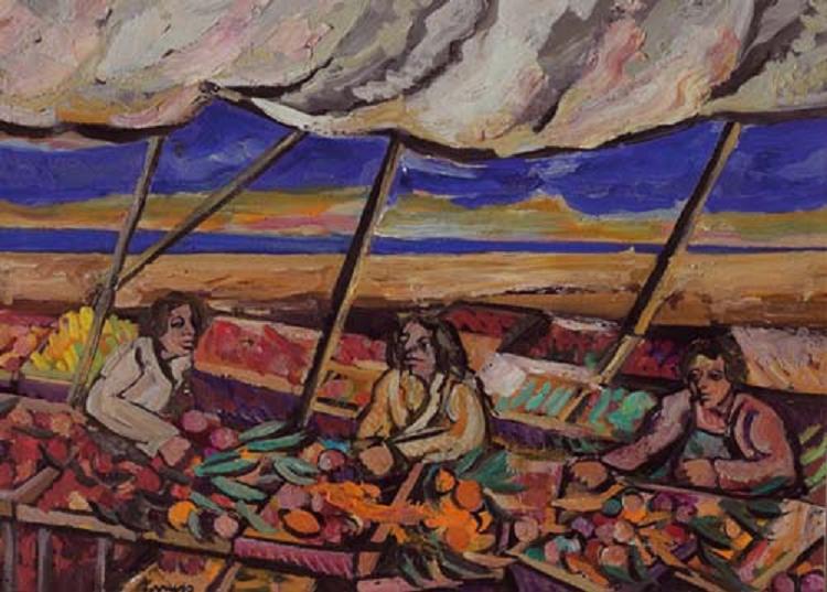 SAVERIO TERRUSO Monreale (Pa) 11/01/1939 - Milano 03/03/2003  Mercato, anni '90 olio su tela cm. 50x70, firma in basso a sinistra, titolo, firma e autentica dell'artista al retro, autentica e archivio numero AR69D2 dell'artista su foto, pubblicato su "Saverio Terruso, Catalogo Generale delle Opere", Primo Volume, a cura di Cristiano Ragni, DZ Nuovo Segno Editore, repertorio 242, pagina 113.