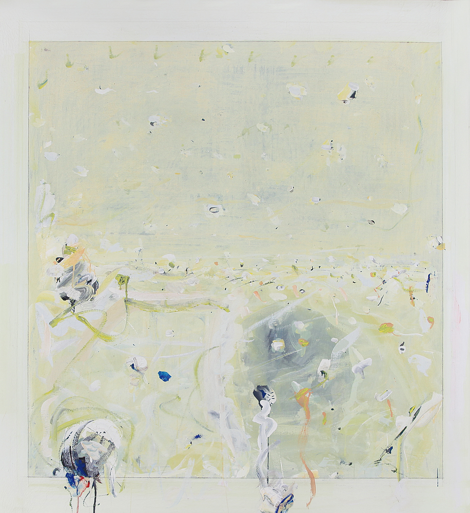 GIANCARLO OSSOLA Milano 1935 Esterno popolato 2, 1973 tecnica mista su tela cm. 120x110, firma, titolo, anno e tecnica al retro.