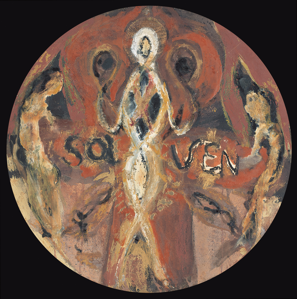 BRUNO CECCOBELLI Montecastello Vibio (Pg) 02/09/1952 Sol vent, 1987 olio e foglia oro su cartone pressato circolare diametro cm. 50, firma, titolo, anno ed etichetta della Jack Shainman Gallery (New York) al retro, dichiarazione d'autenticità e archivio numero PA45X dell'artista su foto, opera priva di cornice.