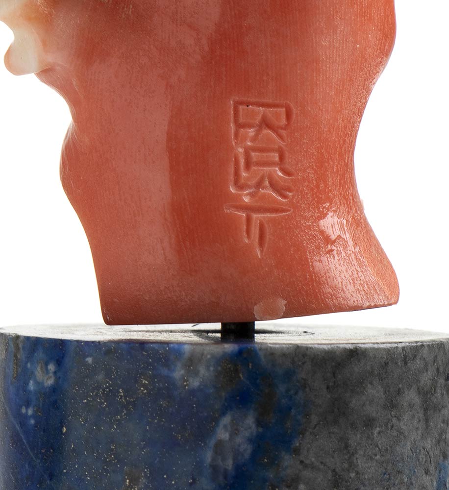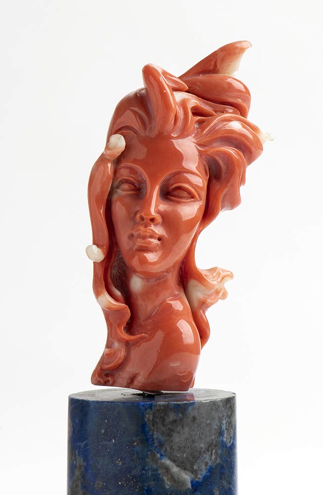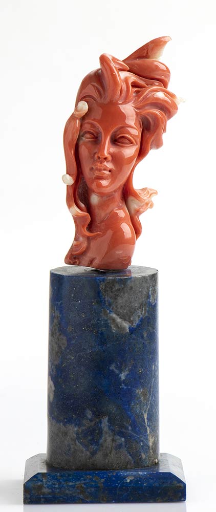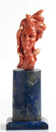 Scultura in corallo Momo o Cerasuolo (Corallium Elatius) raffigurante un volto femminile posto sopra una base cilindrica in lapislazzuli. Firmata "Parlati", Carlo Parlati, Torre del Greco '80 / '90. Dimensioni senza base 4 x 4,5 cm, altezza 7 cm, altezza totale 13,5 cm. Peso scultura 56 gr, peso totale 242,8 gr. Stato di conservazione: *****ottimo. Certificato di Autenticità Ce.S.Ar.