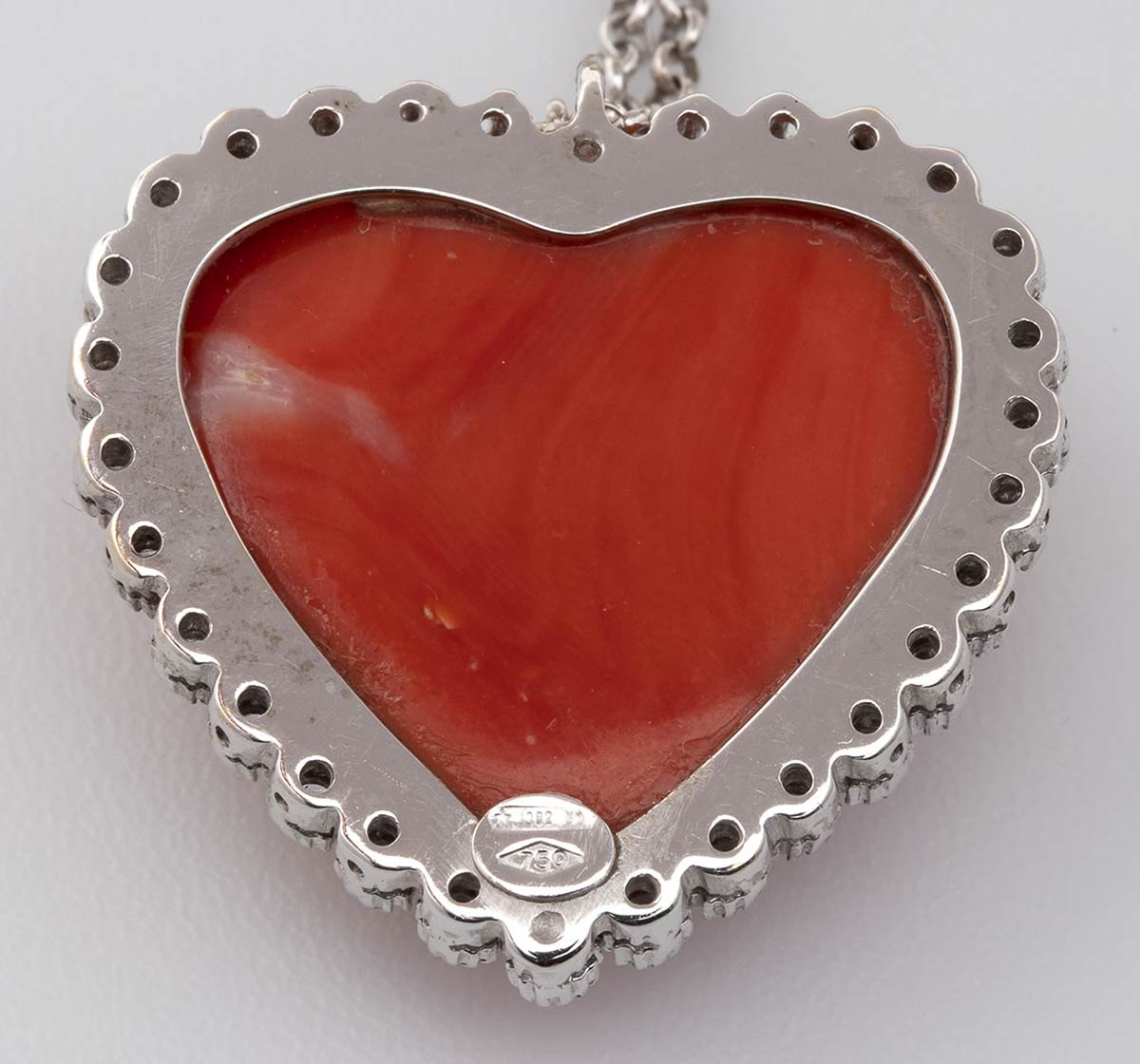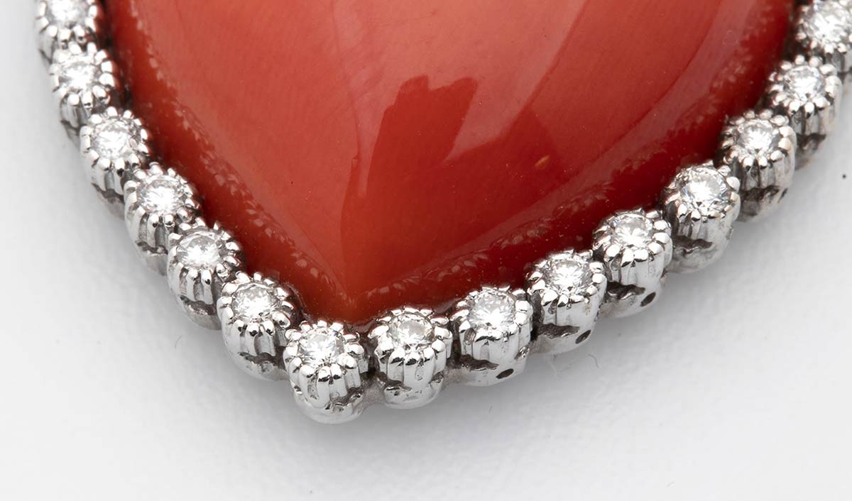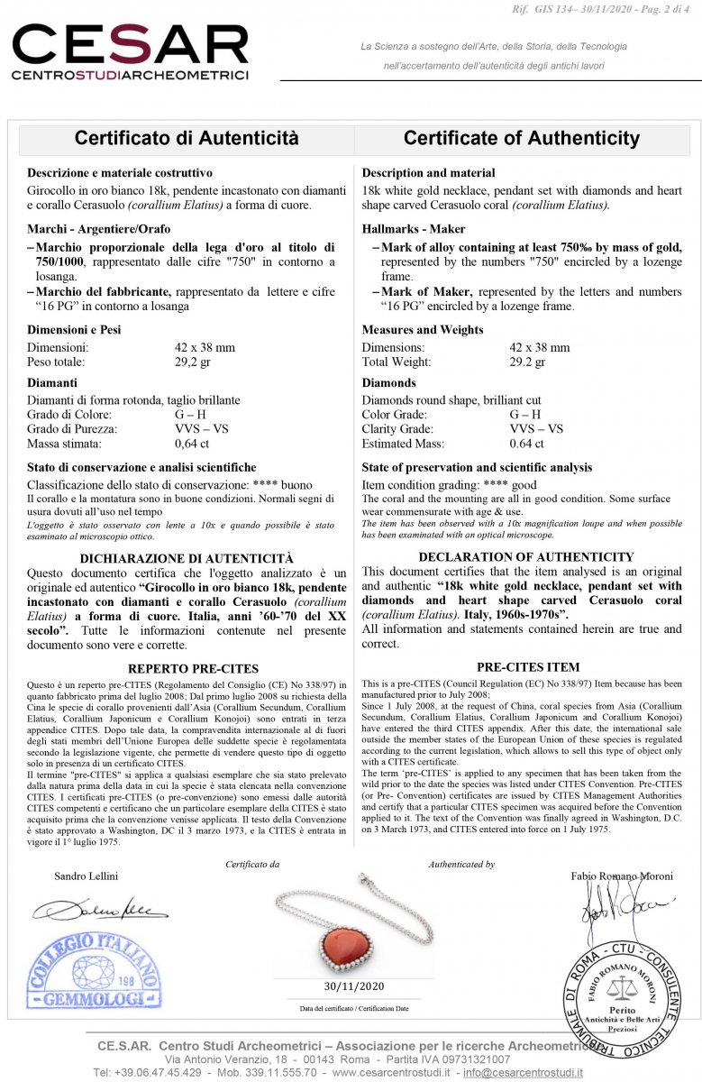 In oro bianco incastonato con corallo Cerasuolo (Corallium Elatius)a cuore contornato da diamanti taglio brillante 0,64 ct G-H VVS-VS. Punzonato "750", Italia dopo il 1968 e fabbricante "1002 NA". Dimensioni pendente 27 x 27 mm, lunghezza 44 cm. Peso 16,8 gr. Stato di conservazione: ****buono. Certificato di Autenticità Ce.S.Ar.