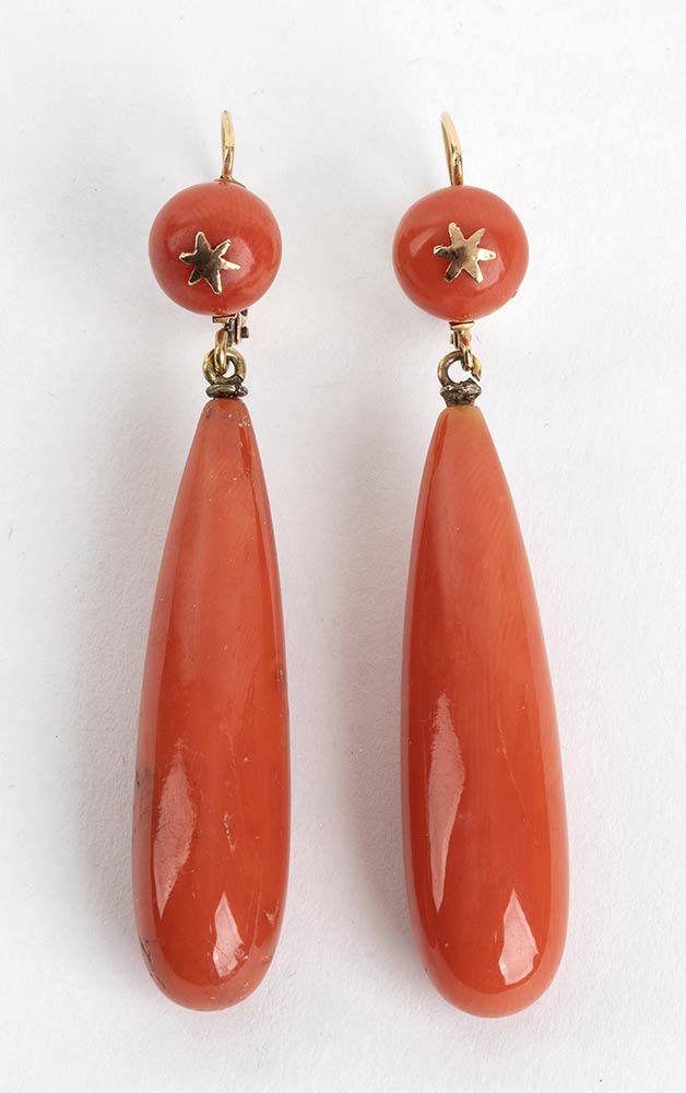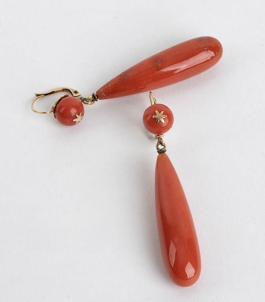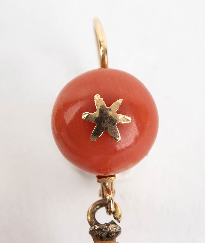 Paio di orecchini pendenti con sfere e gocce in corallo Mediterraneo (Corallium Rubrum), montaggio in oro basso titolo. Lunghezza 53 cm. Diametro sfera corallo 10 mm. Lunghezza goccia 37 mm. Peso totale 14,1 gr. Stato conservazione : *****ottimo.