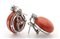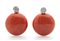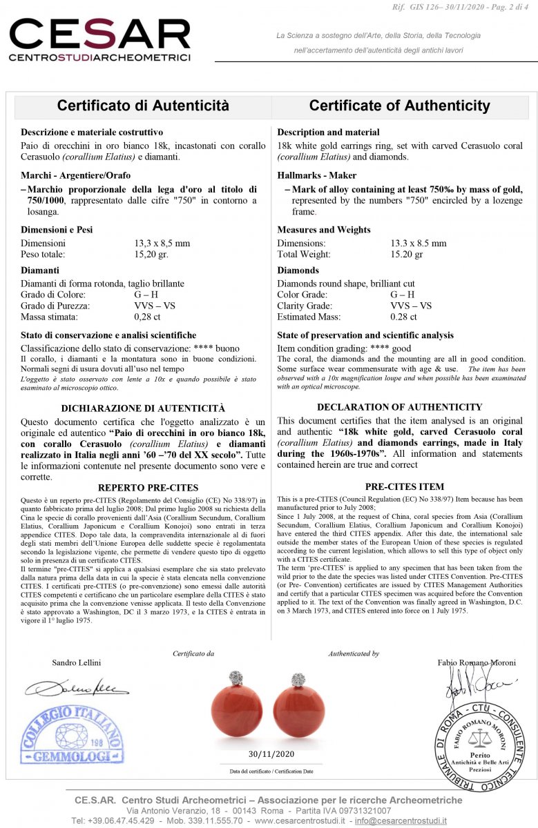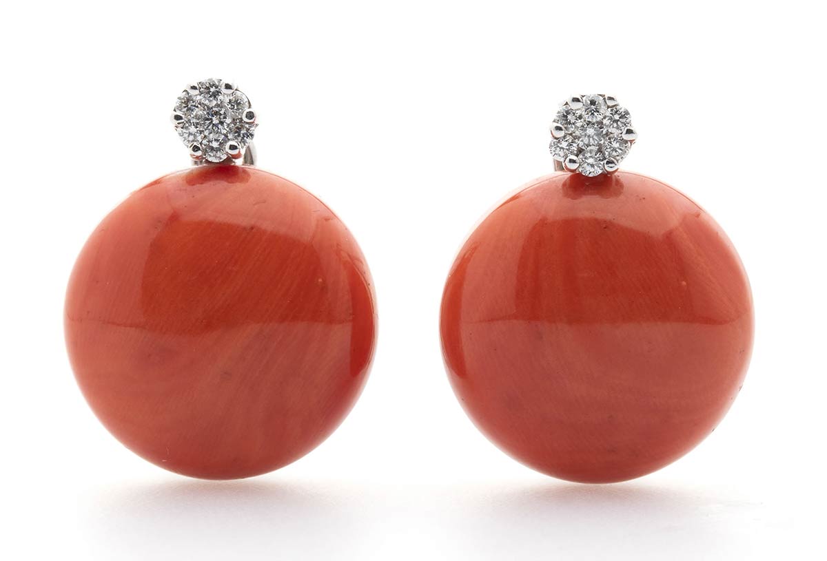 Orecchini in oro bianco, brillanti e corallo Cerasuolo (Corallium Elatius). Punzonati "750", Italia dopo il 1968. Brillanti taglio rotondo 0,28 ct G-H VS. Dimensioni 13,3 x 8,5 mm. Peso totale 15,2 gr. Stato di conservazione: ****buono. Certificato di Autenticità Ce.S.Ar.