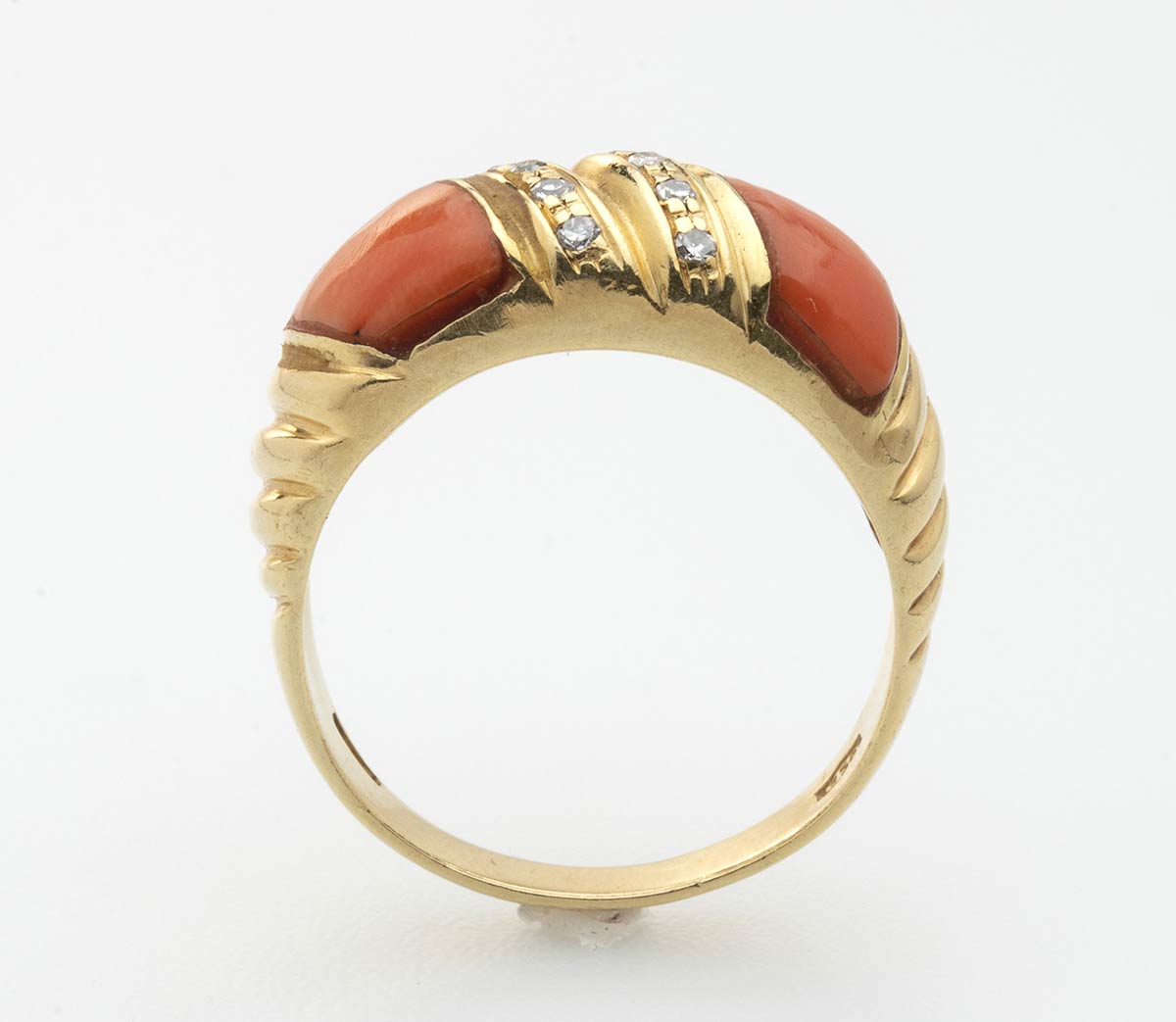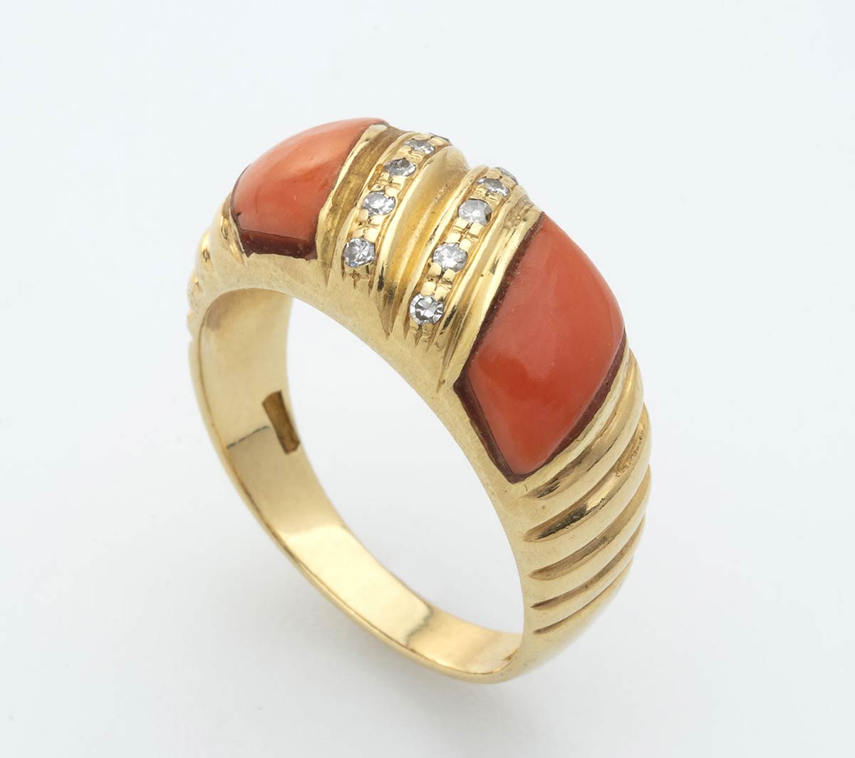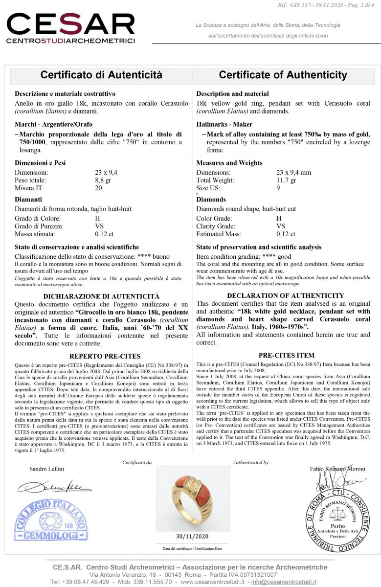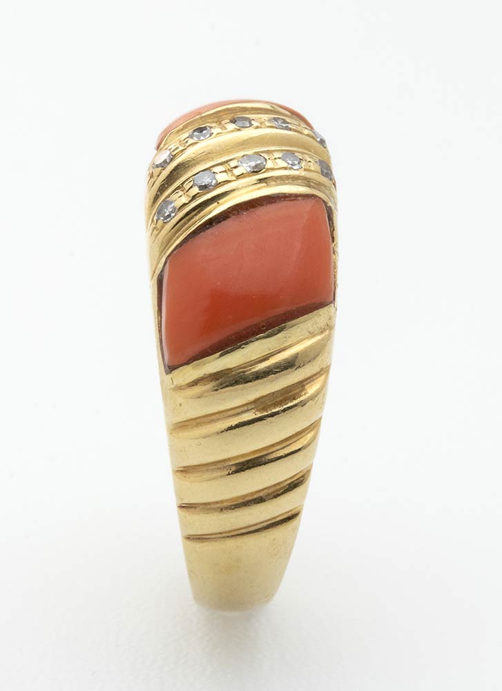 In oro giallo, corallo Cerasuolo (Corallium Elatius) e diamanti 0,12 ct H VS. Punzonato "750". Dimensioni fronte 23 x 9,4 mm. Peso 8,8 gr. Misura anello IT 20. Stato di conservazione: ****buono. Certificato di Autenticità Ce.S.Ar.