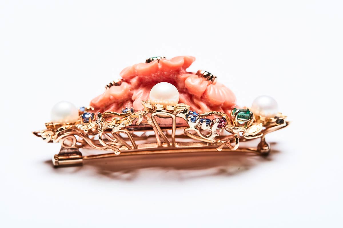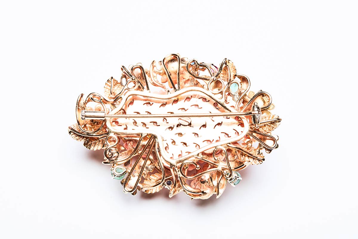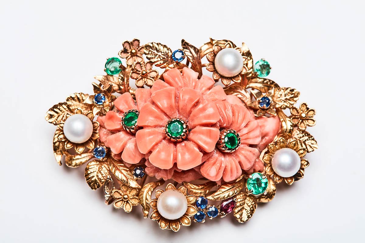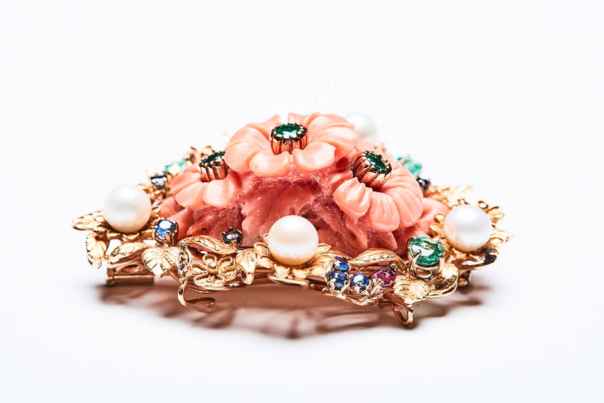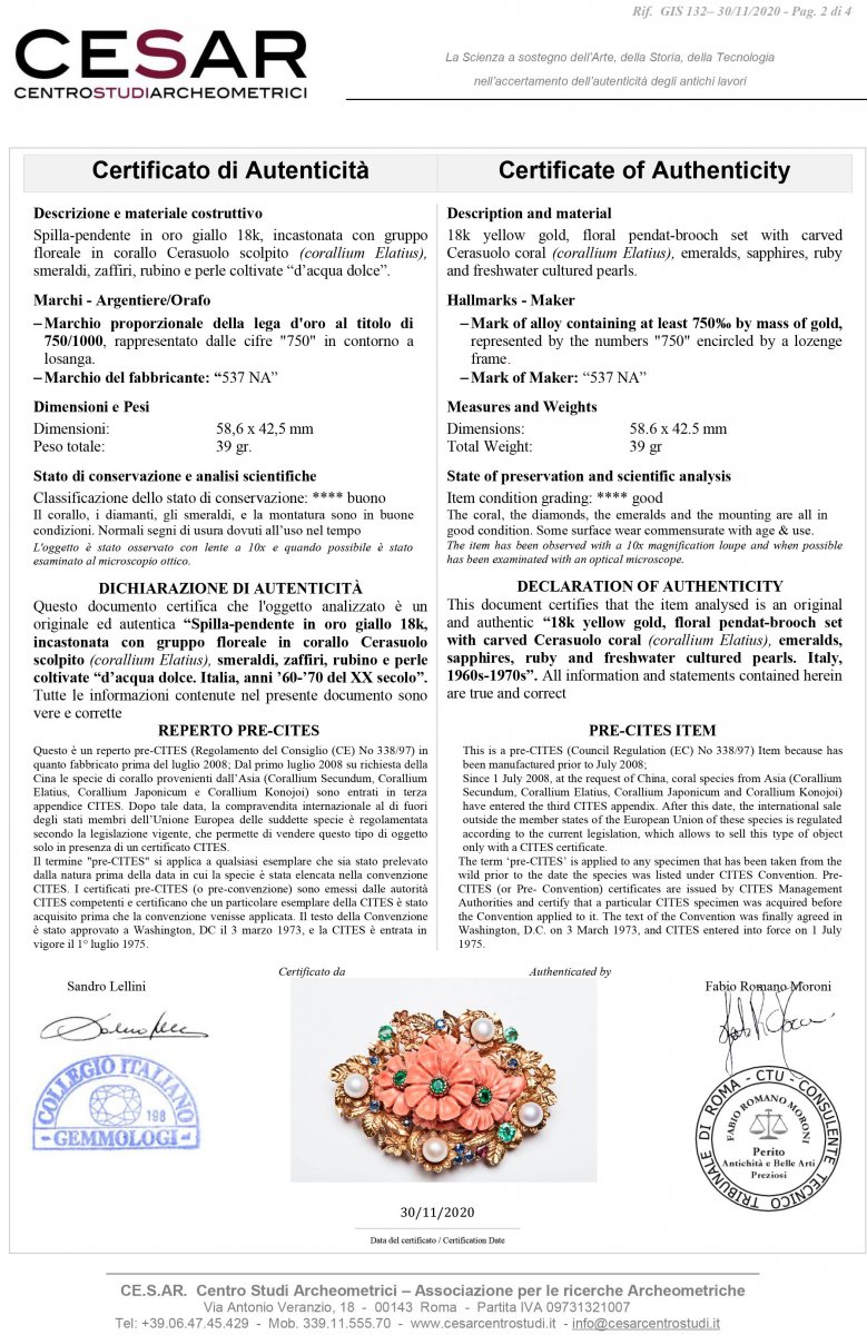 Montatura in oro giallo incastonata con gruppo floreale in corallo Cerasuolo (Corallium Elatius), smeraldi, zaffiri, rubino e perle d'acqua dolce. Punzonata "750", Italia dopo il 1968 e fabbricante "537 NA". Dimensioni 42,5 x 58,6 mm. Peso 39 gr. Stato di conservazione: ****buono. Certificato di Autenticità Ce.S.Ar.