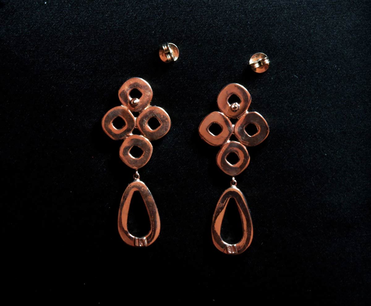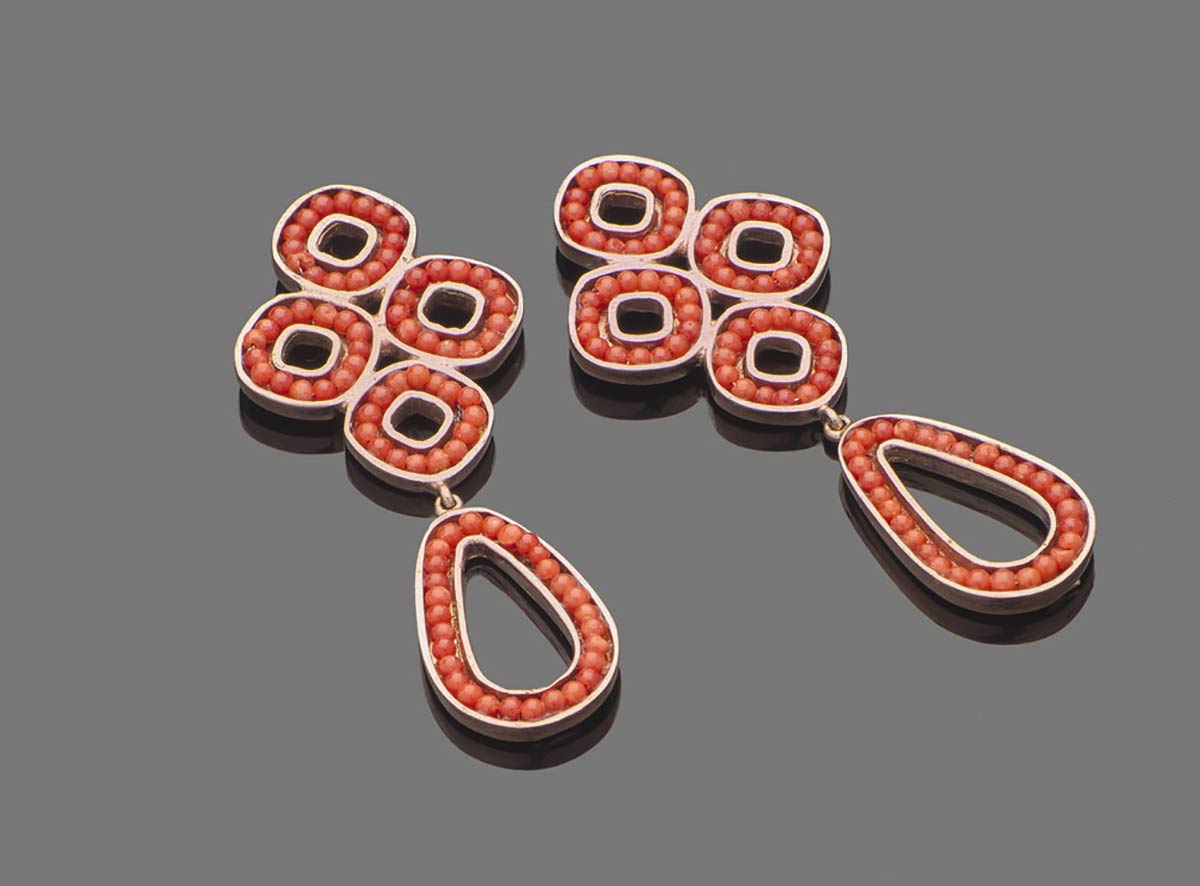 Paio di orecchini "HELIOS" in corallo Sciacca e corallo Mediterraneo (Corallium Rubrum). Montatura in argento 925/1000 rosato. Manifattura Ascione, Torre del Greco. Dimensione 58 x 24 mm. Peso totale 15 gr. Stato di conservazione: *****ottimo.