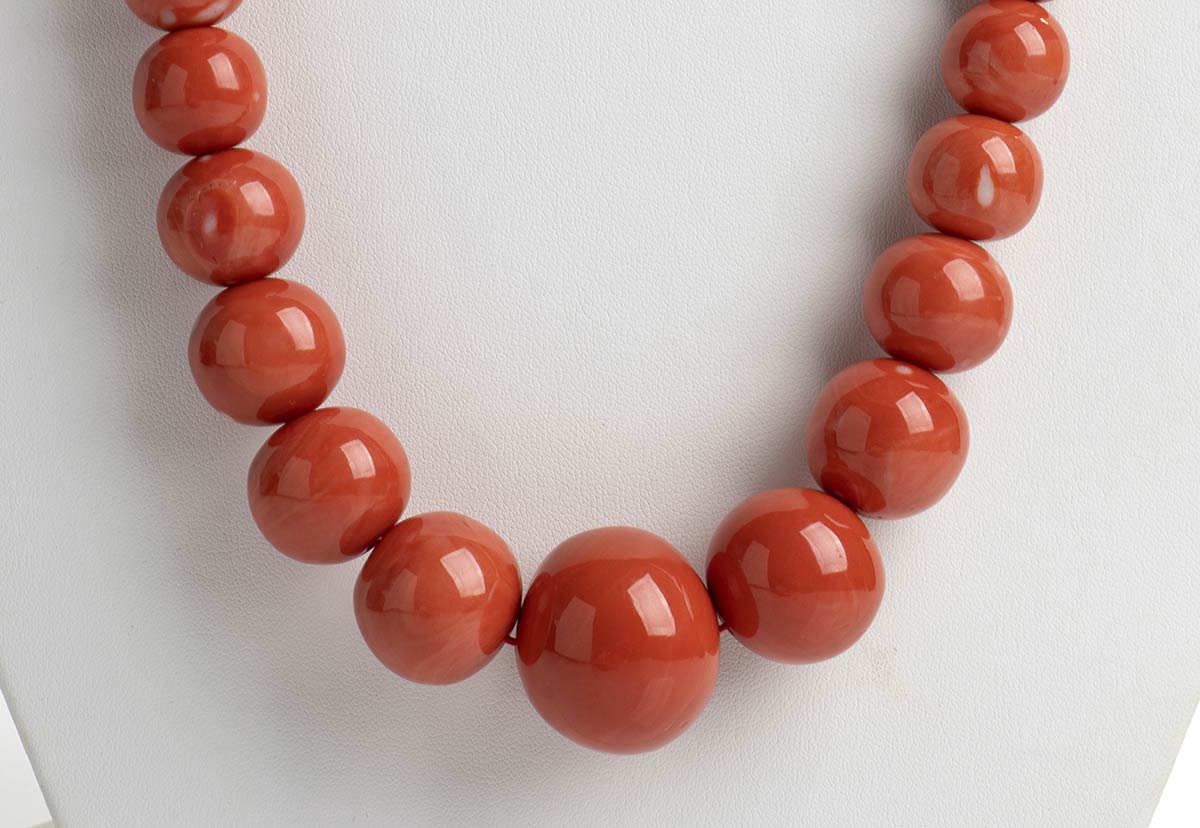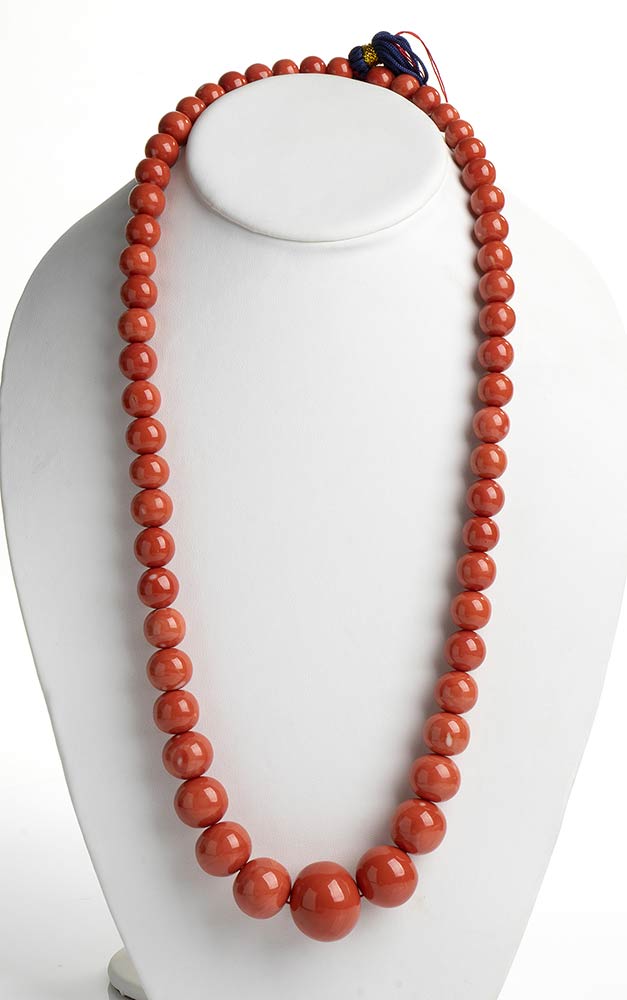 Collana in corallo Momo o Cerasuolo (Corallium Elatius) composta da 56 sfere lisce disposte in gradazione. Senza fermezza. Manifattura Guarracino, Torre del Greco. Lunghezza 76 cm, diametri sfere 29 - 14 - 11 mm. Peso totale 277 gr. Stato di conservazione: *****ottimo.