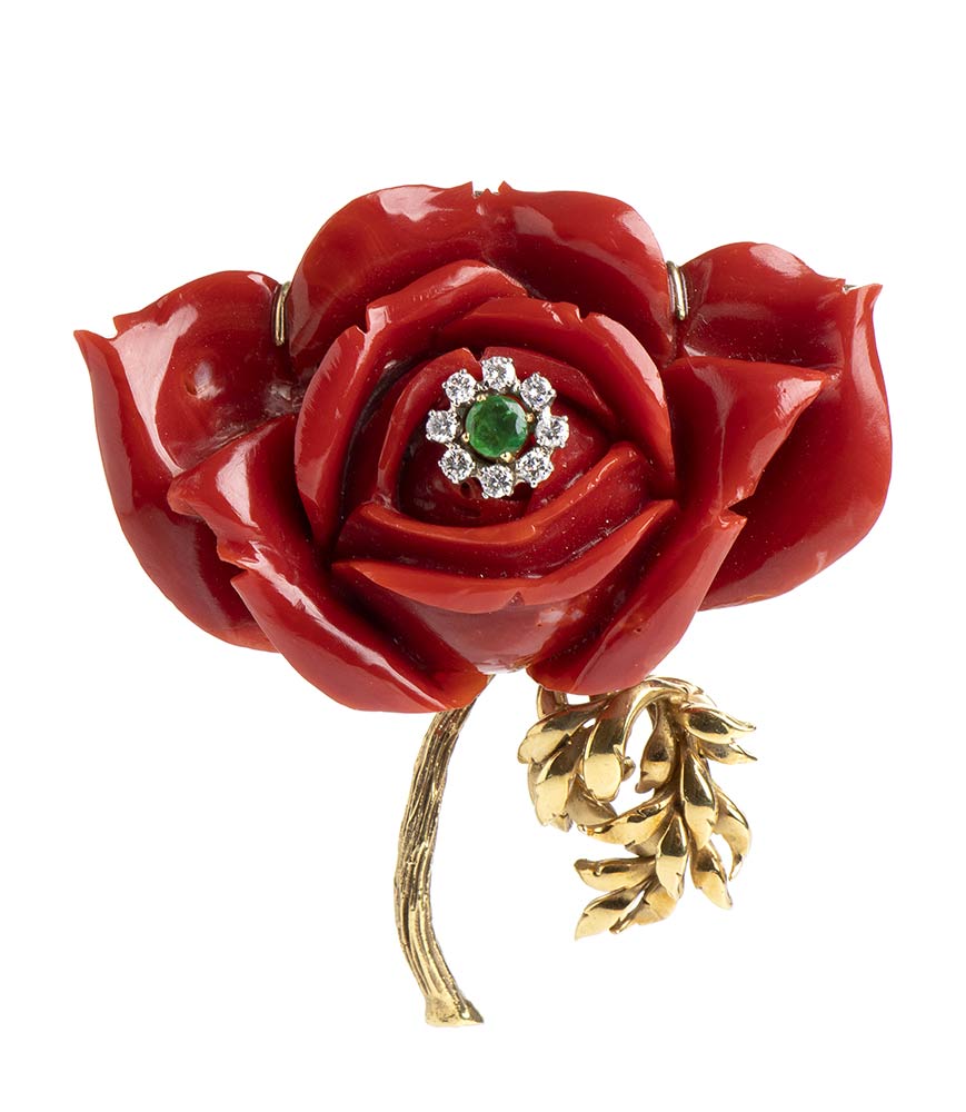 Lotto 224 | Spilla con diamanti, smeraldo e corallo Aka - Manifattura Guarracino, Torre del Greco