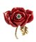 Spilla in oro giallo costituita da una rosa scolpita in corallo Aka (Corallium Laponicum) centrata da fiore incastonato con smeraldo 0,40 ct e diamanti taglio brillante circa 0,30 ct G VVS-VS. Non punzonata. Dimensioni 68,8 x 62,4 mm. Peso totale 67,8 gr. Stato di conservazione: *****ottimo.