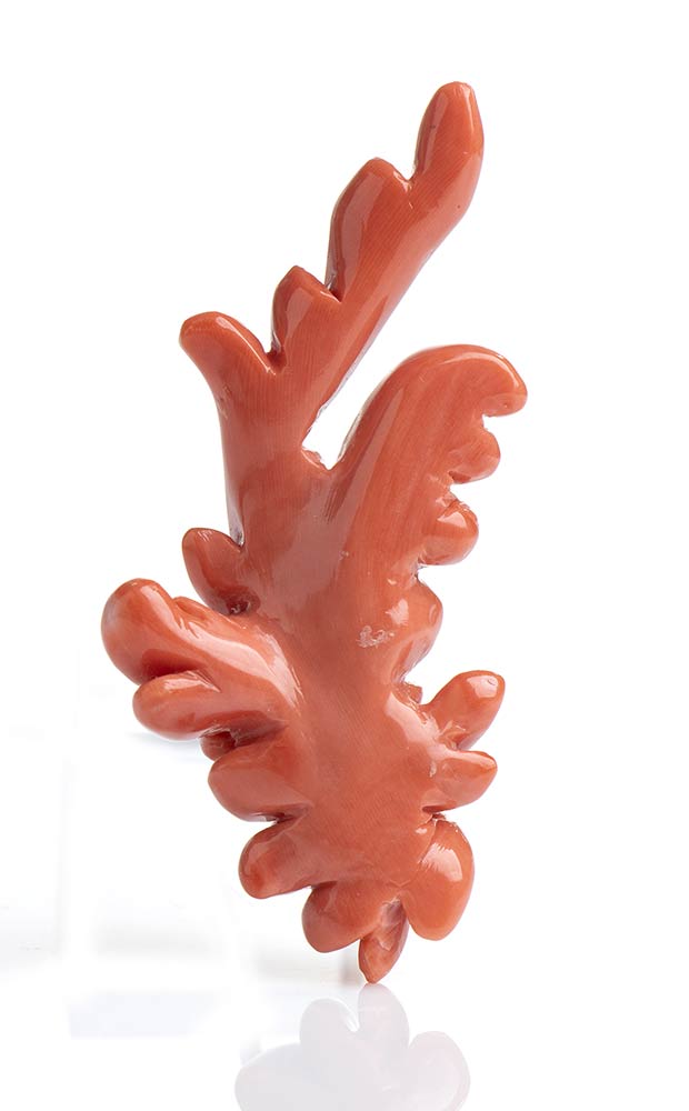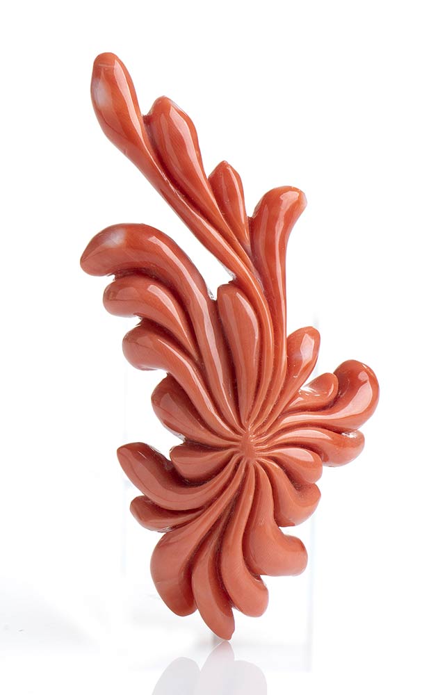 Scultura in corallo Momo o Cerasuolo (Corallium Elatius) inciso con volute floreali. Manifattura Guarracino, Torre del Greco. Dimensioni 65,5 x 31 mm. Peso 19,5 gr. Stato di conservazione: *****ottimo.