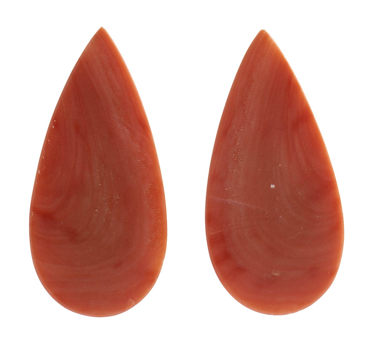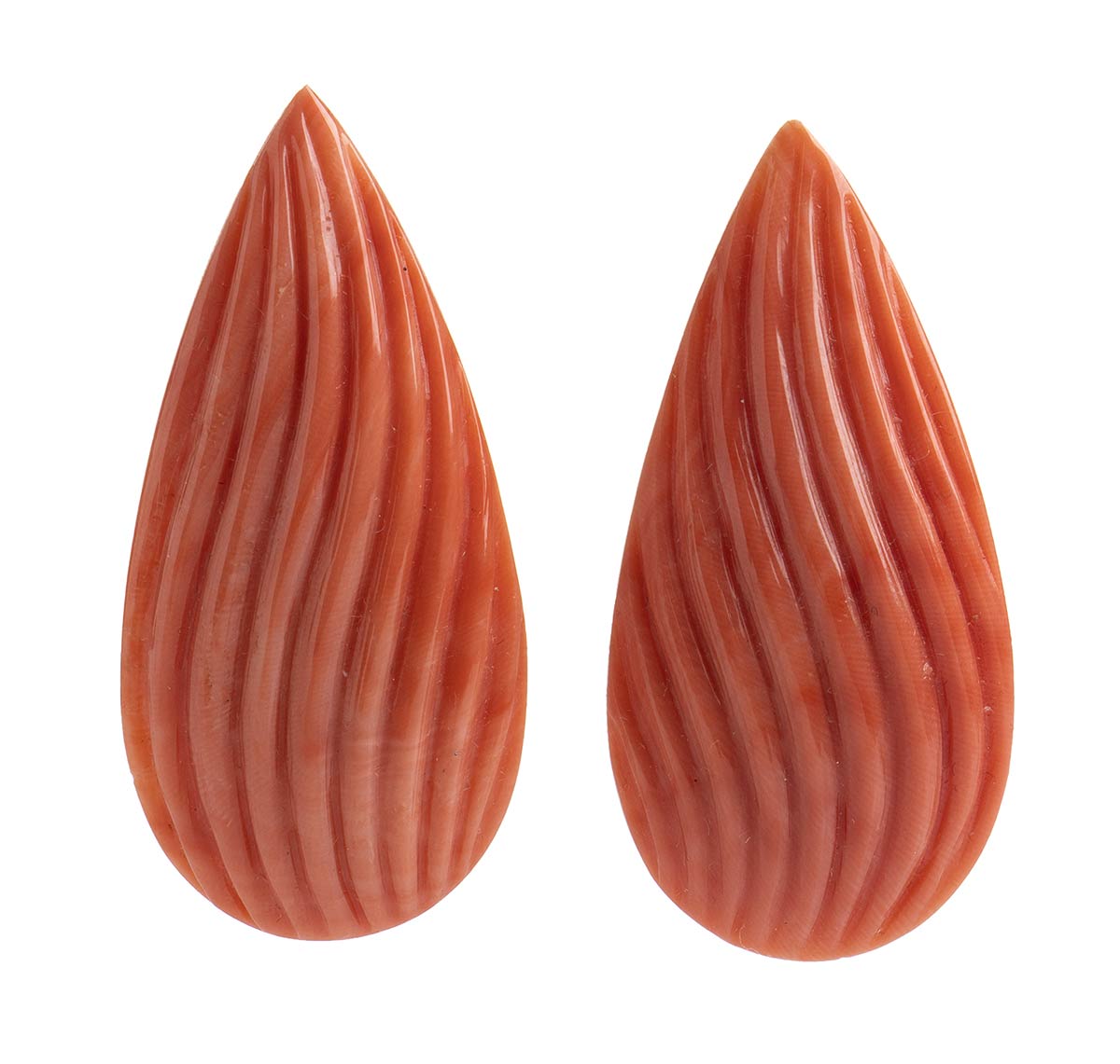 Coppia di gocce con scanalatura tortile in corallo Momo o Cerasuolo (Corallium Elatius). Manifattura Guarracino, Torre del Greco. Dimensioni 41 x 22 mm. Peso totale 12 gr. Stato di conservazione: *****ottimo.