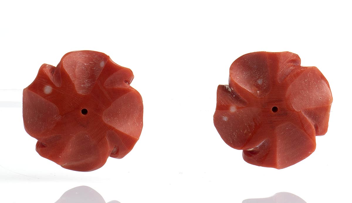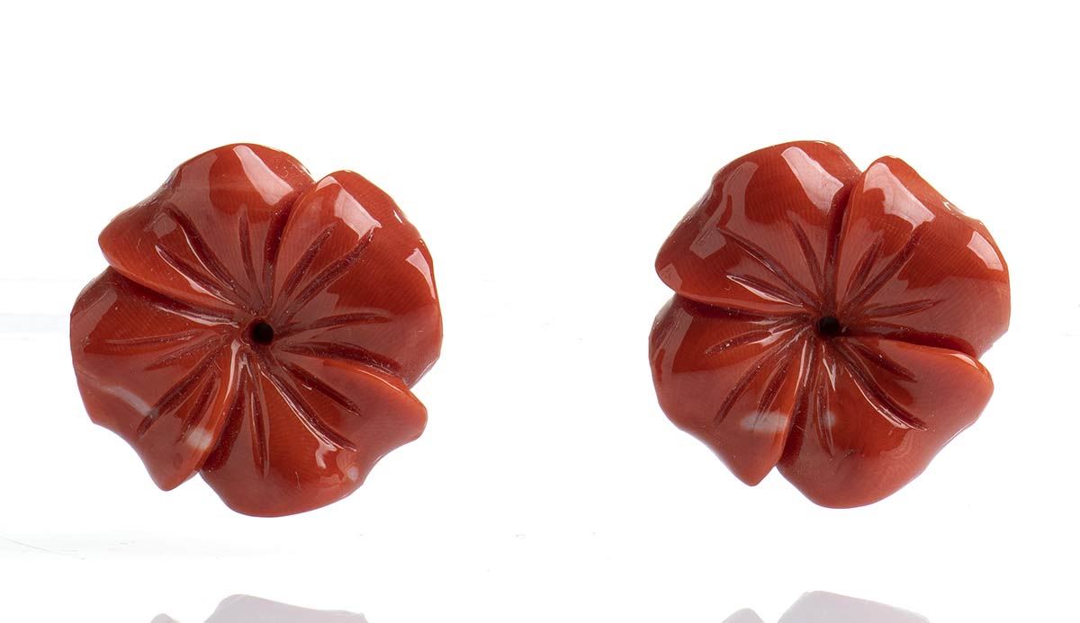 Coppia di fiori in corallo Momo o Cerasuolo (Corallium Elatius). Manifattura Guarracino, Torre del Greco. Diametro 25,6 mm, spessore 7,5 mm. Peso totale 13,4 gr. Stato di conservazione: *****ottimo.
