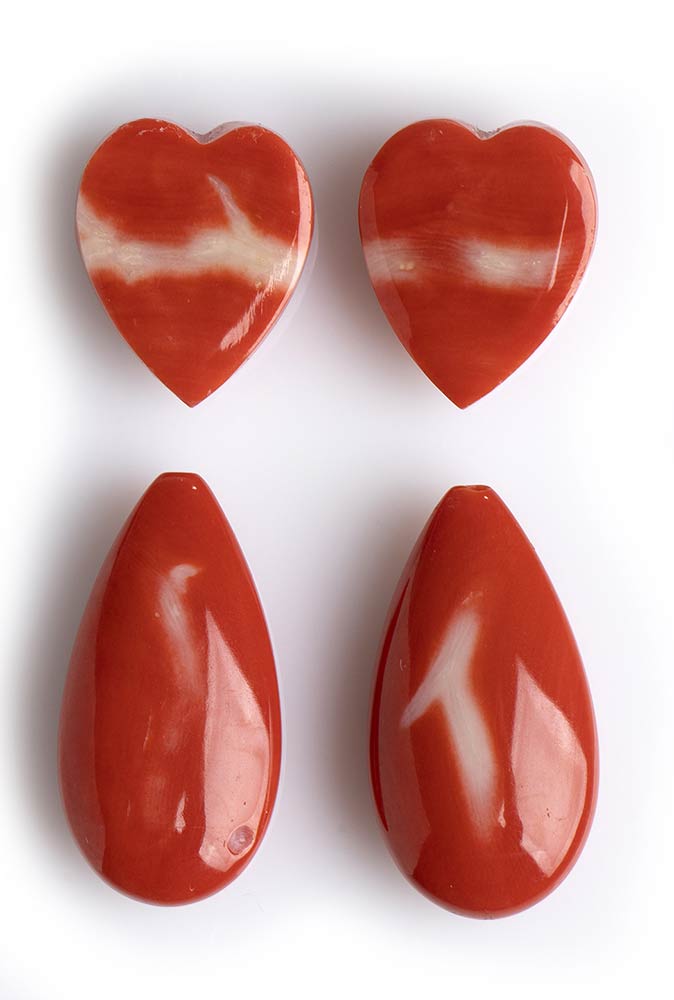 Quadrittico composto da coppia di cuori e coppia di gocce pendenti liscie in corallo Cerasuolo - Manifattura Guarracino, Torre del Greco