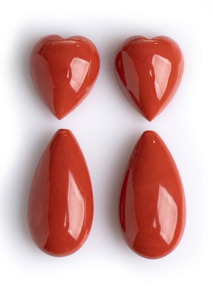 Quadrittico composto da coppia di cuori e coppia di gocce pendenti liscie in corallo Momo o Cerasuolo (Corallium Elatius). Manifattura Guarracino, Torre del Greco. Dimensioni cuori 18,3 x 15 mm. Dimensioni cabochon 27,3 x 14 mm. Peso totale 15,7 gr. Stato di conservazione: *****ottimo.