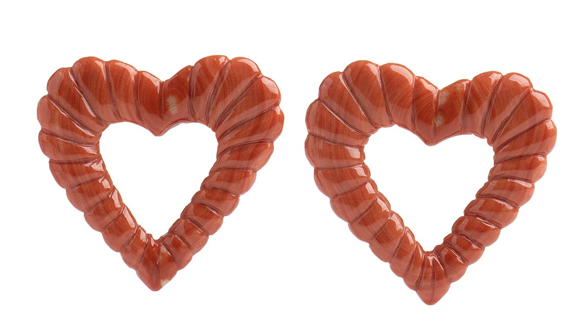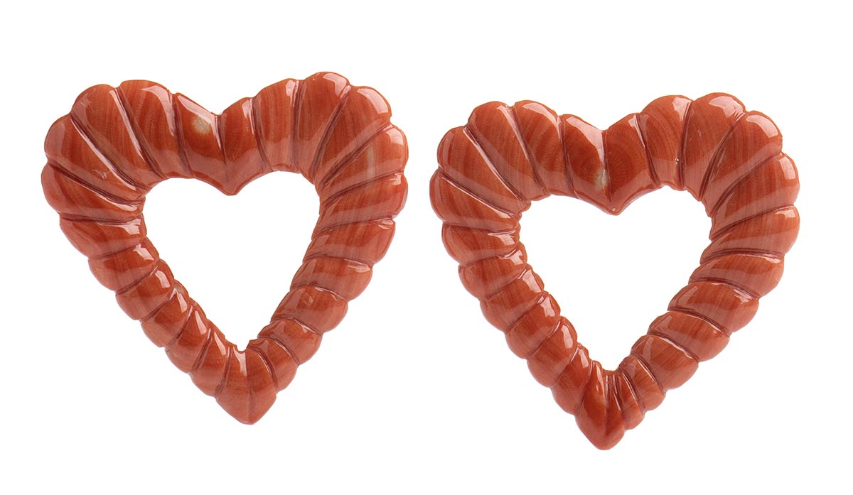 Coppia di cuori traforati in corallo Cerasuolo - Manifattura Guarracino, Torre del Greco