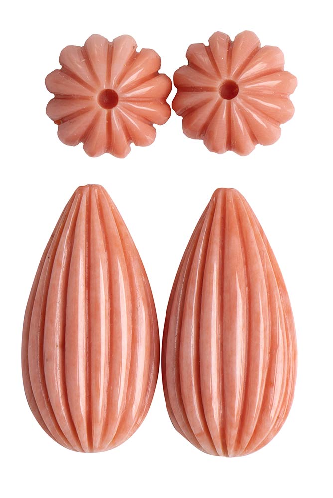Quadrittico composto da coppia di bottoni e coppia di gocce pendenti scanalate in corallo Bokè - Manifattura Guarracino, Torre del Greco