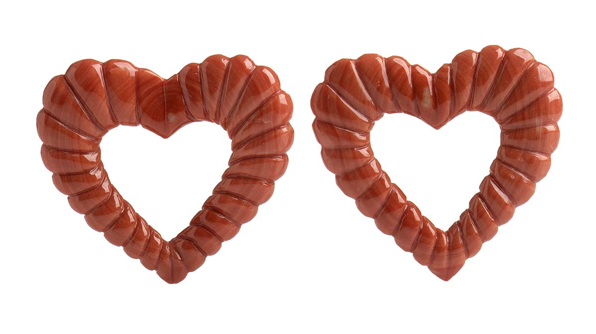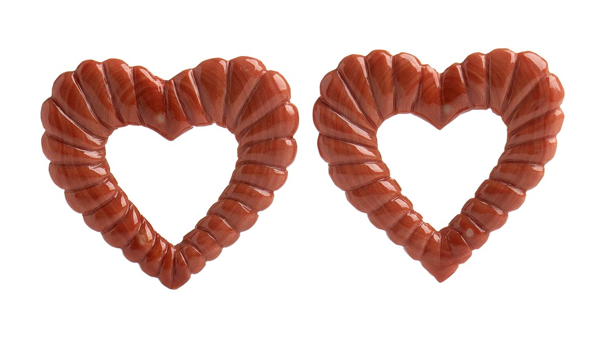 Coppia di cuori traforati in corallo Momo o Cerasuolo (Corallium Elatius). Manifattura Guarracino, Torre del Greco. Dimensioni 44 x 41 mm. Peso totale 21,8 gr. Stato di conservazione: *****ottimo.