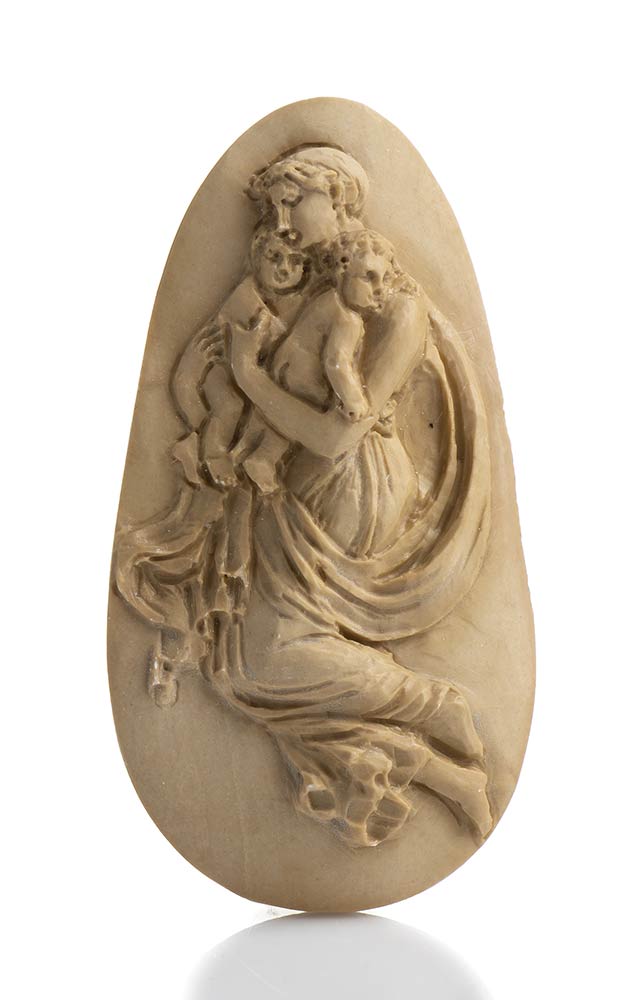 Incisione ad altorilievo su pietra lavica raffigurante figura femminile con bambini. Manifattura Guarracino, Torre del Greco. Dimensioni 65 x 34,5 mm, spessore 11 mm. Peso 25,2 gr. Stato di conservazione: *****ottimo.