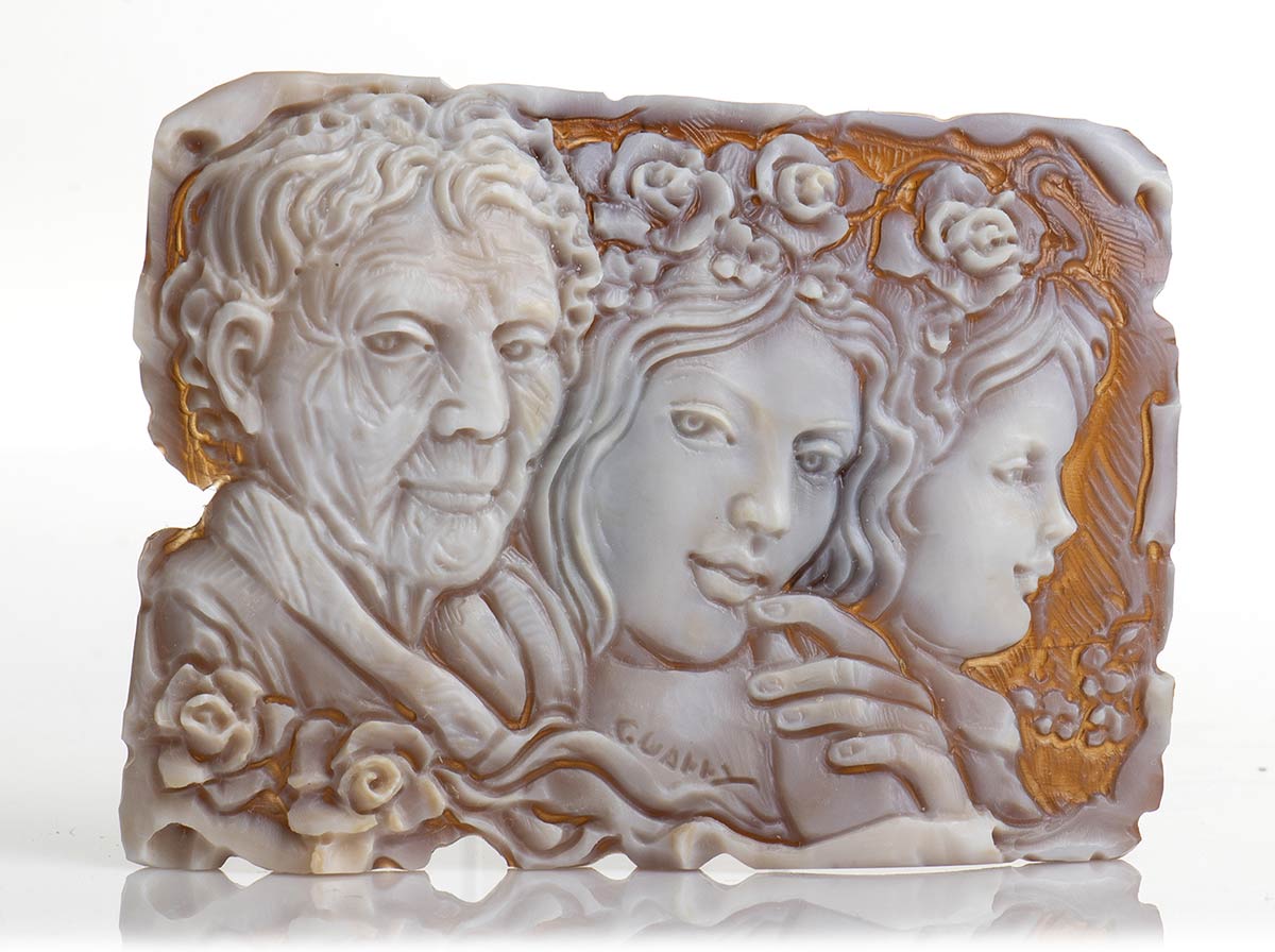 Cammeo su conchiglia Sardonica (Cassis Madagascariensis) raffigurante "la foto ingiallita", ovvero il ciclo della vita. Manifattura Guarracino, Torre del Greco. Dimensioni 72,4 x 54,2 mm, spessore 5,6 mm. Peso totale 21,3 gr. Stato di conservazione: *****ottimo.