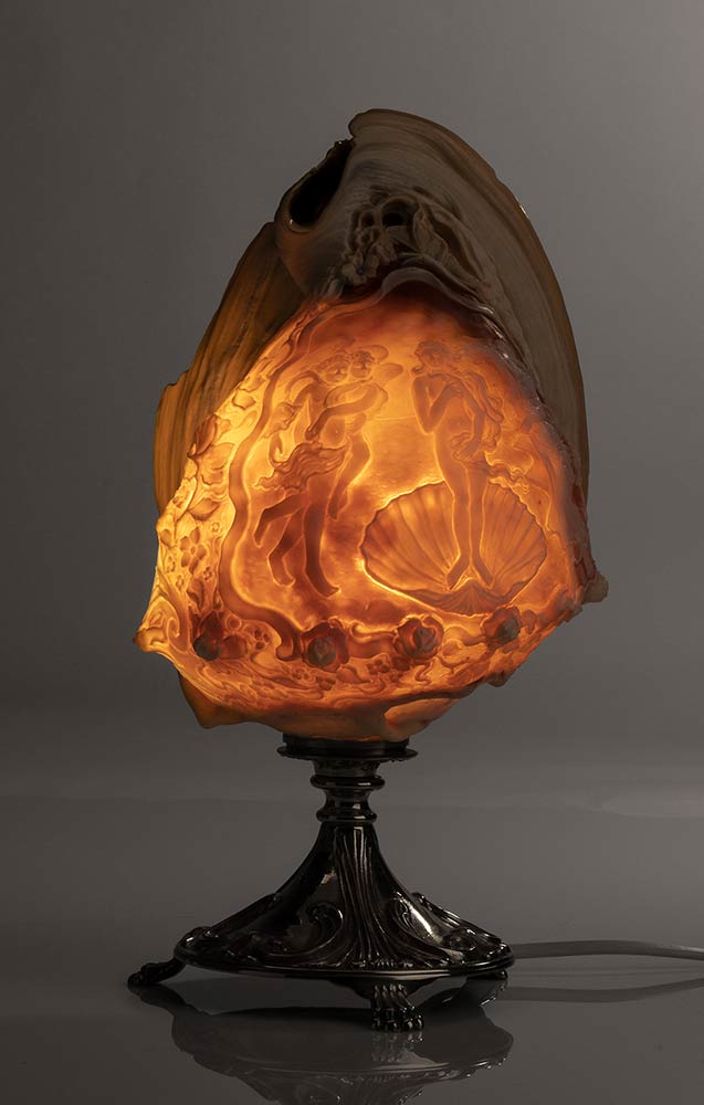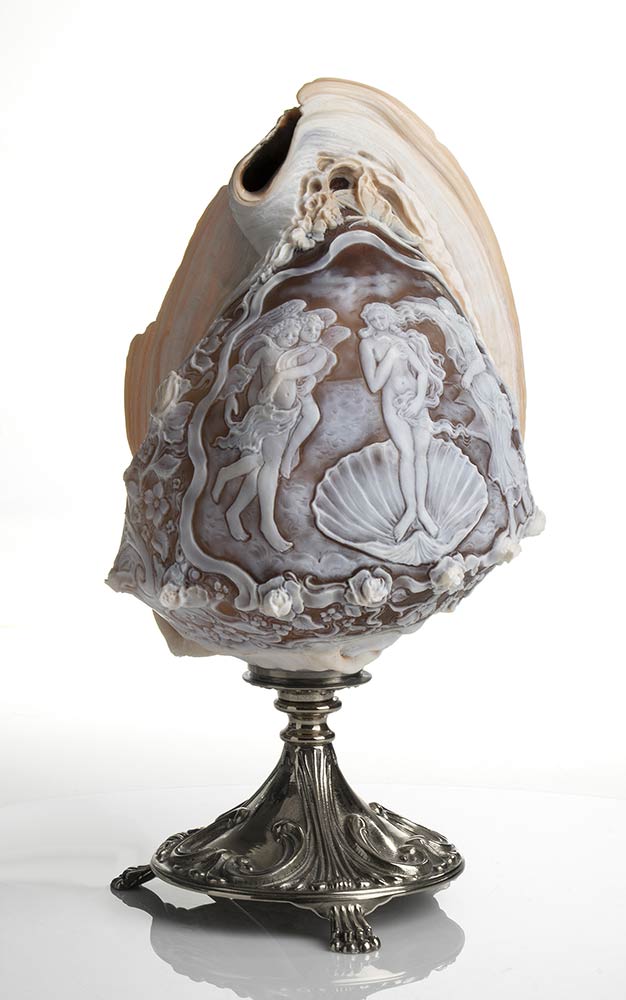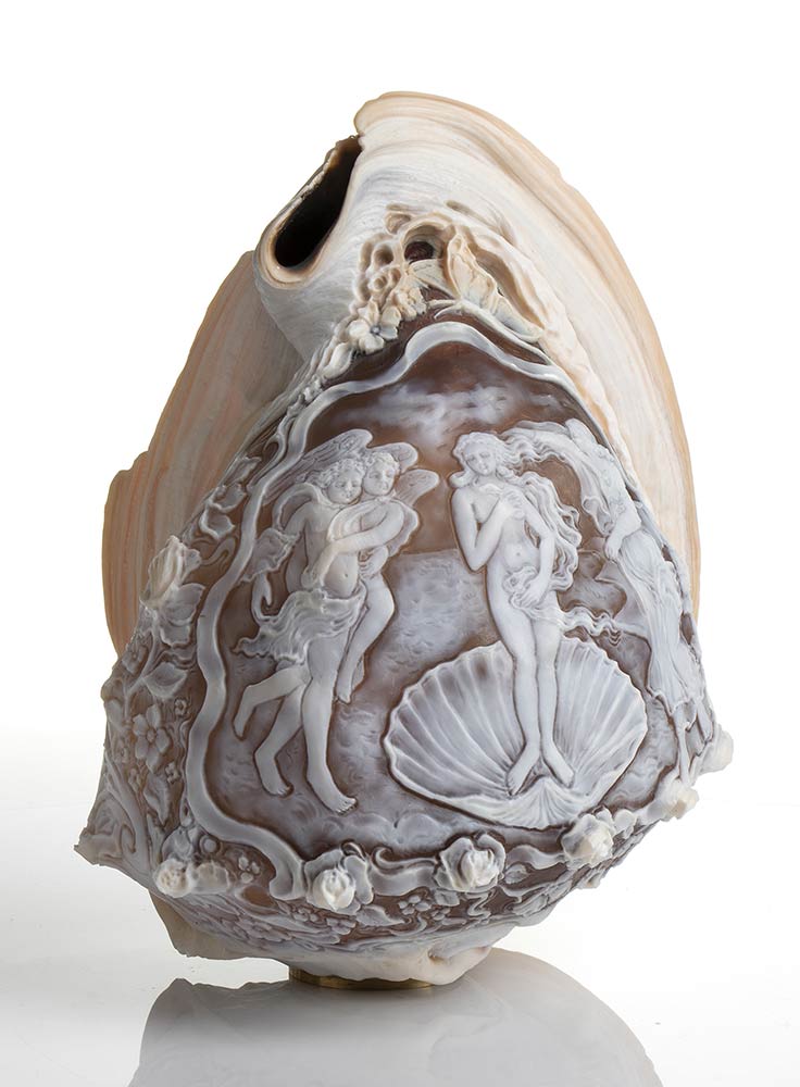 Incisione su conchiglia Sardonica (Cassis Madagascariensis) raffigurante "Nascita di Venere" del Botticelli. Manifattura Guarracino, Torre del Greco. Dimensioni 14 x 12 cm, altezza 20 cm. Peso totale 668 gr. Stato di conservazione: *****ottimo.