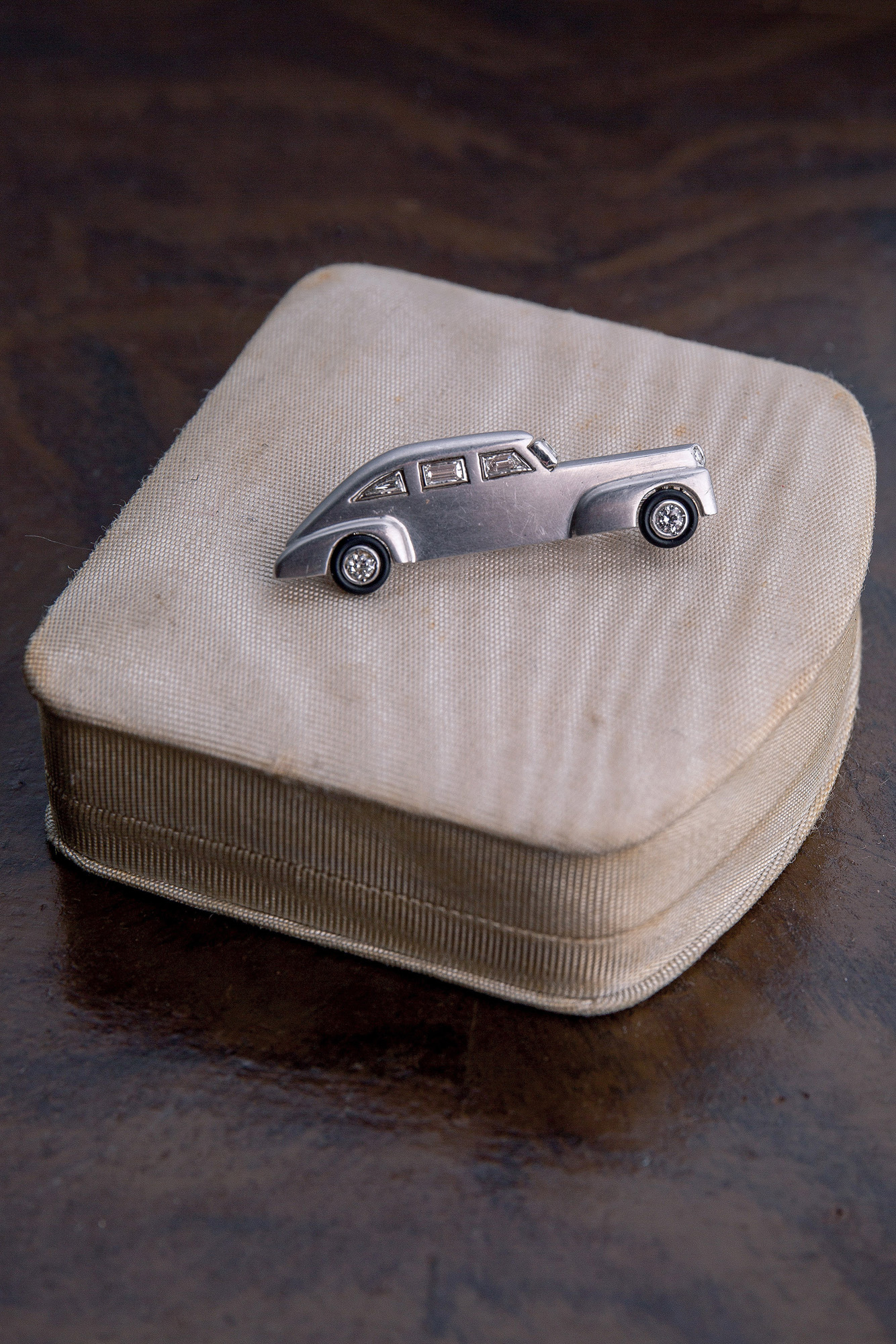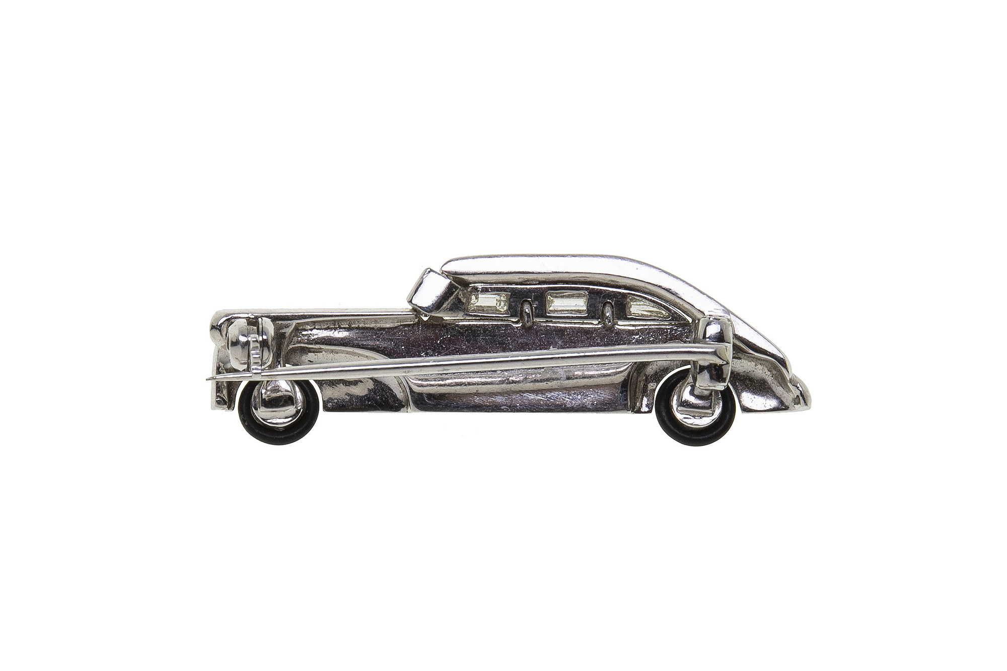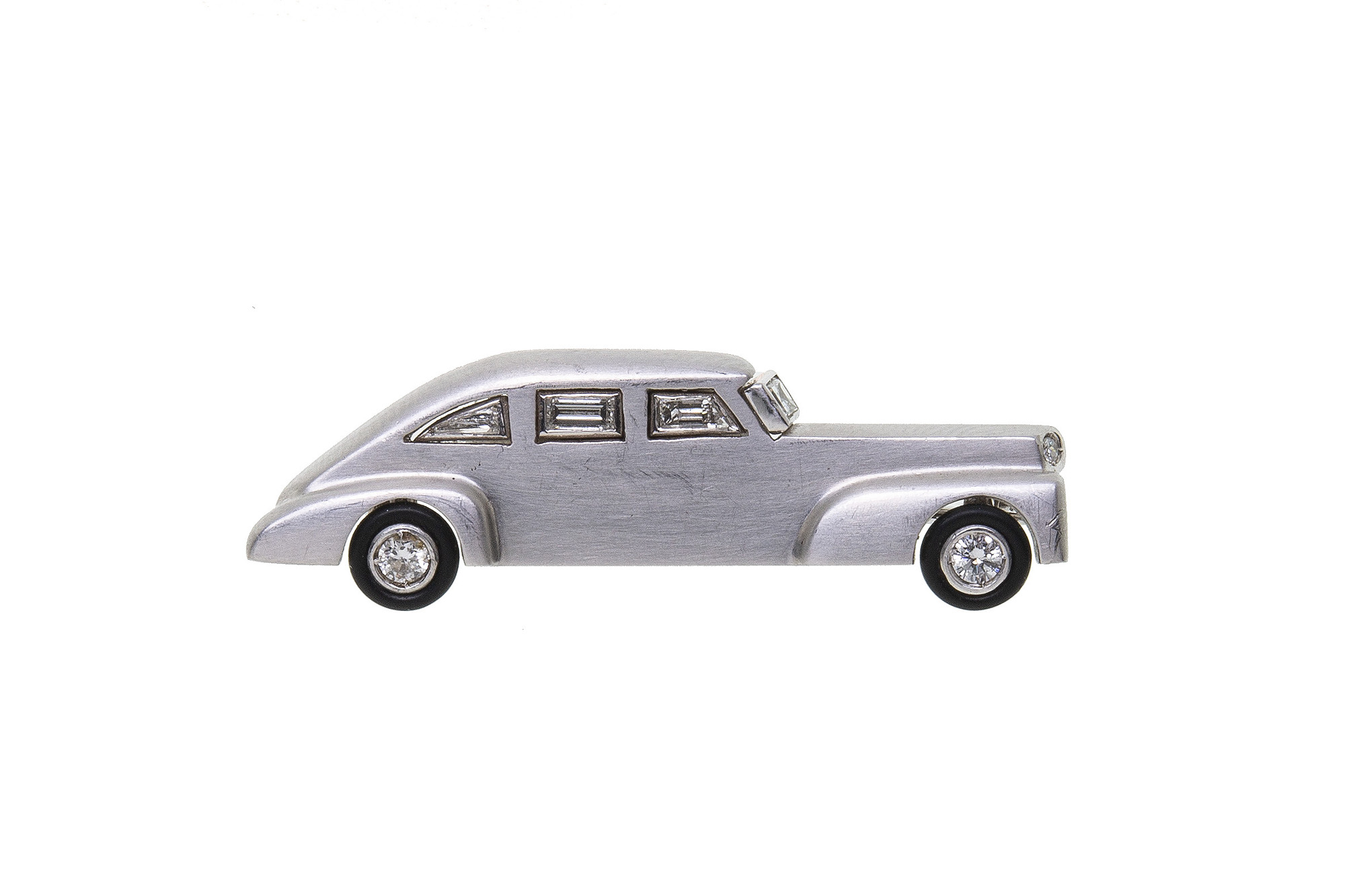 Spilla in platino e diamanti (0,30 ct) a forma di "Rolls Royce" . Il peso è di 8,60 gr.