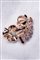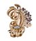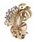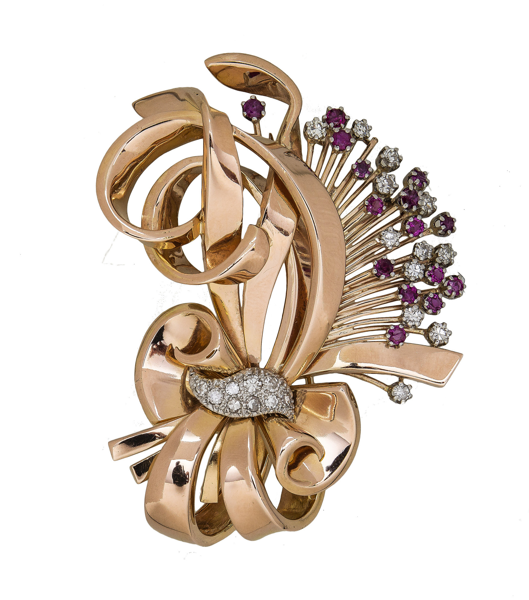 Spilla del 1940, in oro rosa e oro bianco 18 Kt a volute nastrate arricchite da un fascio di steli decorati con diamanti (0,90 ct ca.)e rubini viola (0,50 ct ca.). Il peso è di 40 gr.