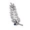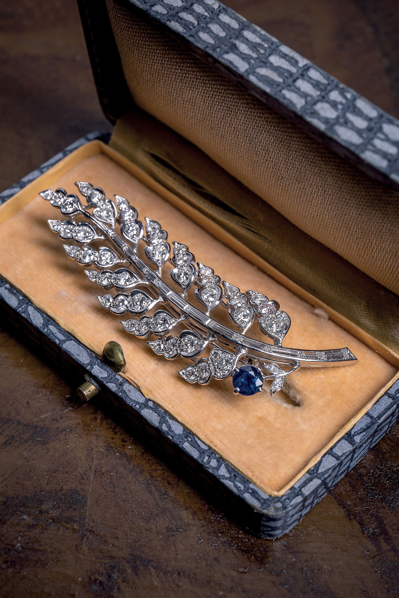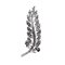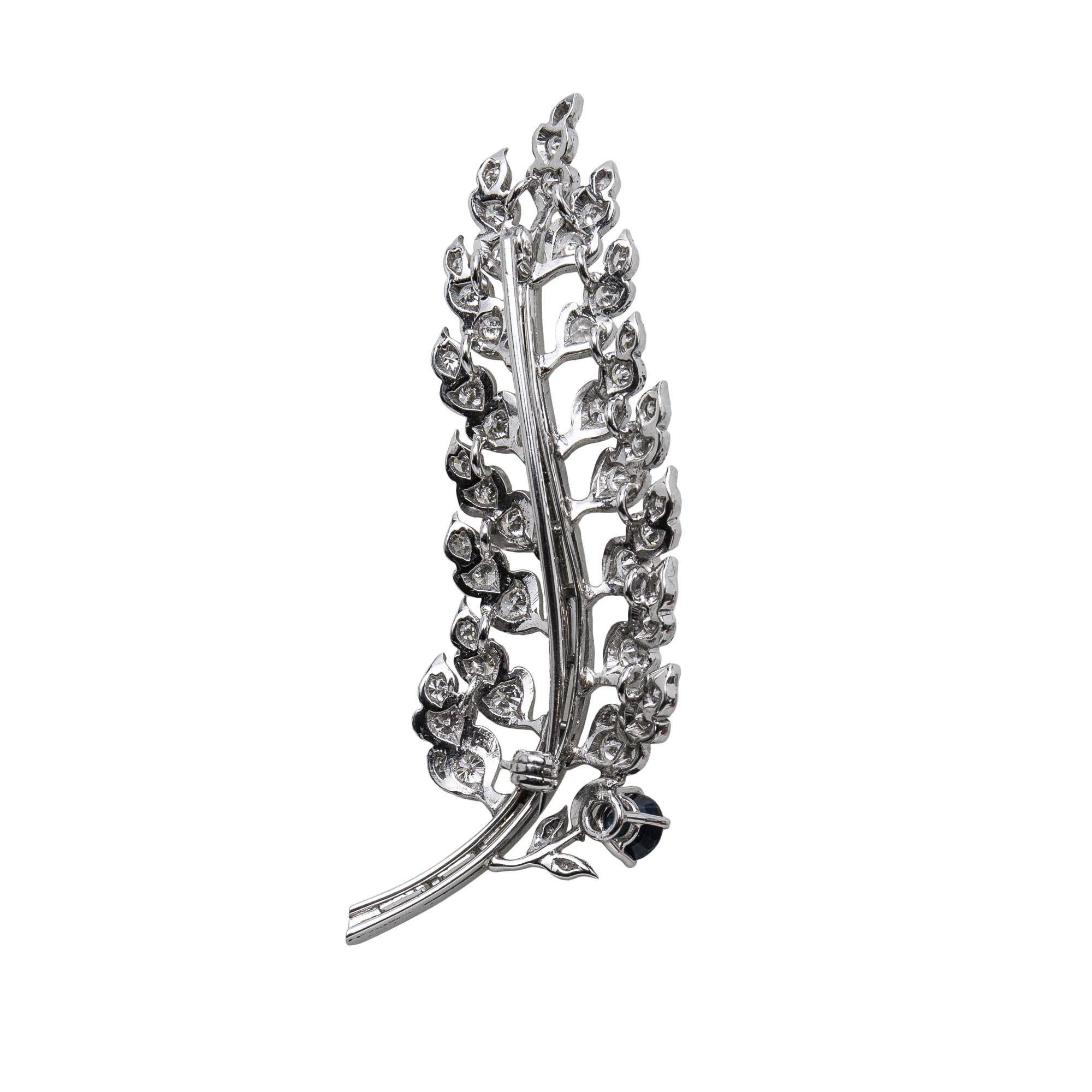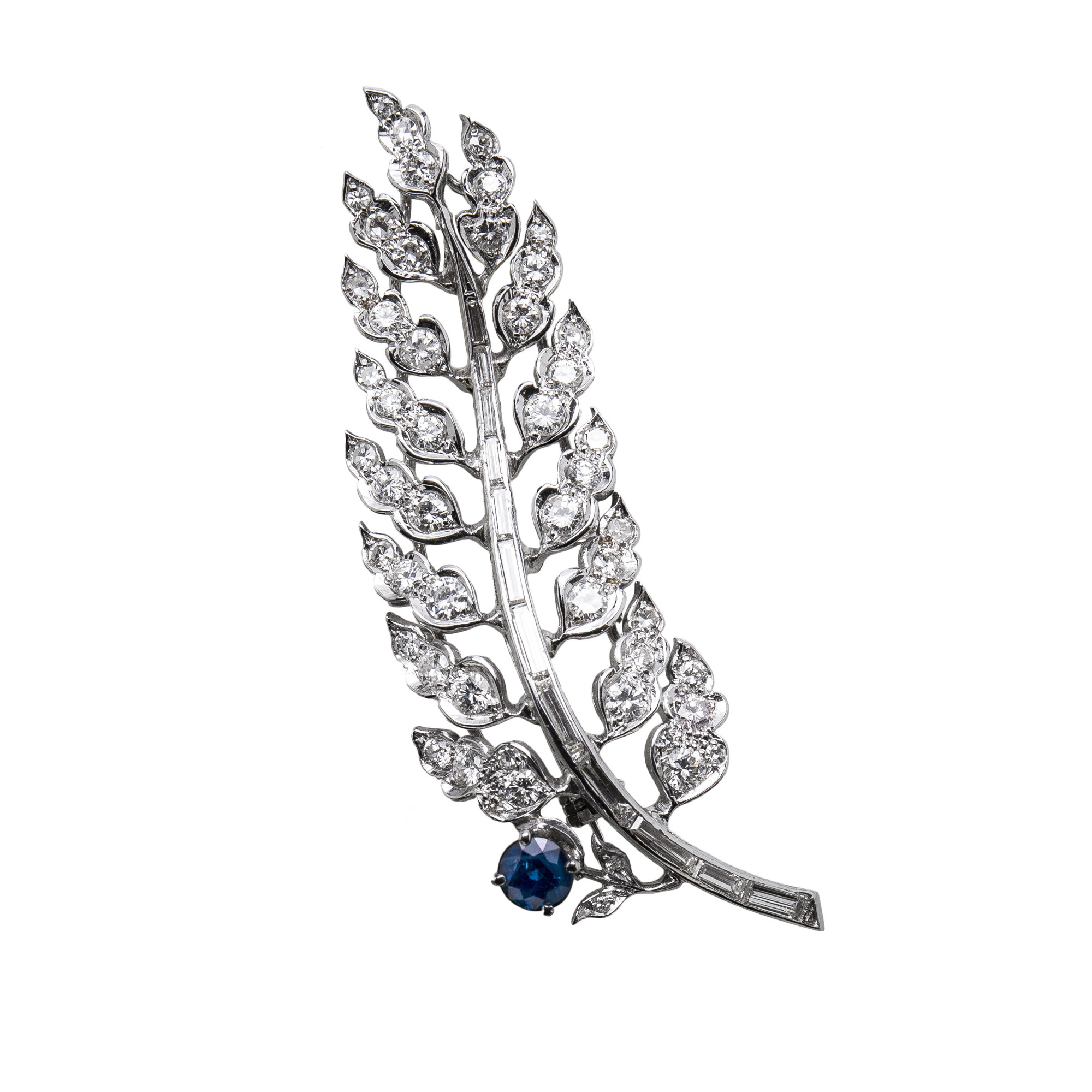 Spilla in oro bianco 18 Kt a forma di piuma, interamente decorata con diamanti rotondi e taglio baguette (1,20 ct). Uno zaffiro decora ulteriormente la base. Il peso è di 9,30 gr.