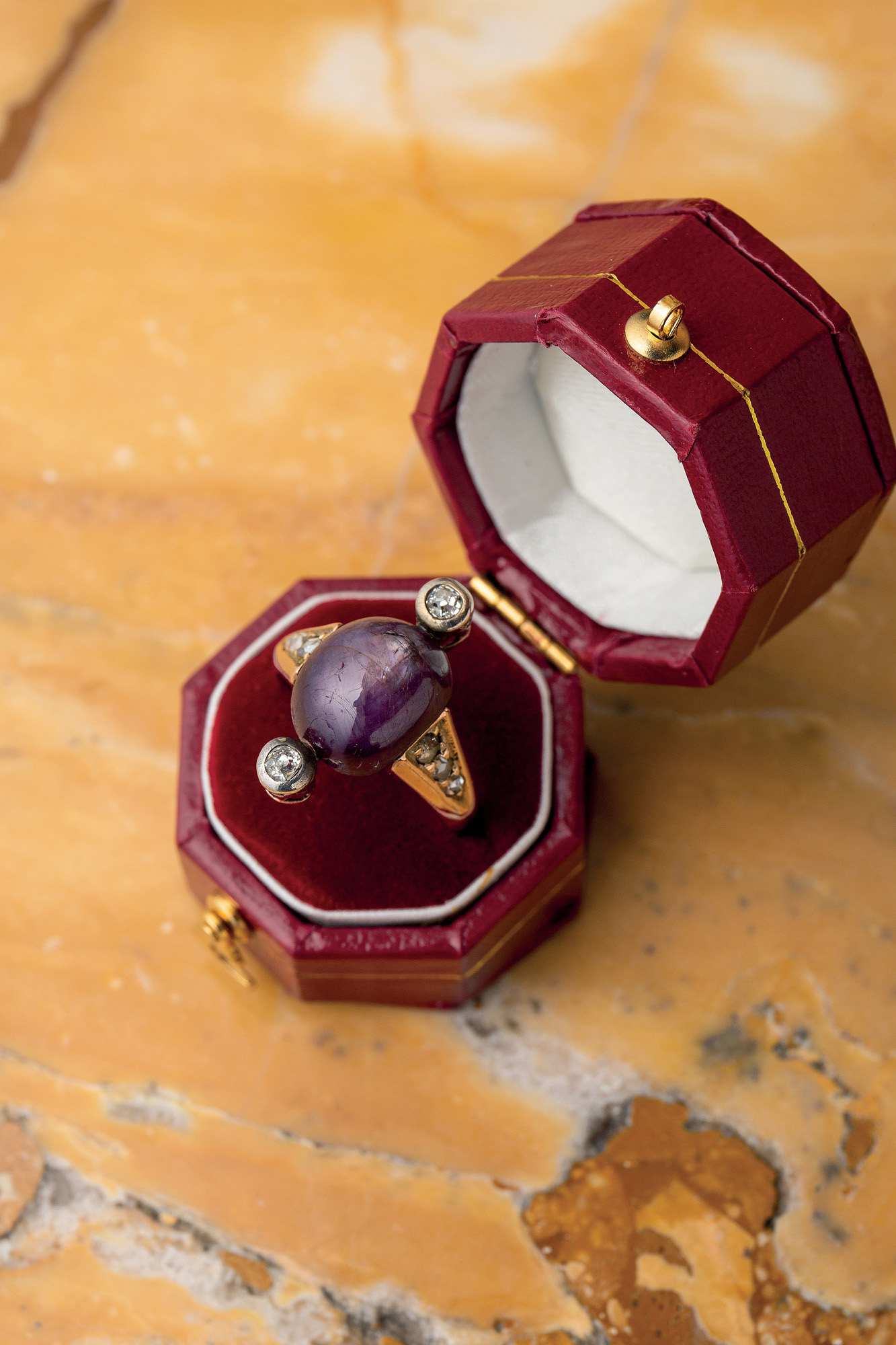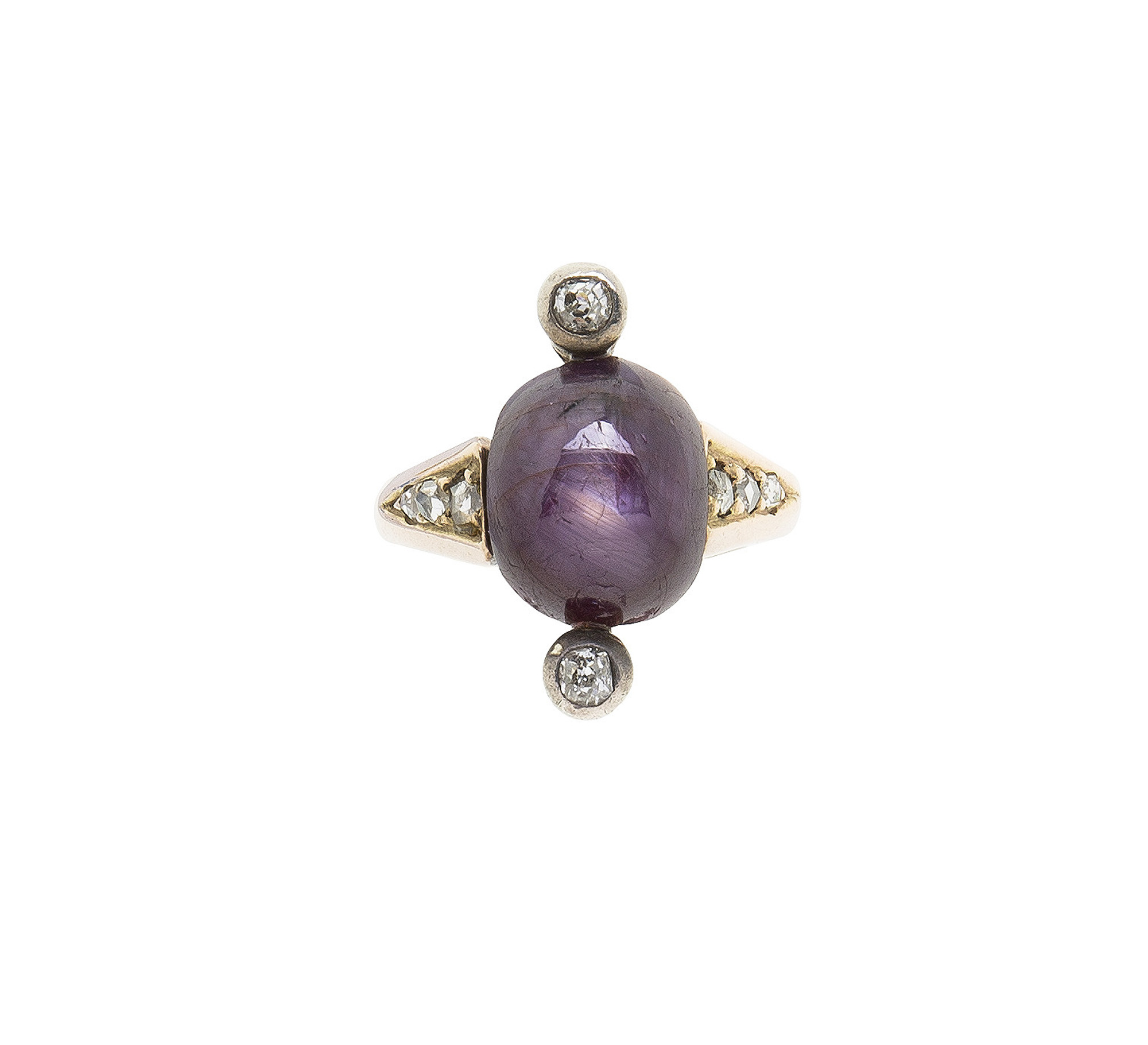 Anello Liberty in oro giallo 18 Kt, con rubino stellato cabochon (4 ct) al centro, arricchito da diamanti (0,20 ct) posti ai lati. Il peso è di 5,13 gr. Misura ITA 10 Misura USA 5,5