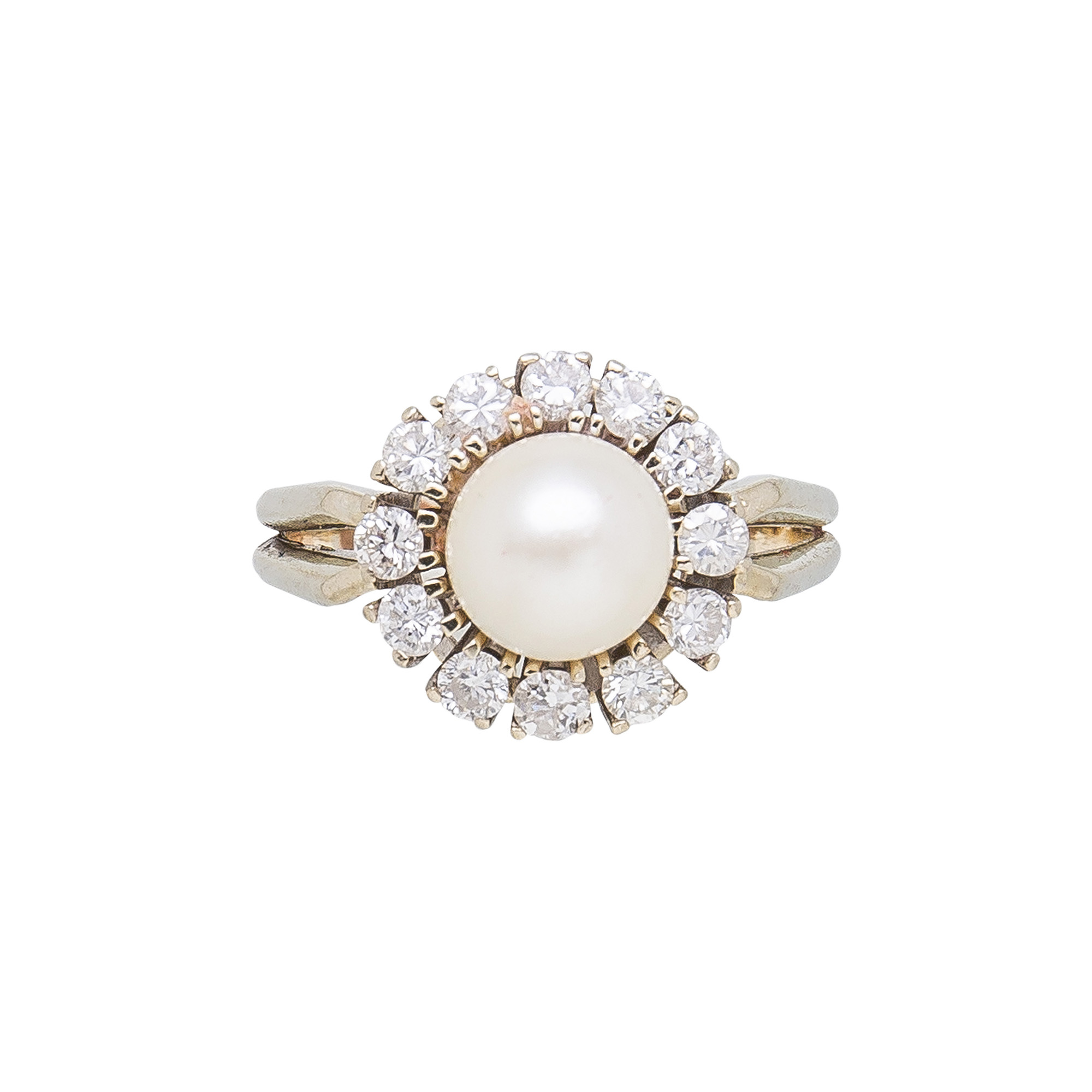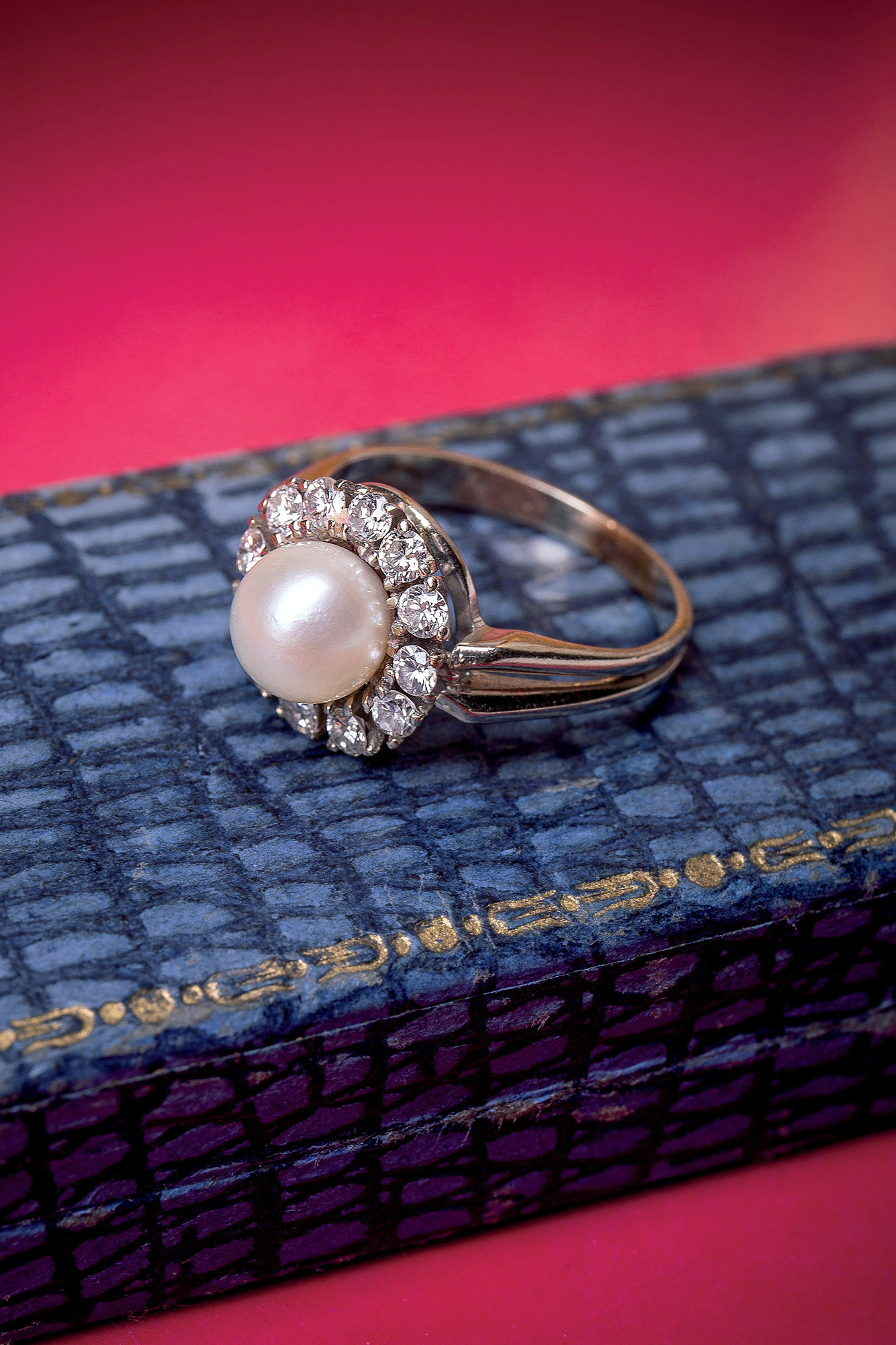 Anello in oro bianco 18 Kt con perla centrale e cornice in diamanti (0,30 ct). Il peso è di 4,00 gr. Misura ITA 13 Misura USA 6,5