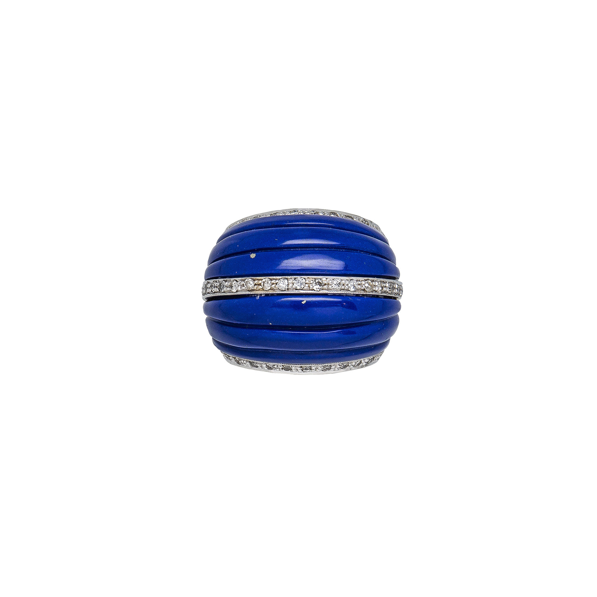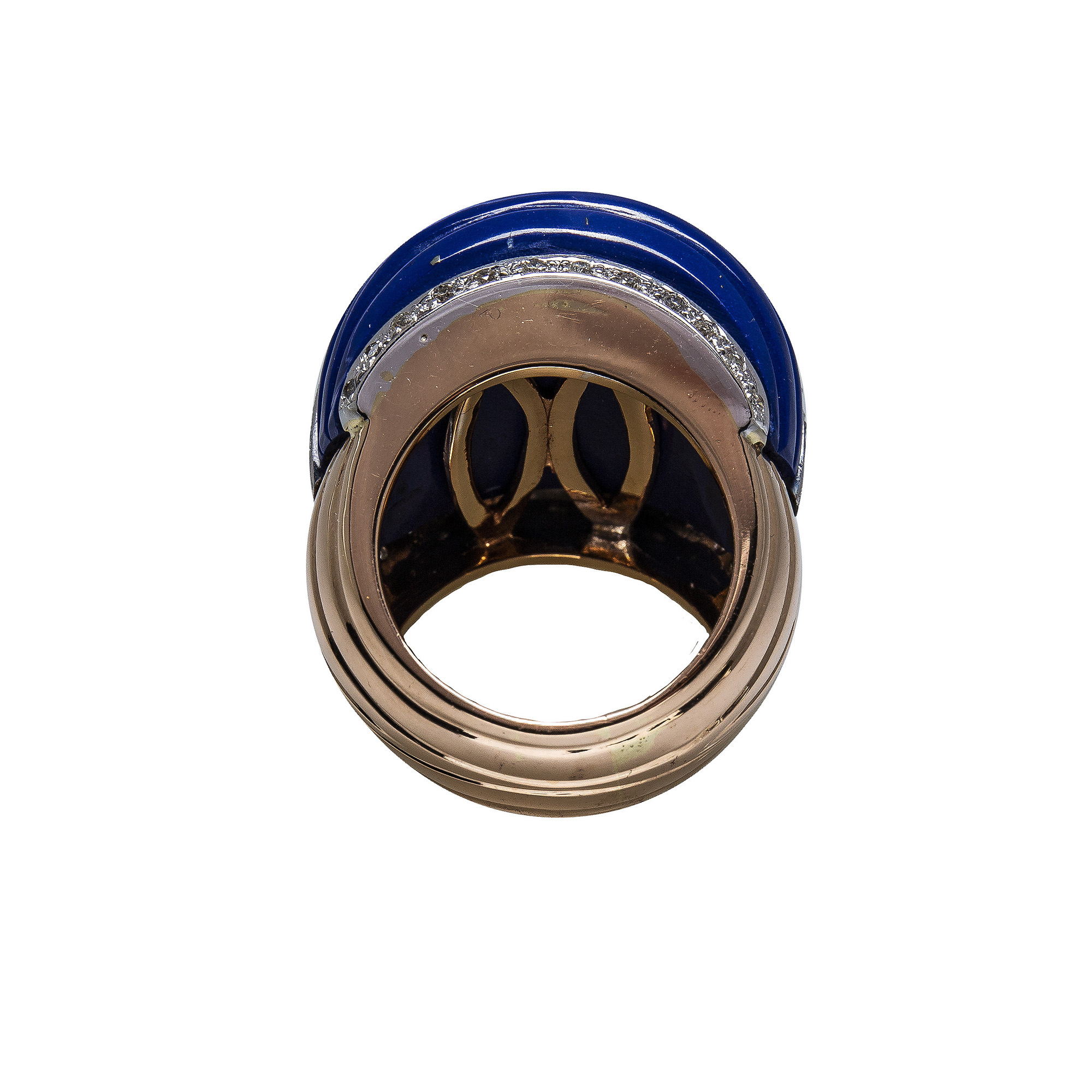 Anello a cupola in oro giallo 18 Kt con lapislazzuli impreziosito da tre file di diamanti. Il peso è di 21,70 gr. Misura ITA 14 Misura USA 7
