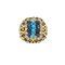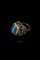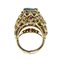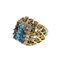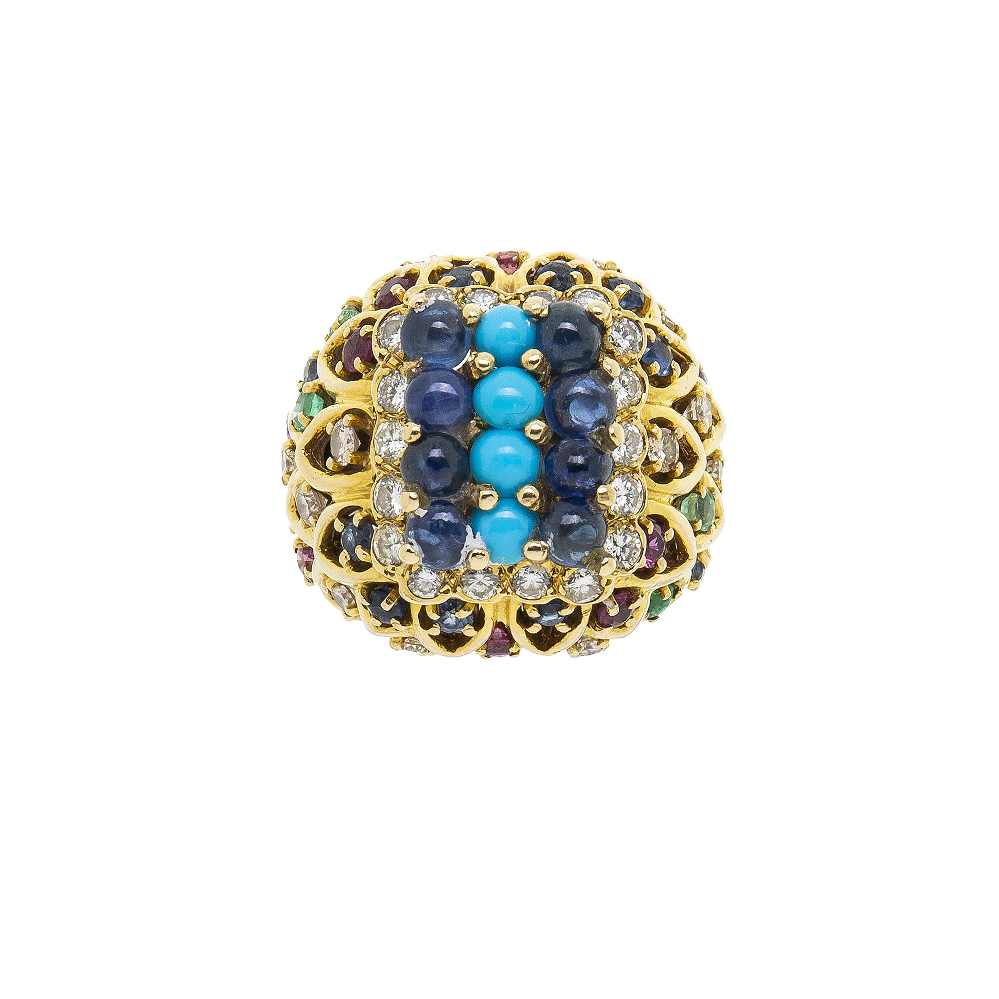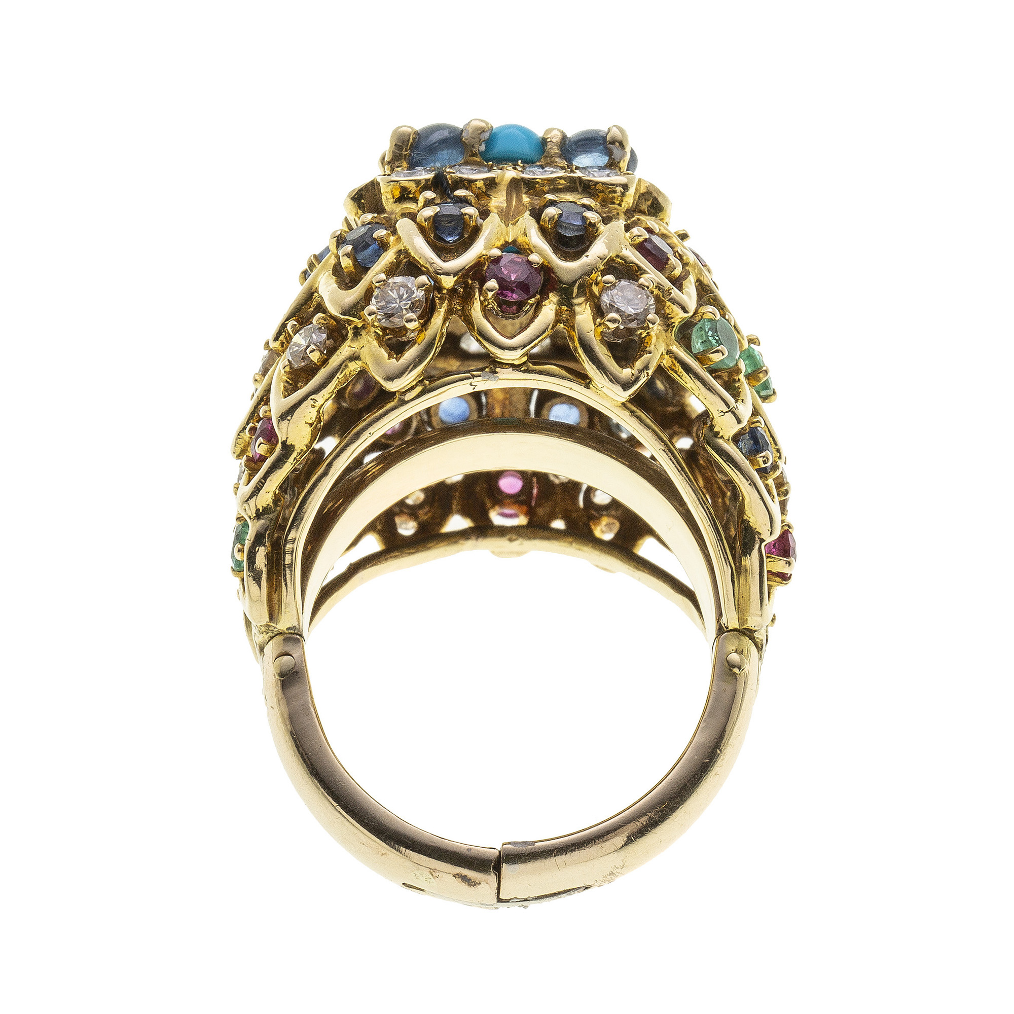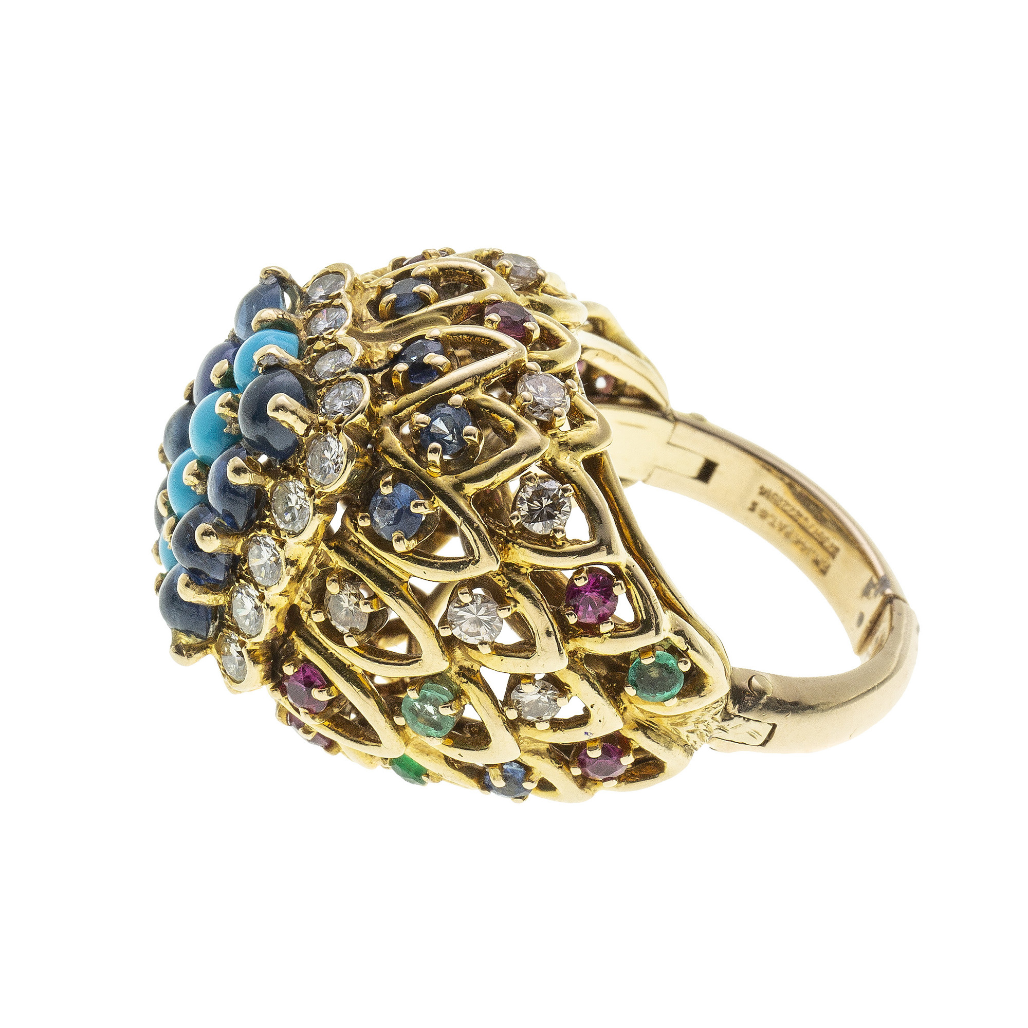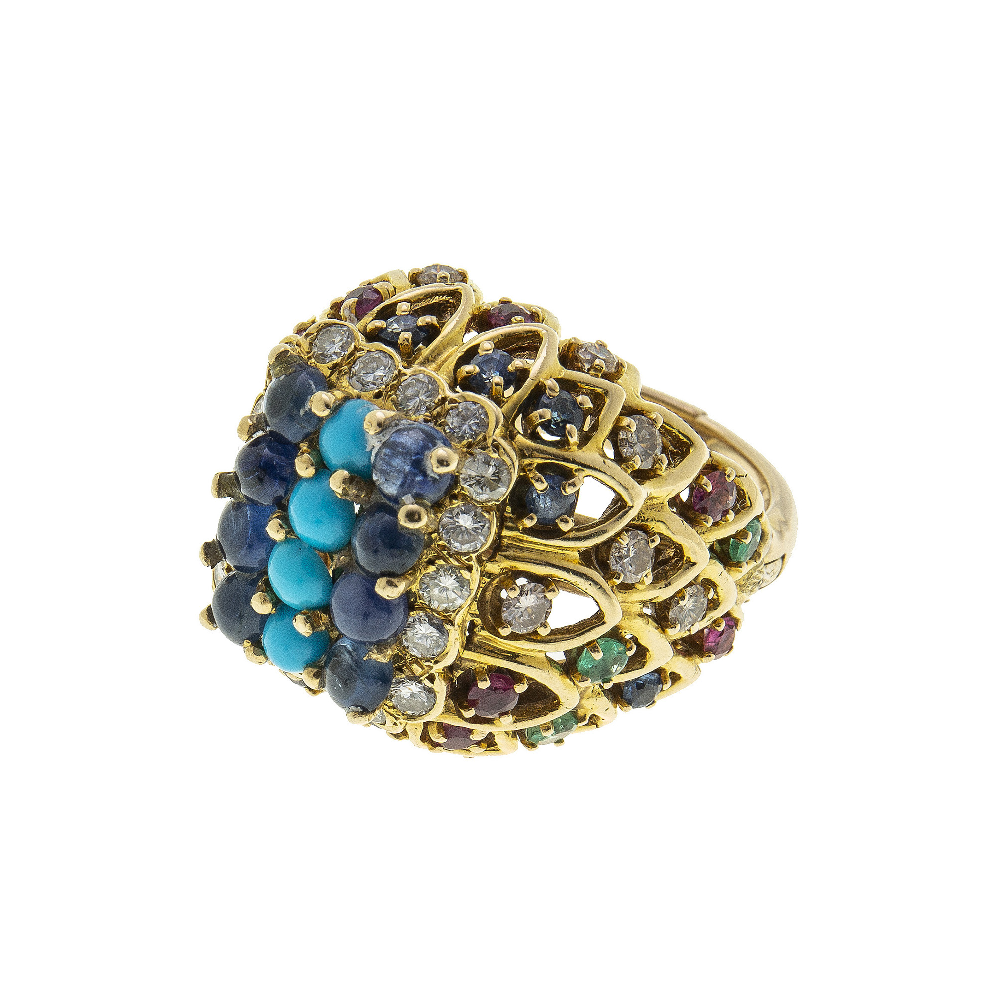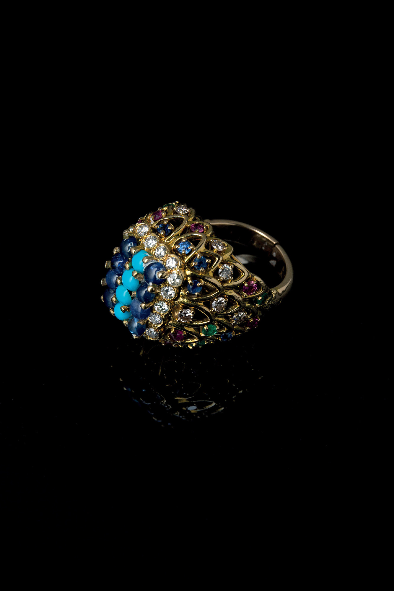 Anello a cupola in oro giallo 14 Kt con rubini, zaffiri, smeraldi e turchesi, tempestato di diamanti (1,10 ct). Il peso è di 24.30 gr Trattasi di un anello regolabile. Misura ITA 20 Misura USA 9
