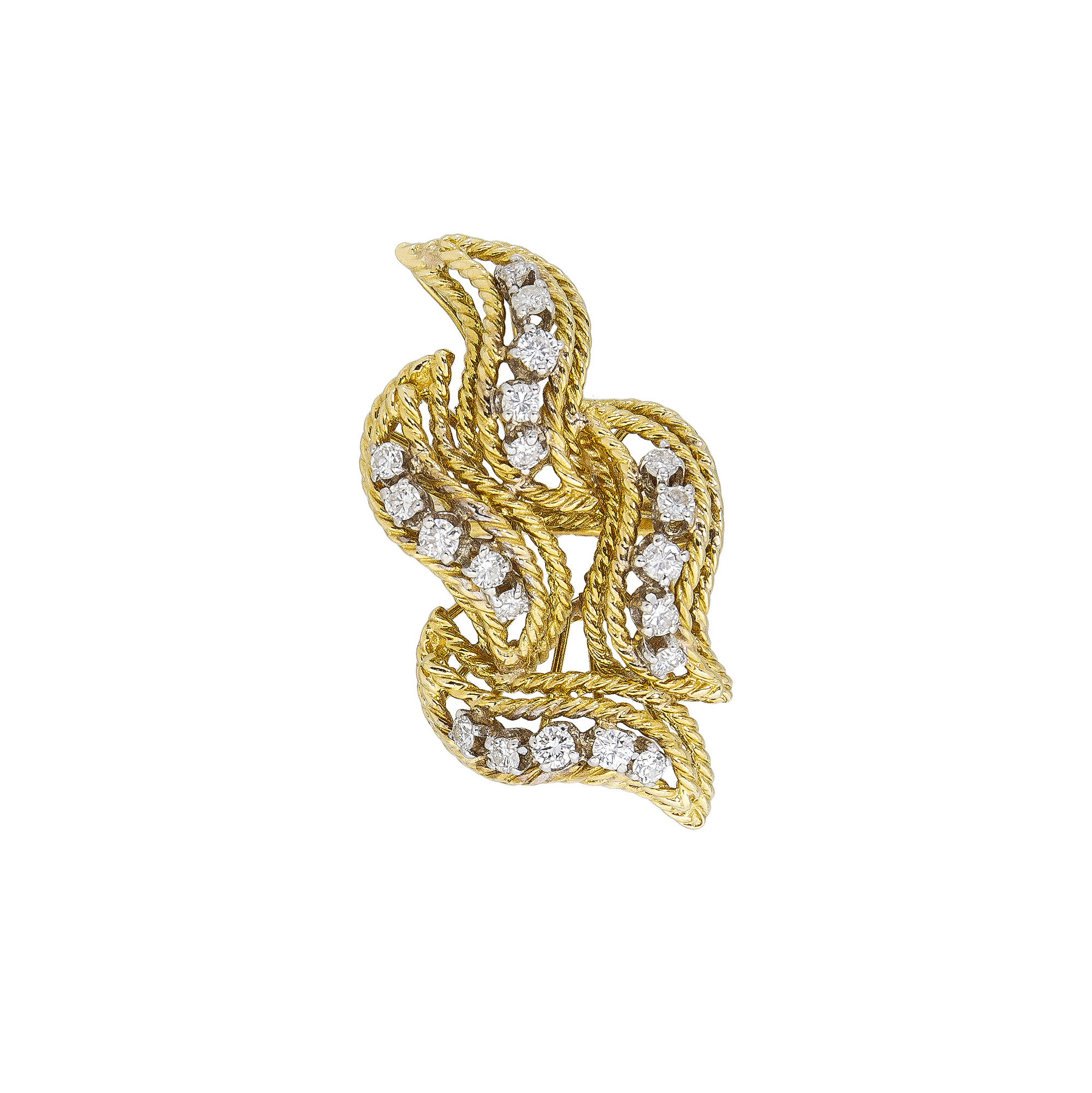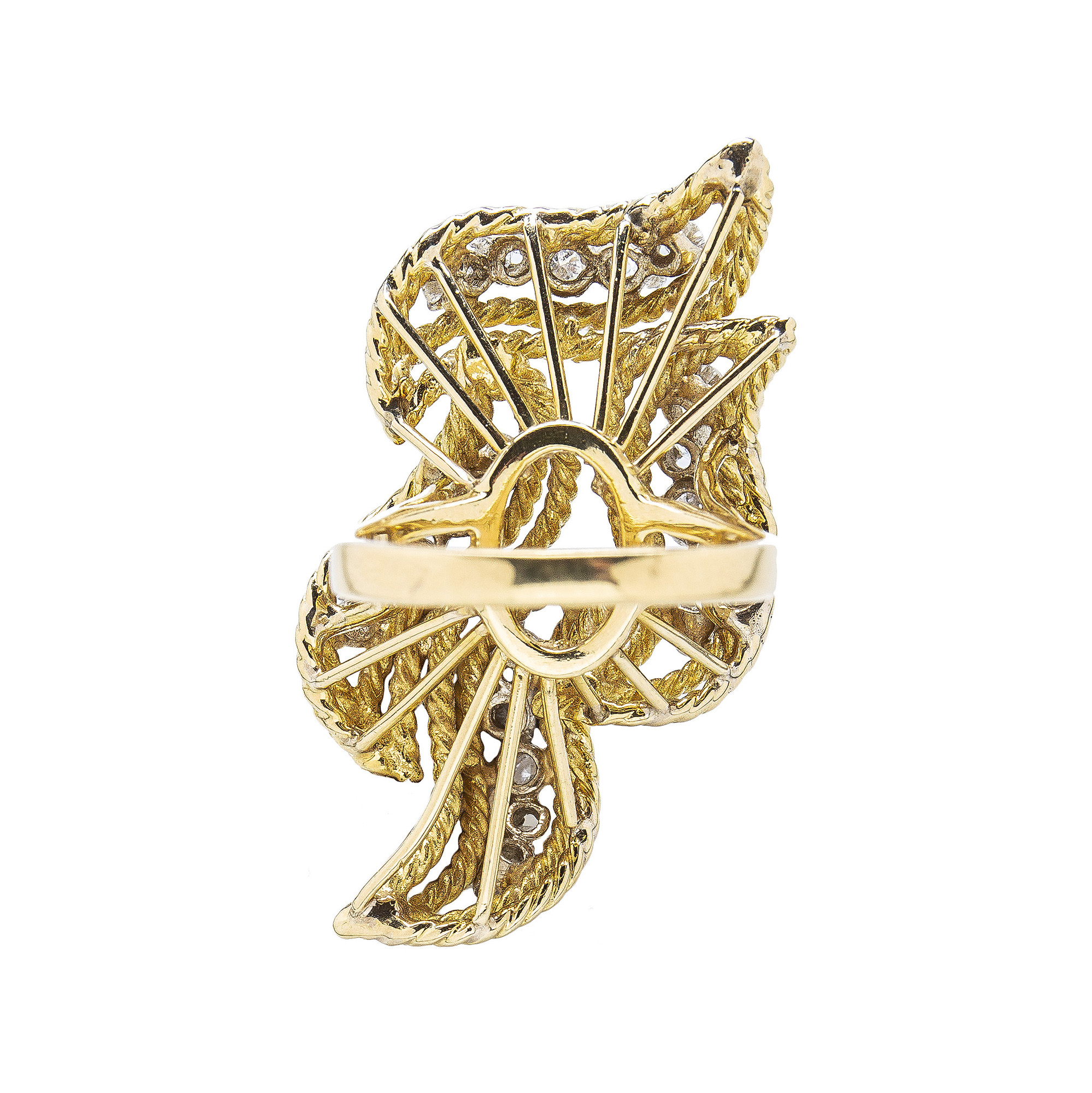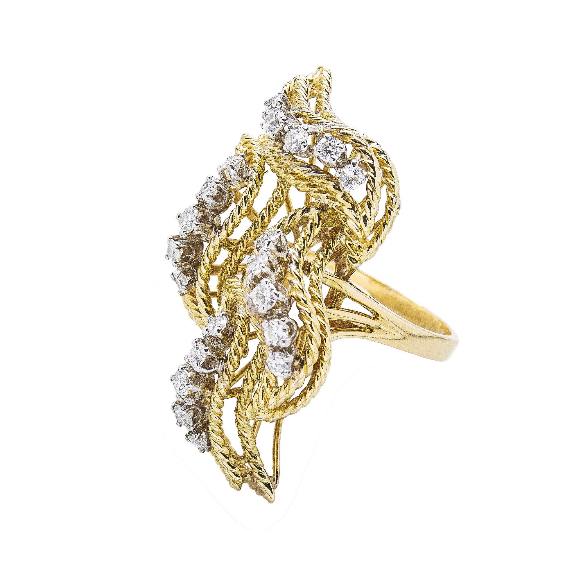 Anello, anni '60, in oro giallo 18 Kt con lavorazione a filo ritorto, decorato con diamanti (0,80 ct ca.) Il peso è di 13,50 gr. Misura ITA 12 Misura USA 6