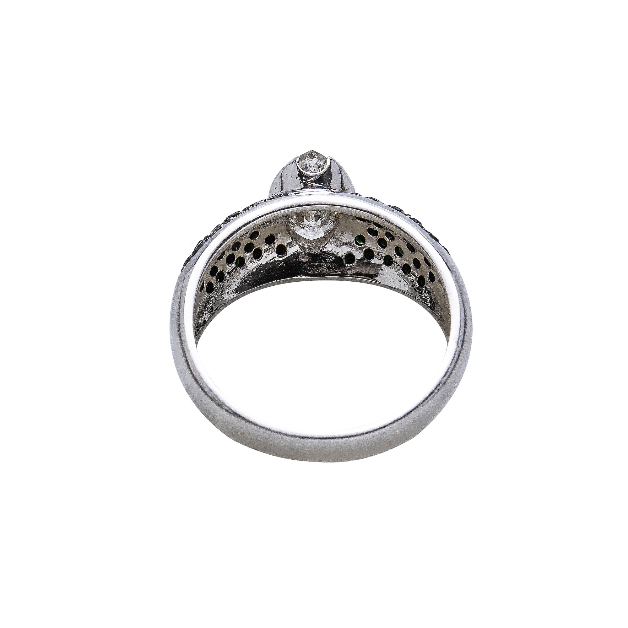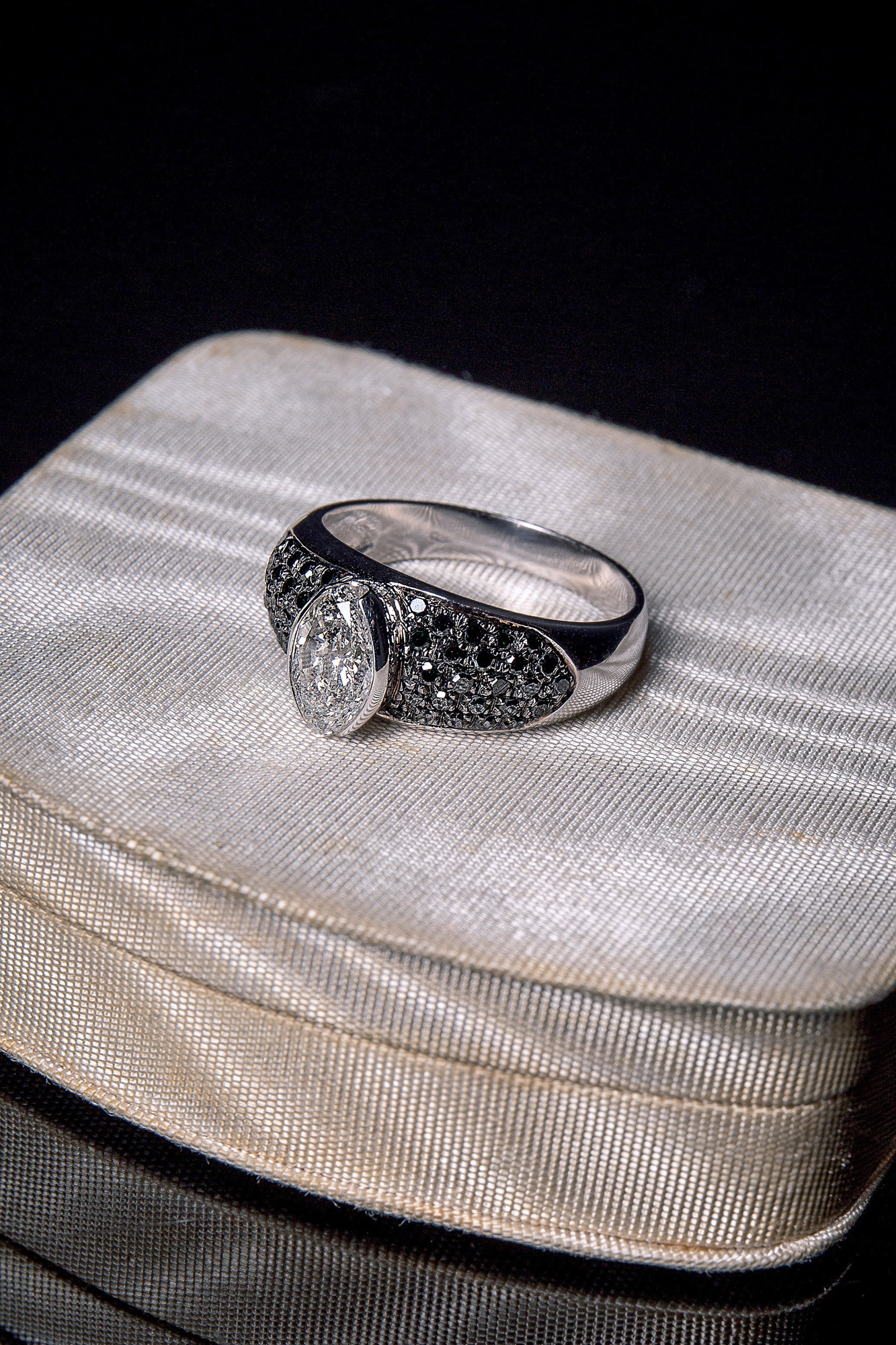Anello in oro bianco 18 Kt decorato con diamante centrale taglio navette ( 1 ct) e diamantini black. Il peso è di 6,70 gr. Misura ITA 10 Misura USA 22