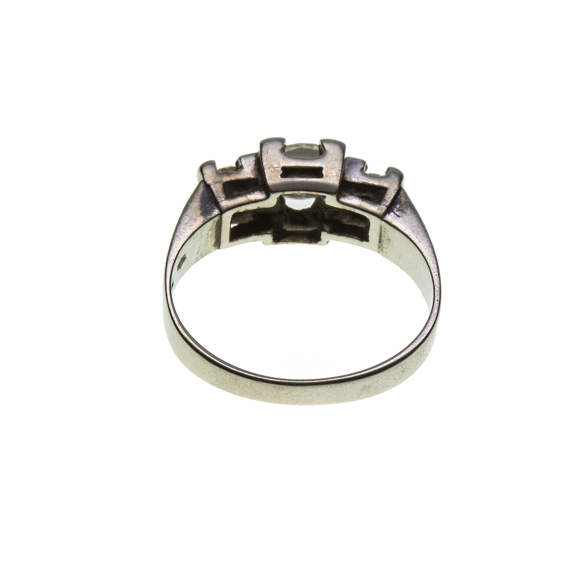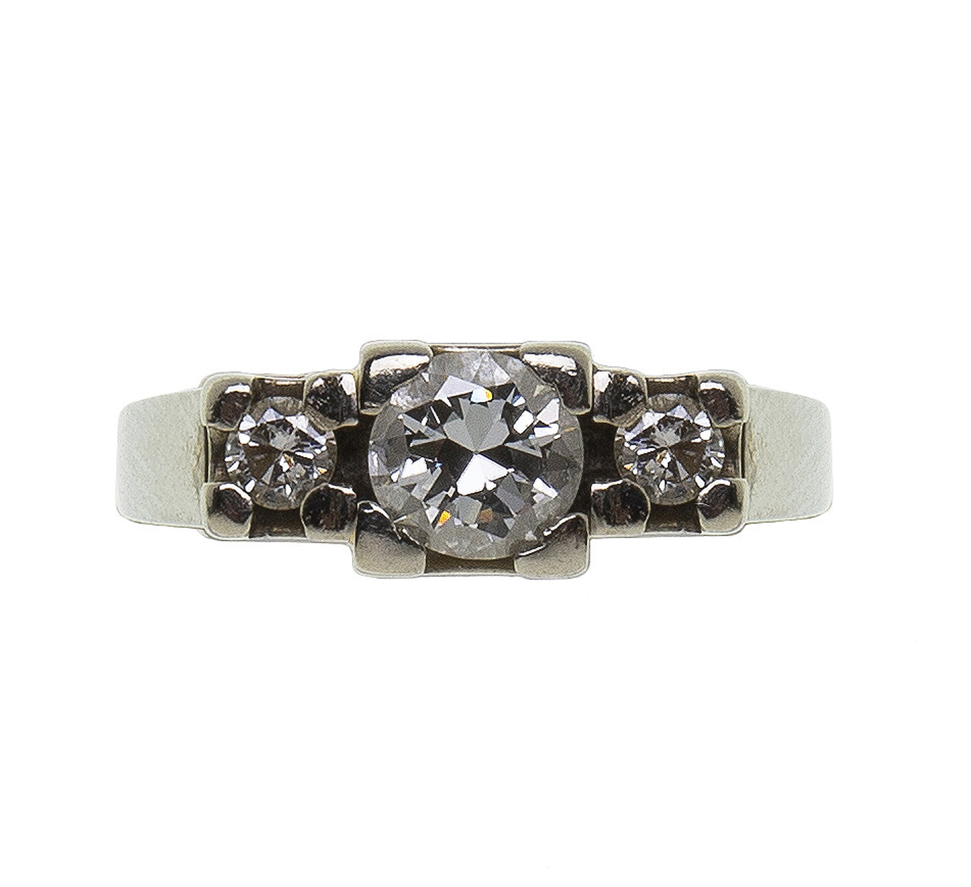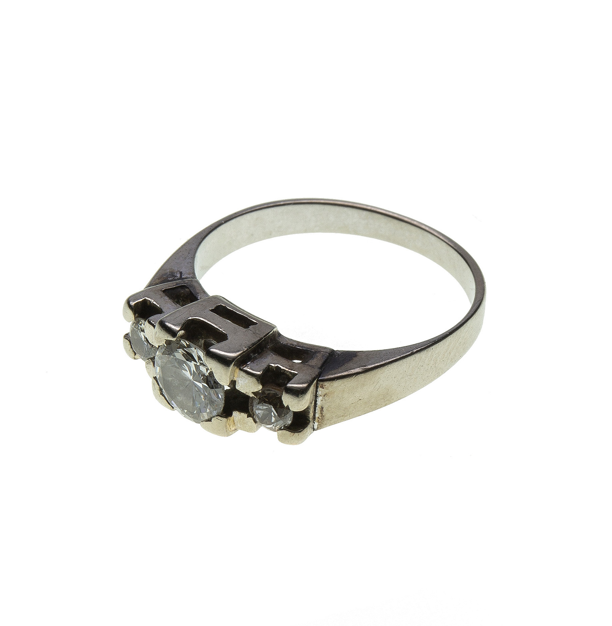 Anello in oro bianco 18 Kt impreziosito da un diamante centrale (0,45 ct) e due laterali (0,5 ct). Il peso è 3,90 gr. Misura ITA 10 Misura USA 5 1/2