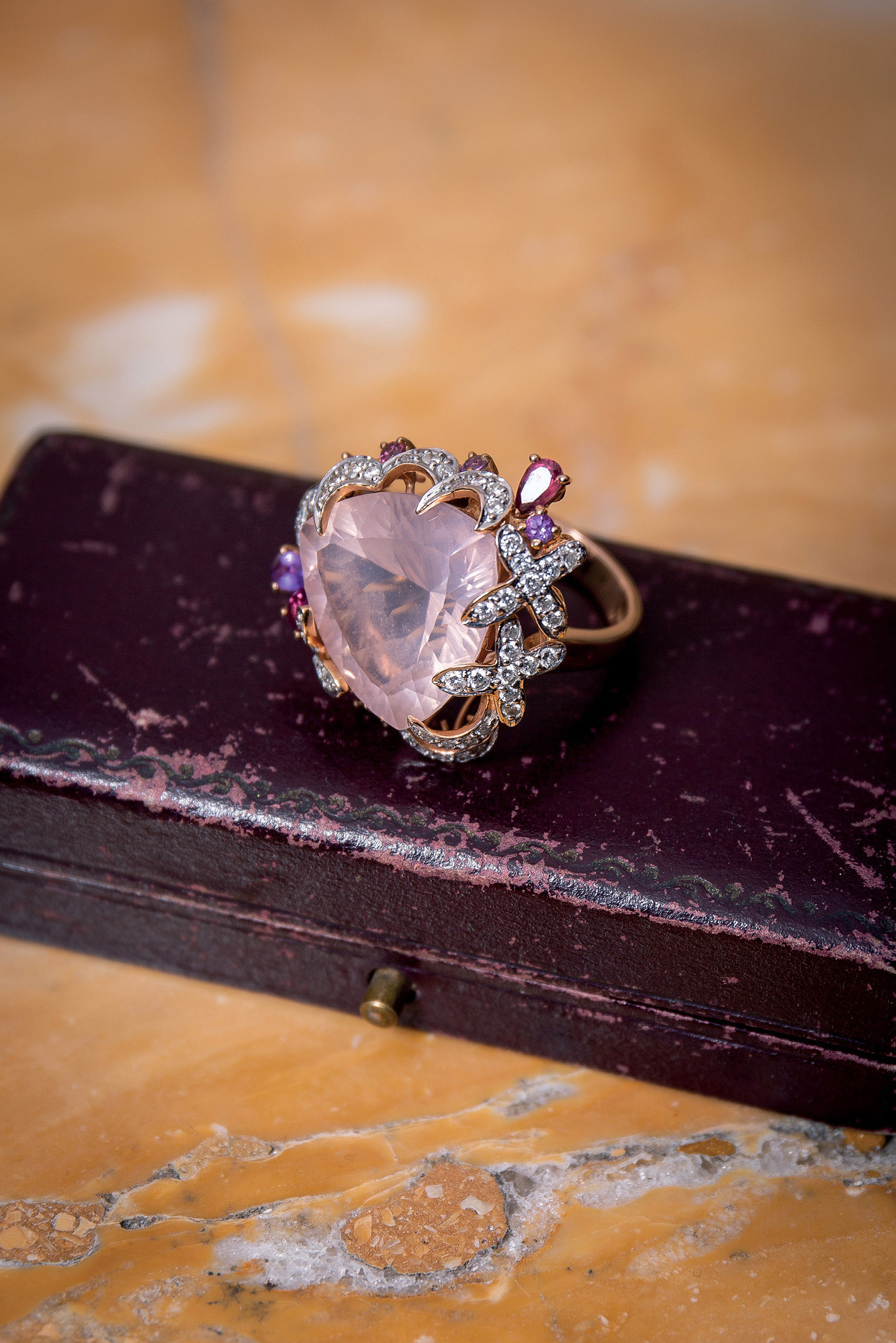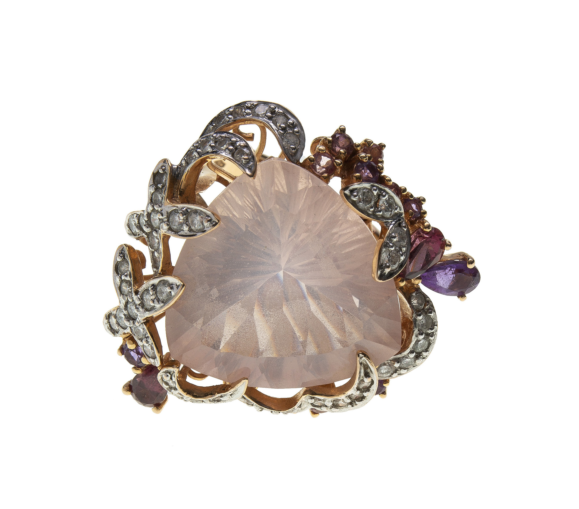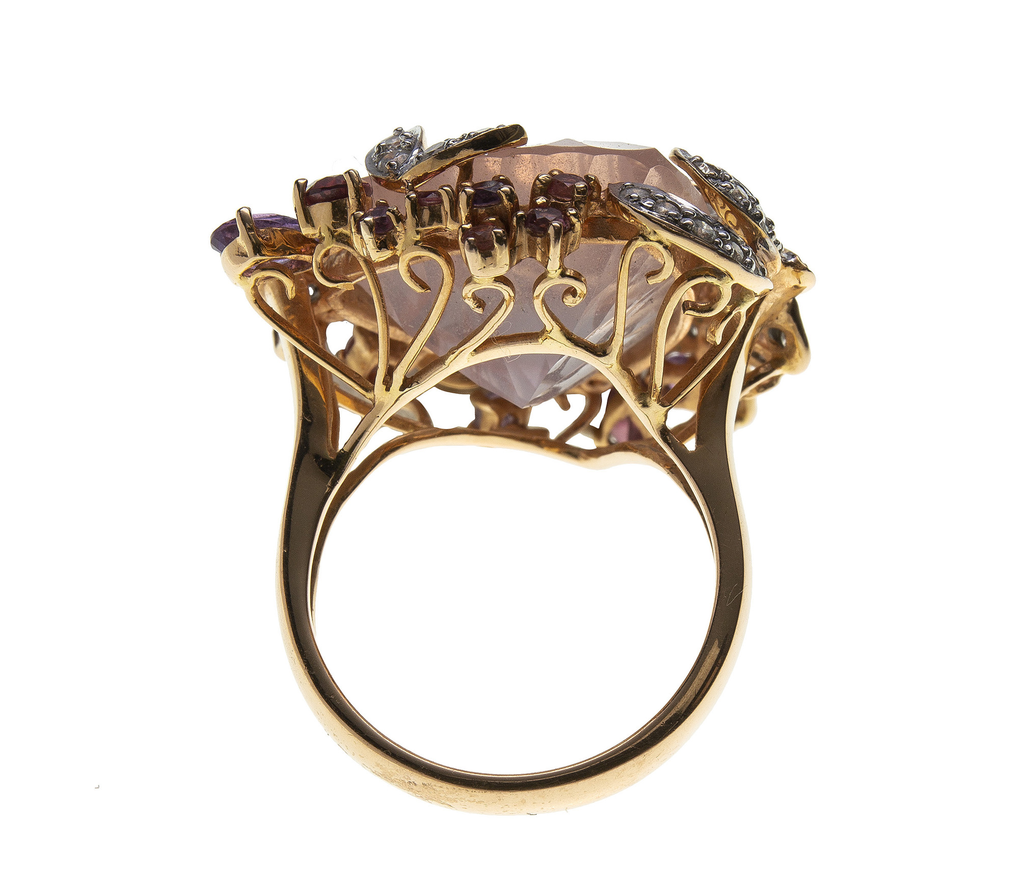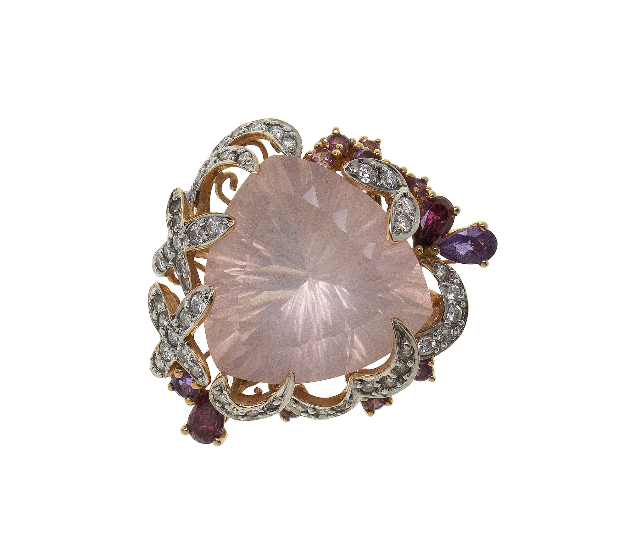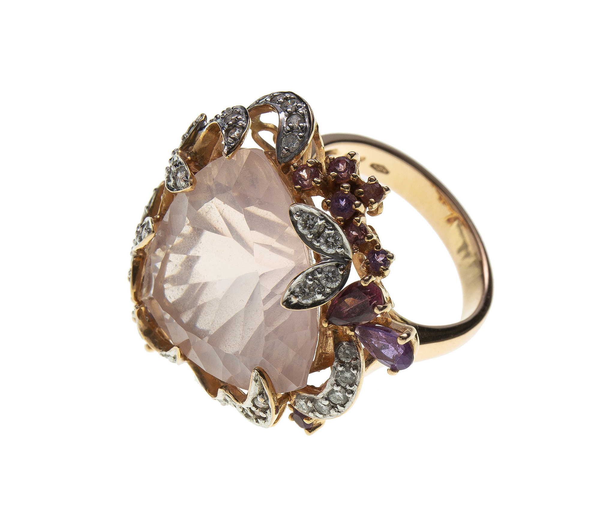 Anello in oro rosa 18 Kt impreziosito da un grande quarzo rosa (17,7 ct) contornato da diamanti, quarzi e ametista. Il peso è di 12,10 gr. Misura ITA 7 Misura USA 14