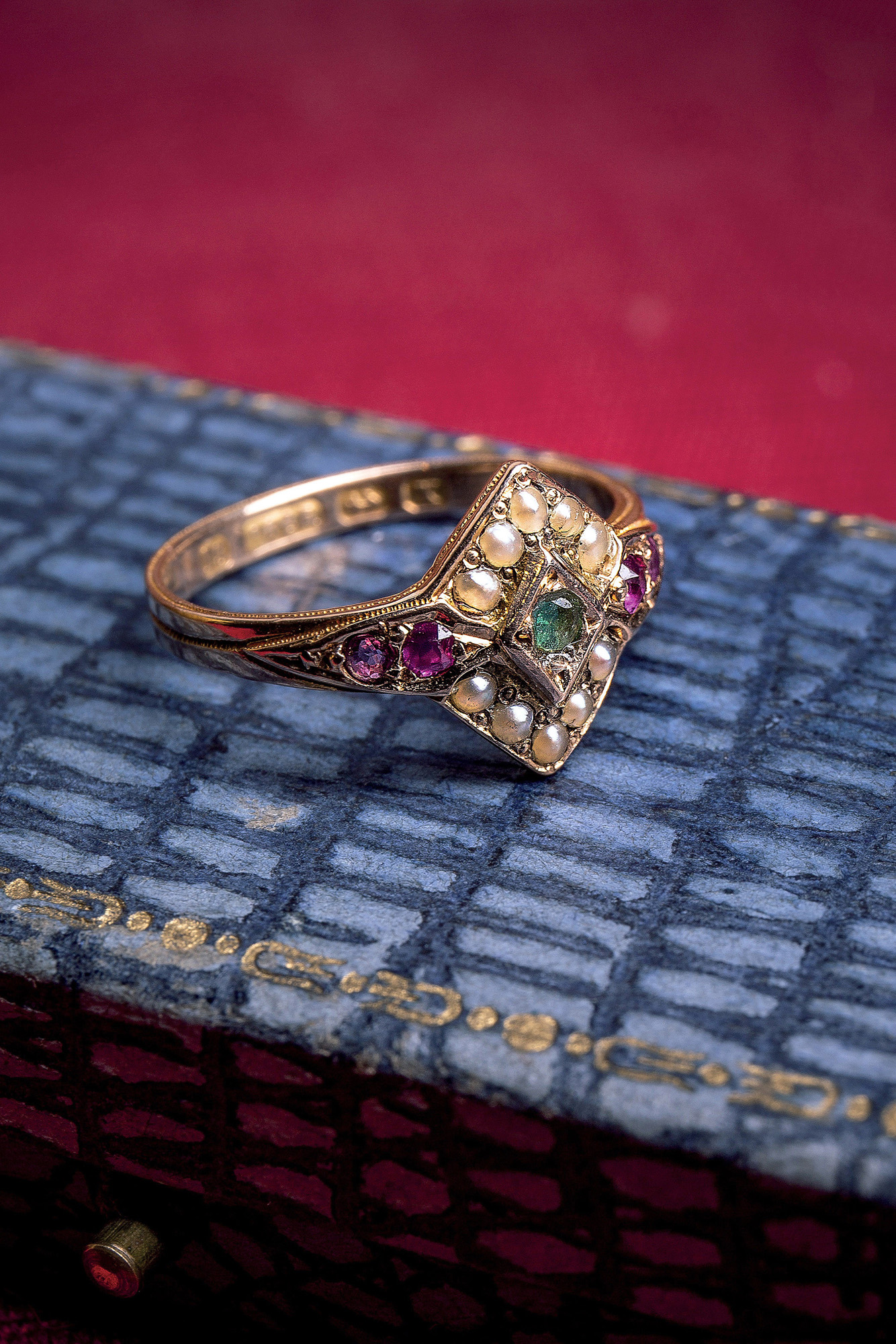 Anello vittoriano in oro 15 Kt decorato con un piccolo smeraldo, rubini e microperle. Il peso è di 2,72 gr Misura ITA 13 Misura USA 6 1/2