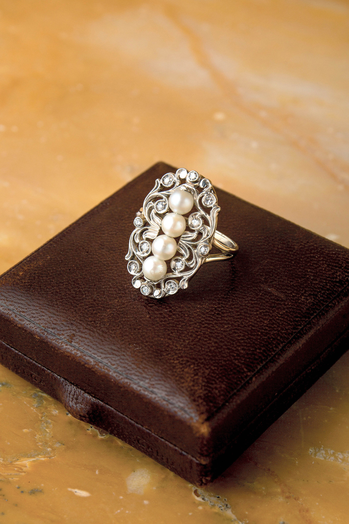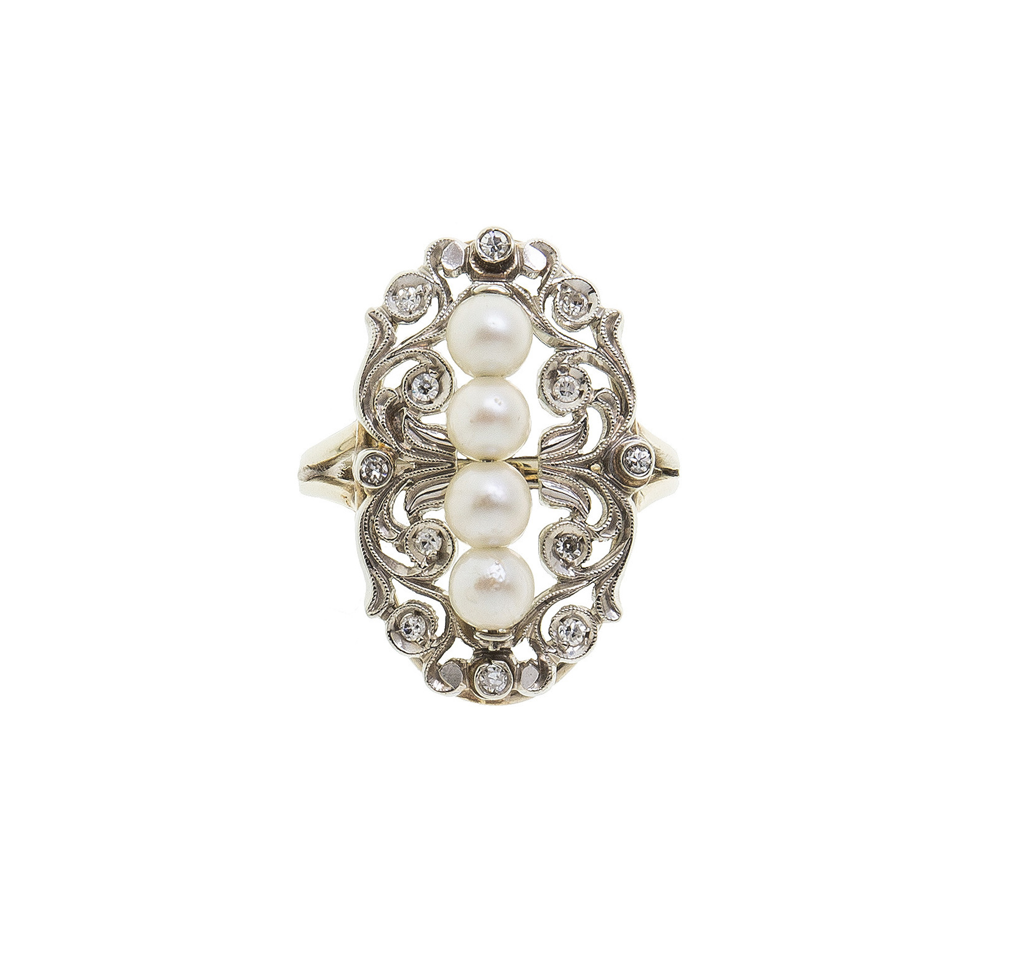 Anello Edoardiano in oro 18 Kt con diamanti e perle