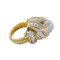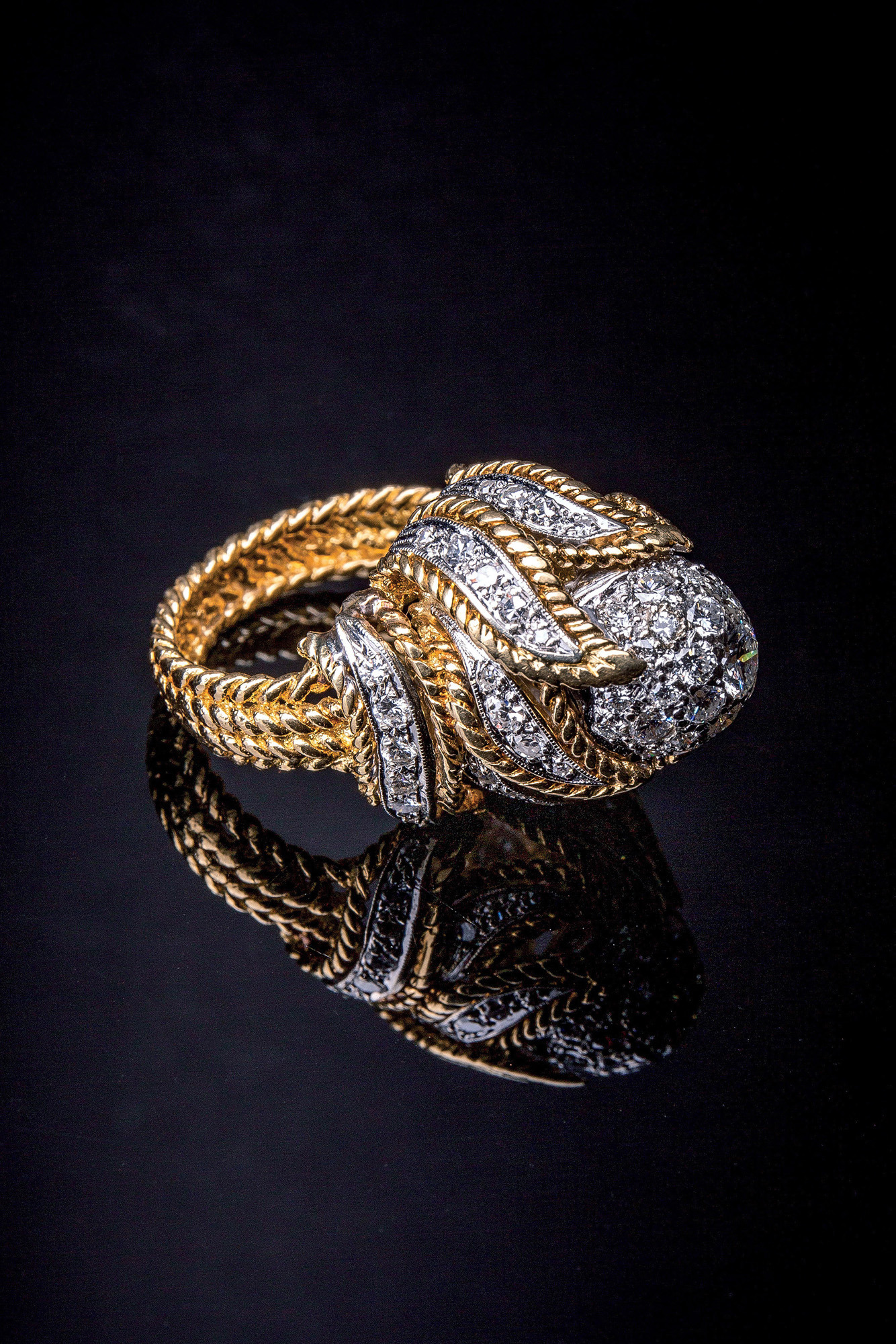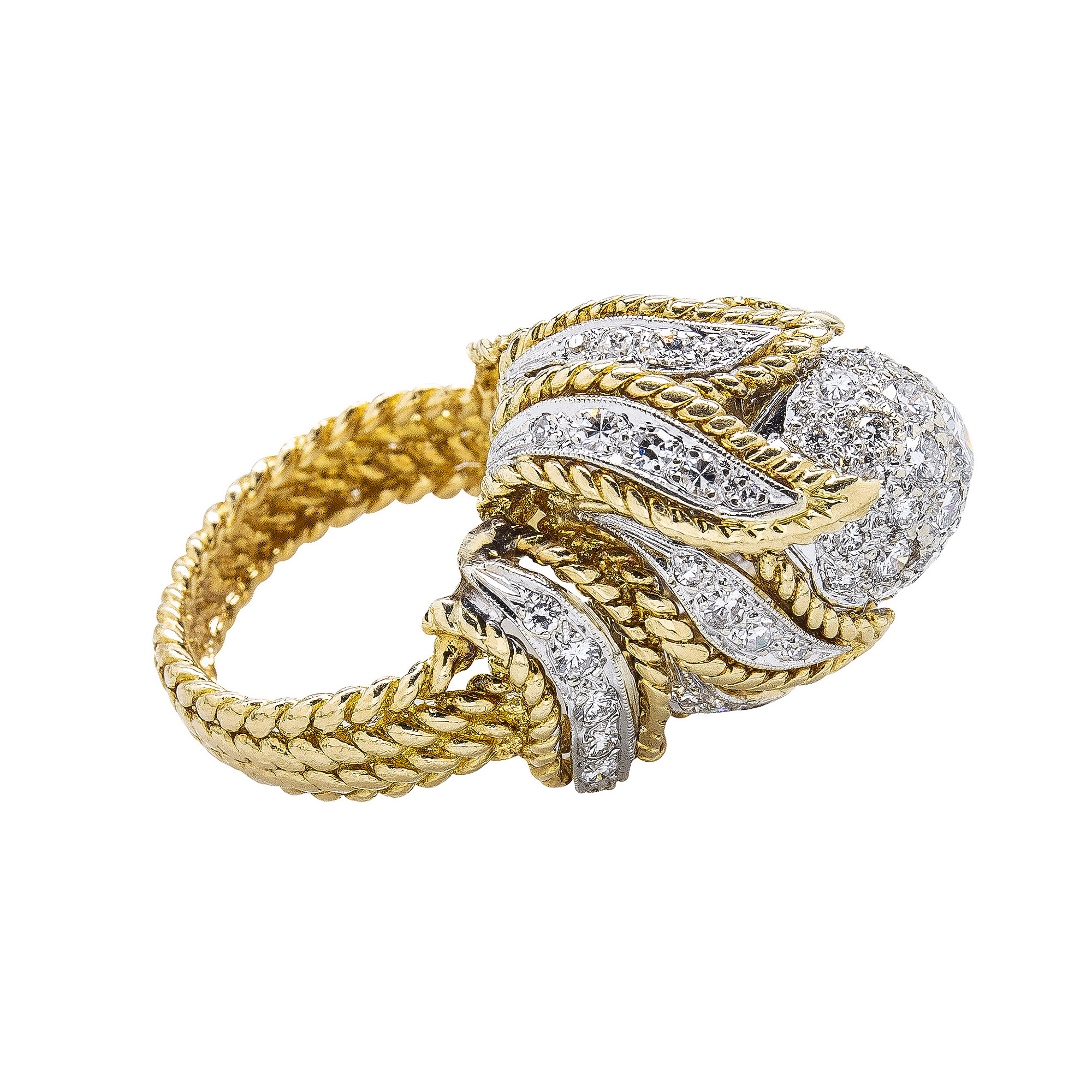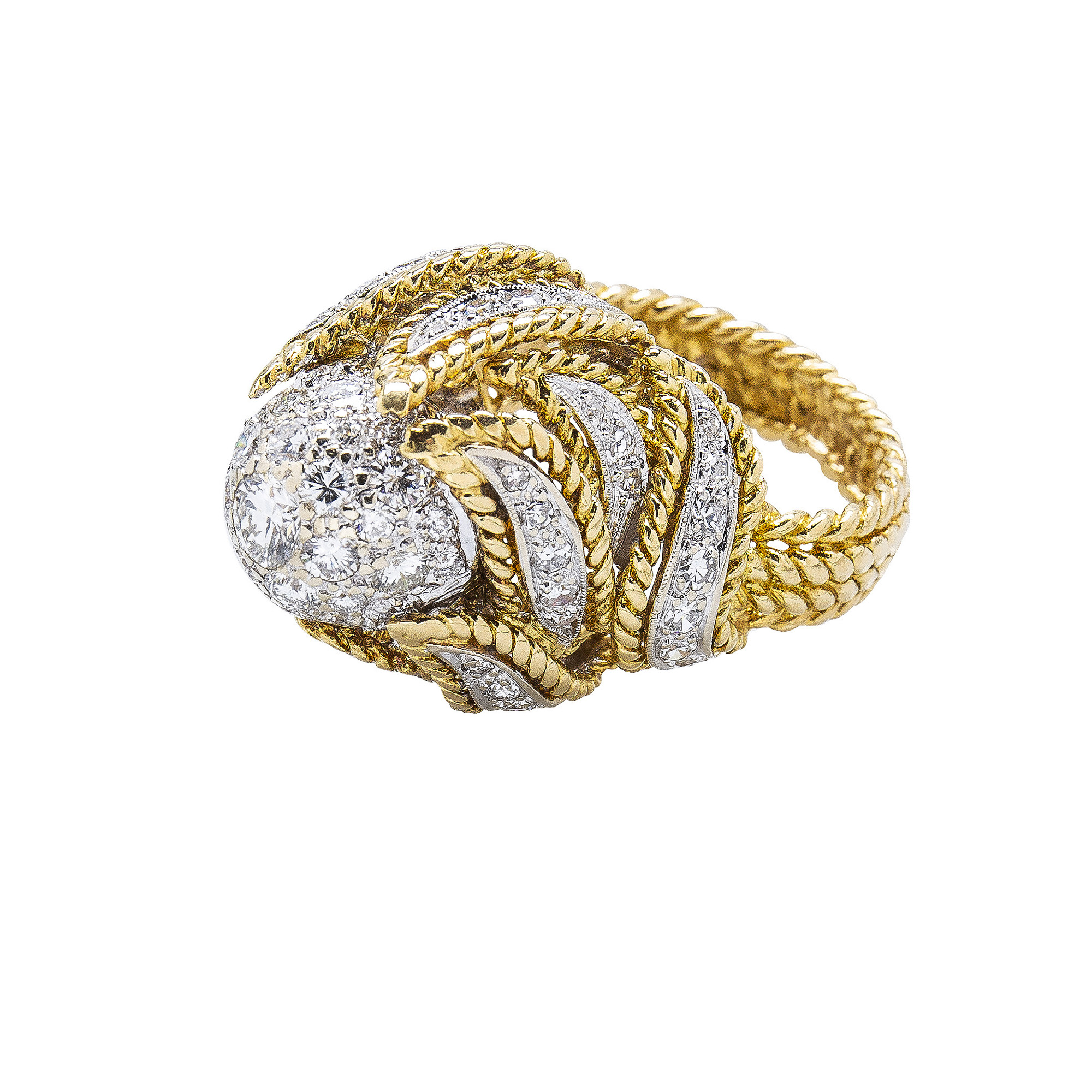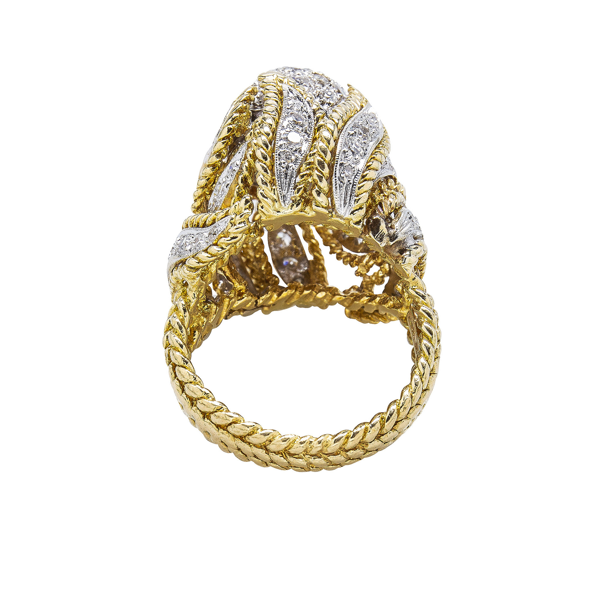 Anello in oro giallo 18 Kt realizzato a cupola con motivo floreale impreziosita da diamanti (1,5 ct ca). La lavorazione è a filo ritorto. Il peso è di 16,80 gr. Misura ITA 13 Misura USA 6,5